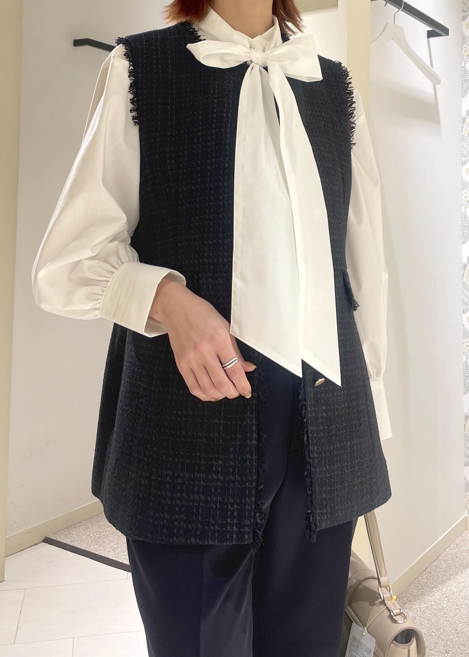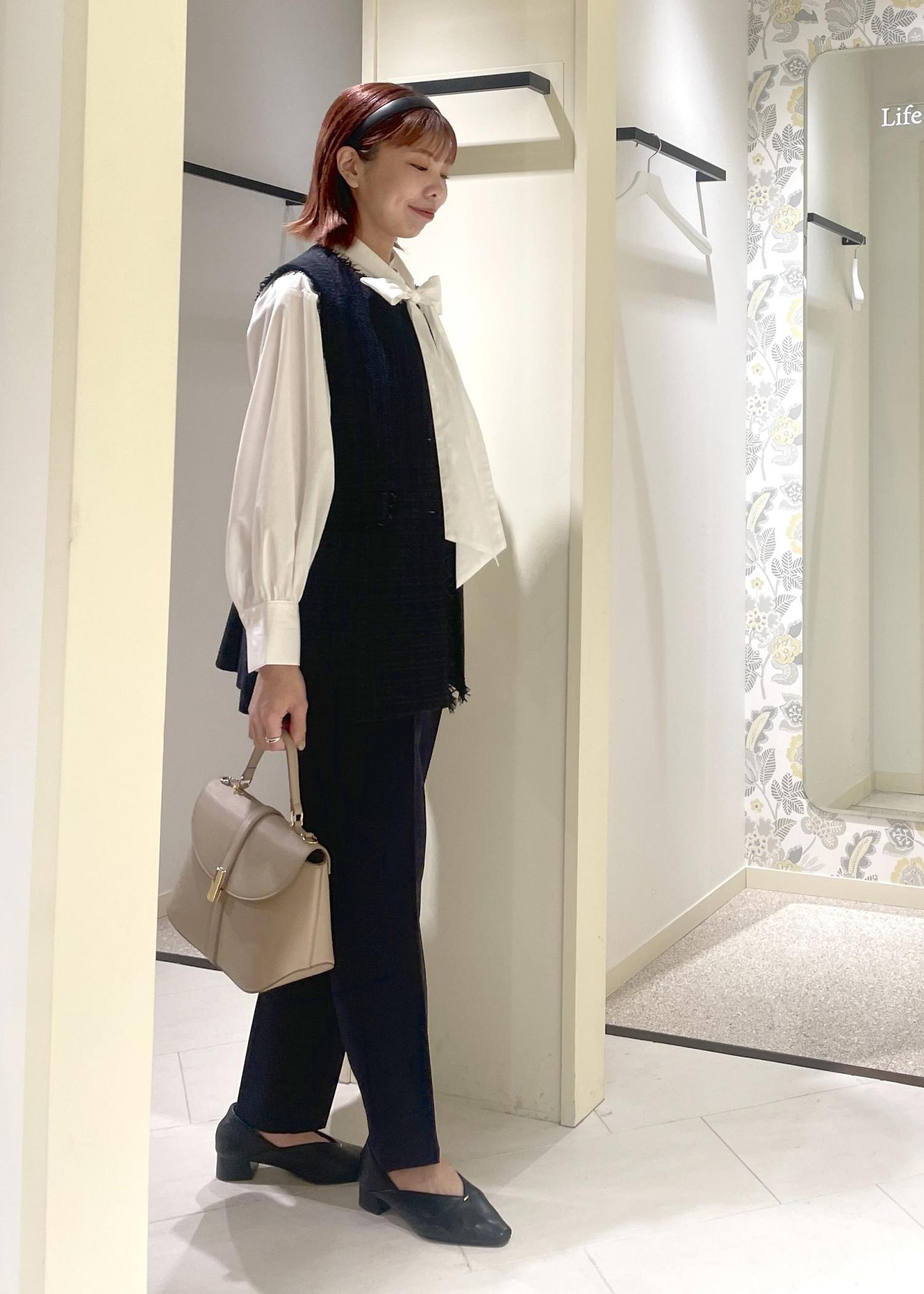 白のボウタイリボンブラウスを合わせて顔まわりに華やかさをプラス