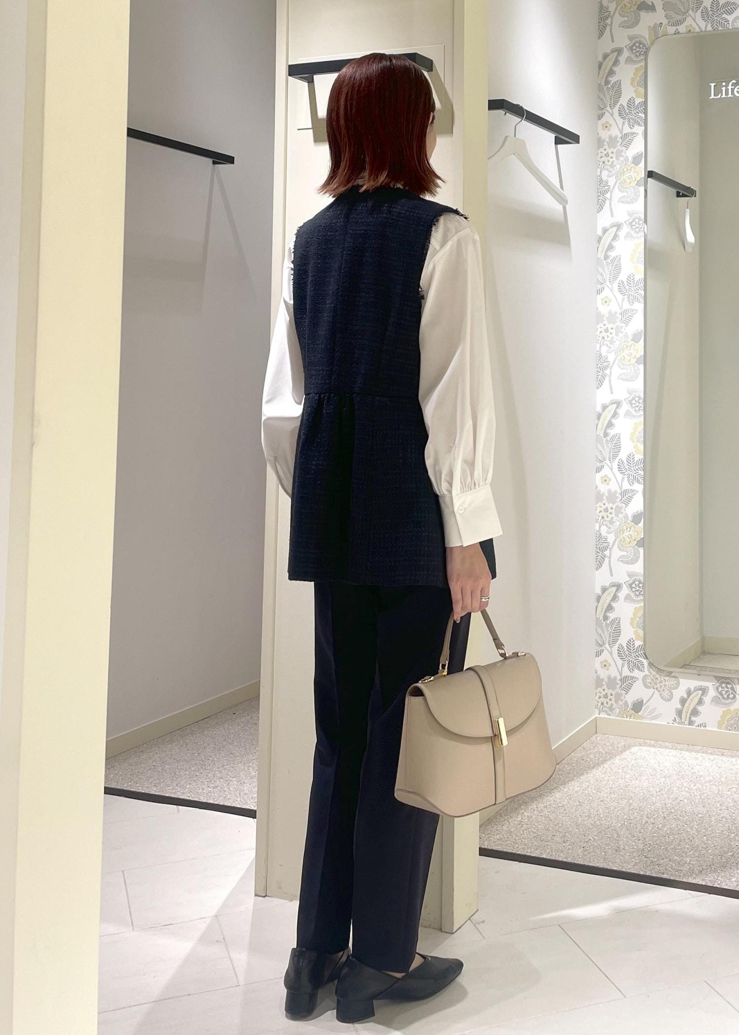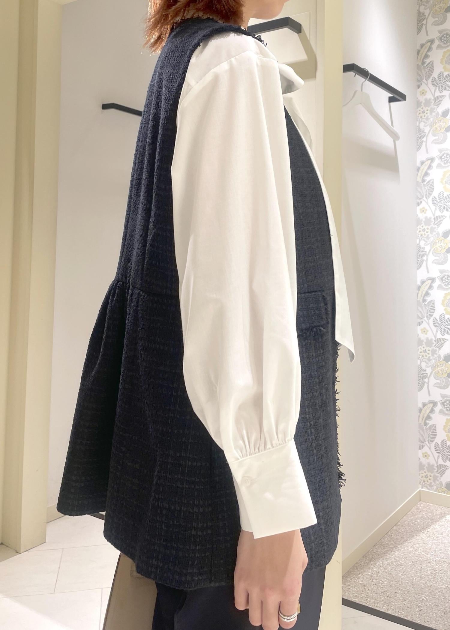袖口を少したくし上げて袖のボリュームをつくって着て頂くのも手首まわりがすっきりと見え抜け感+女性らしい印象に◎