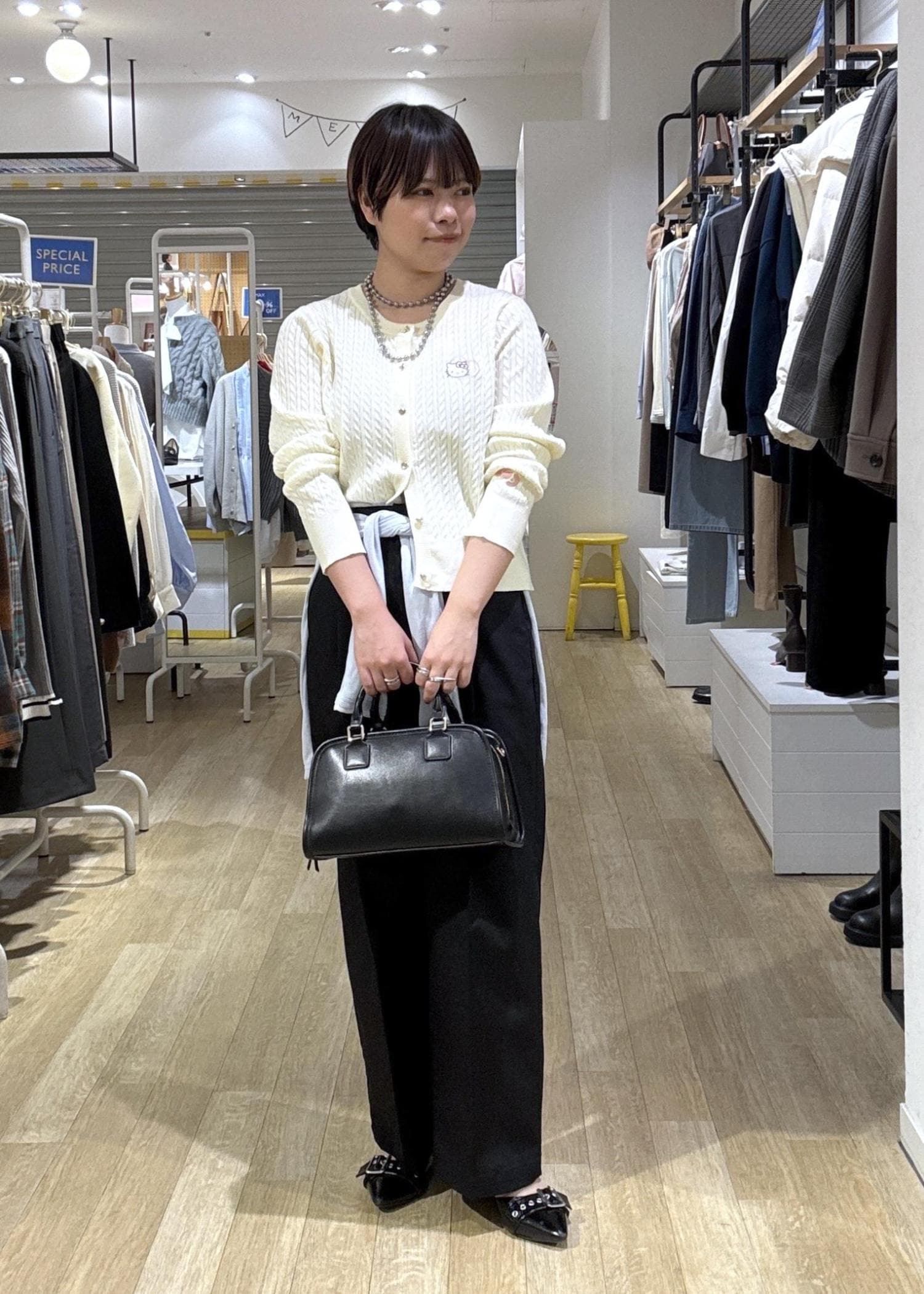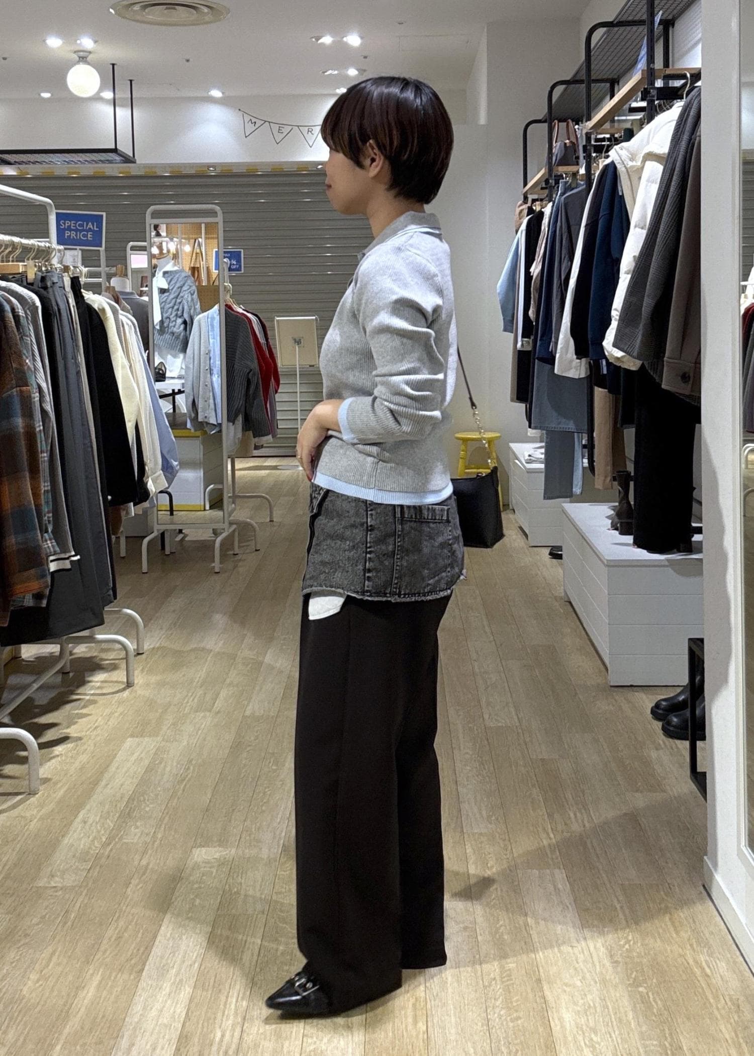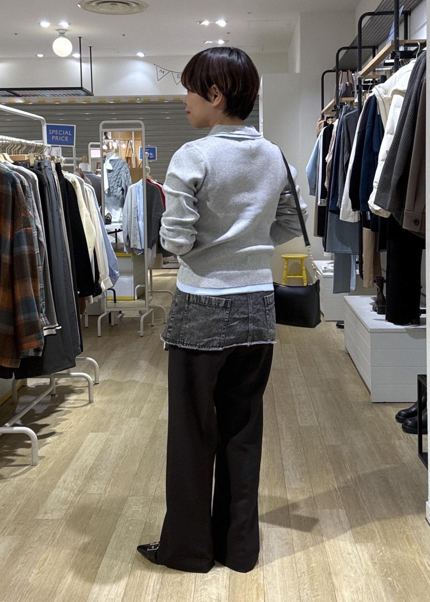 インではなくあえてアウトで着ることで、レイヤード感をだしたのがポイントです。