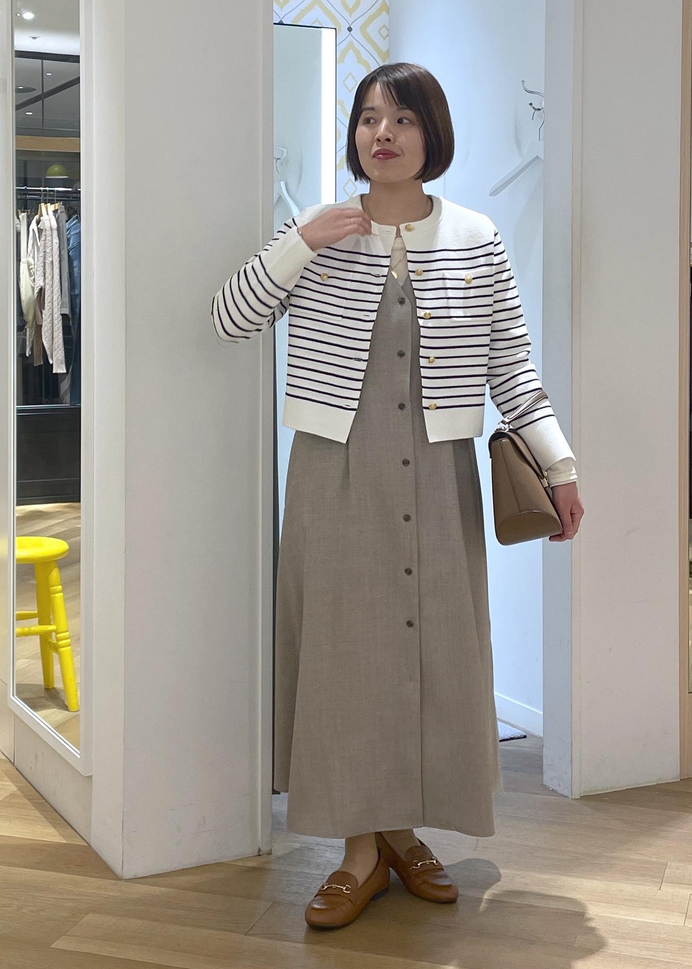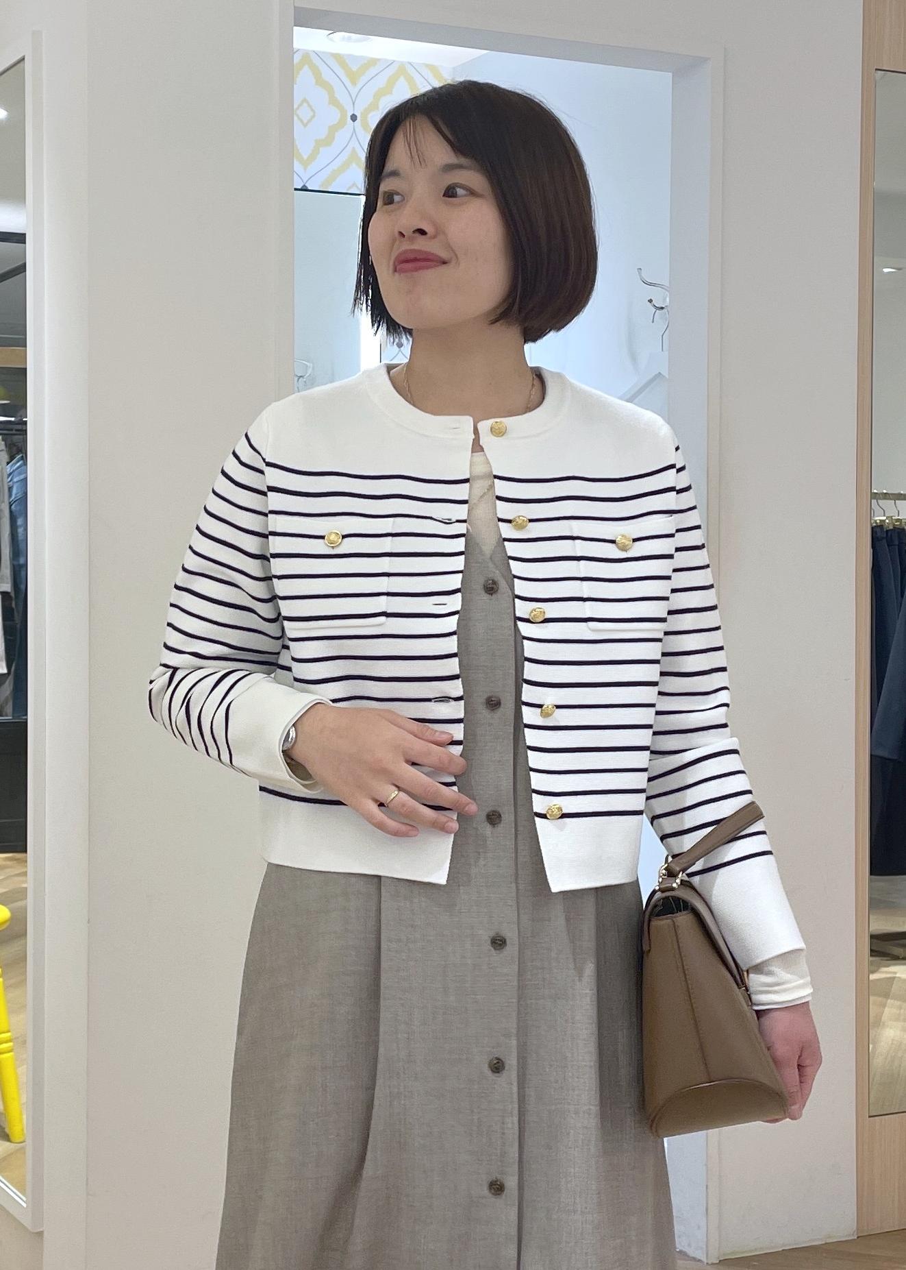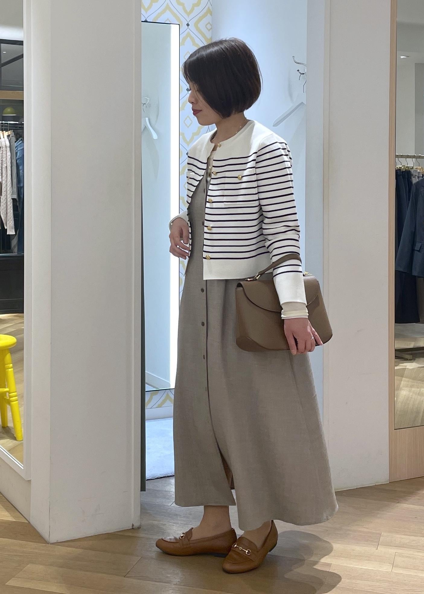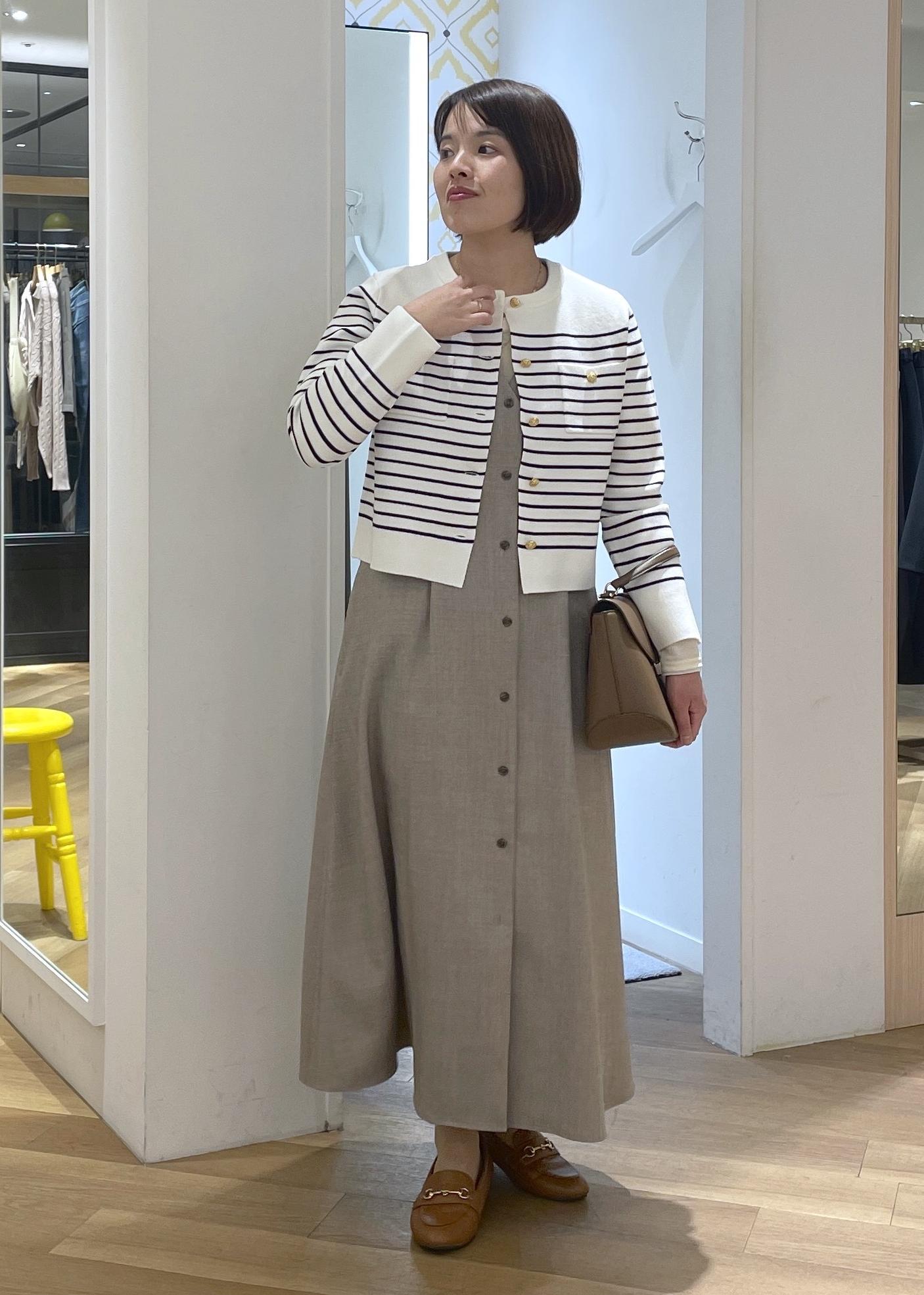 フレンチシックなボーダーに金釦カーディガンに、きれいめジャンパースカートを合わせた大人カジュアルコーデです!