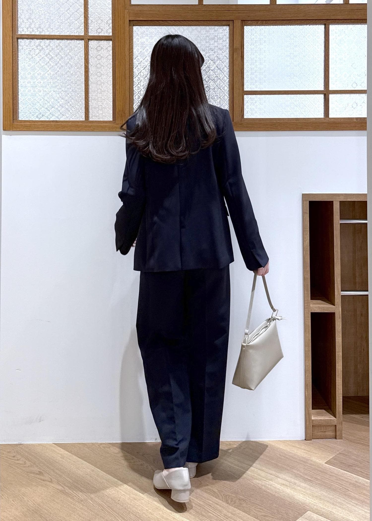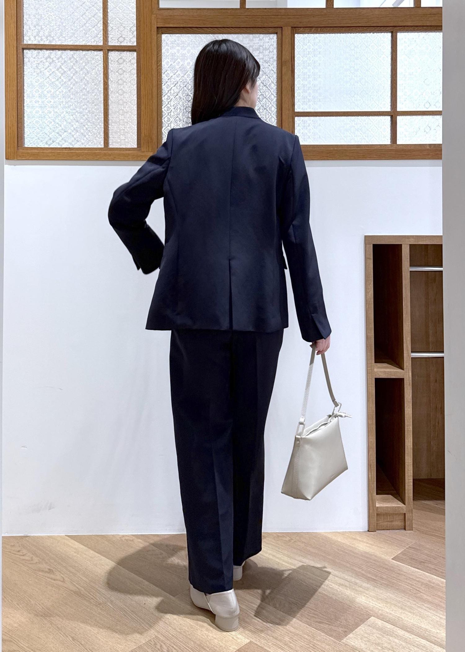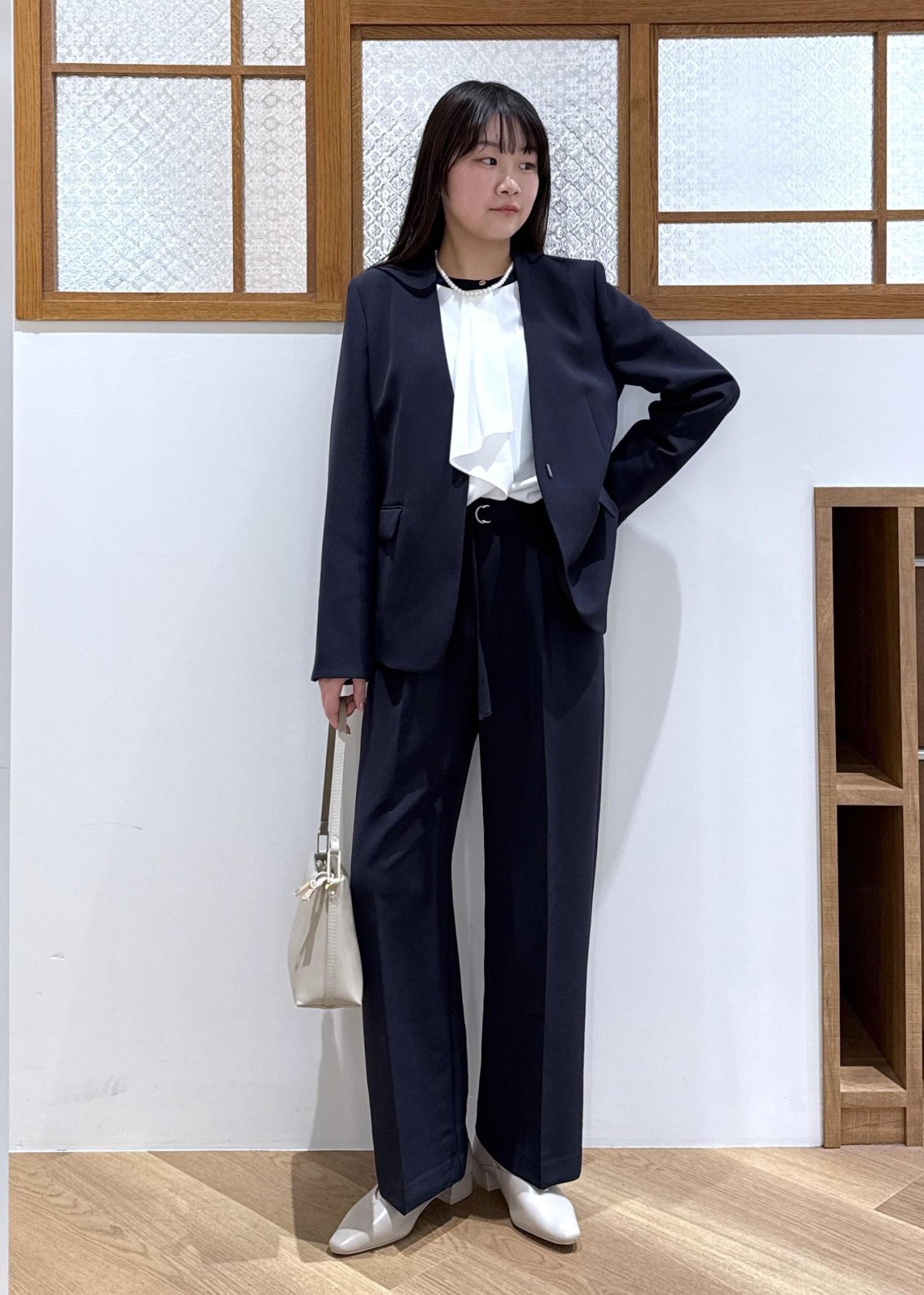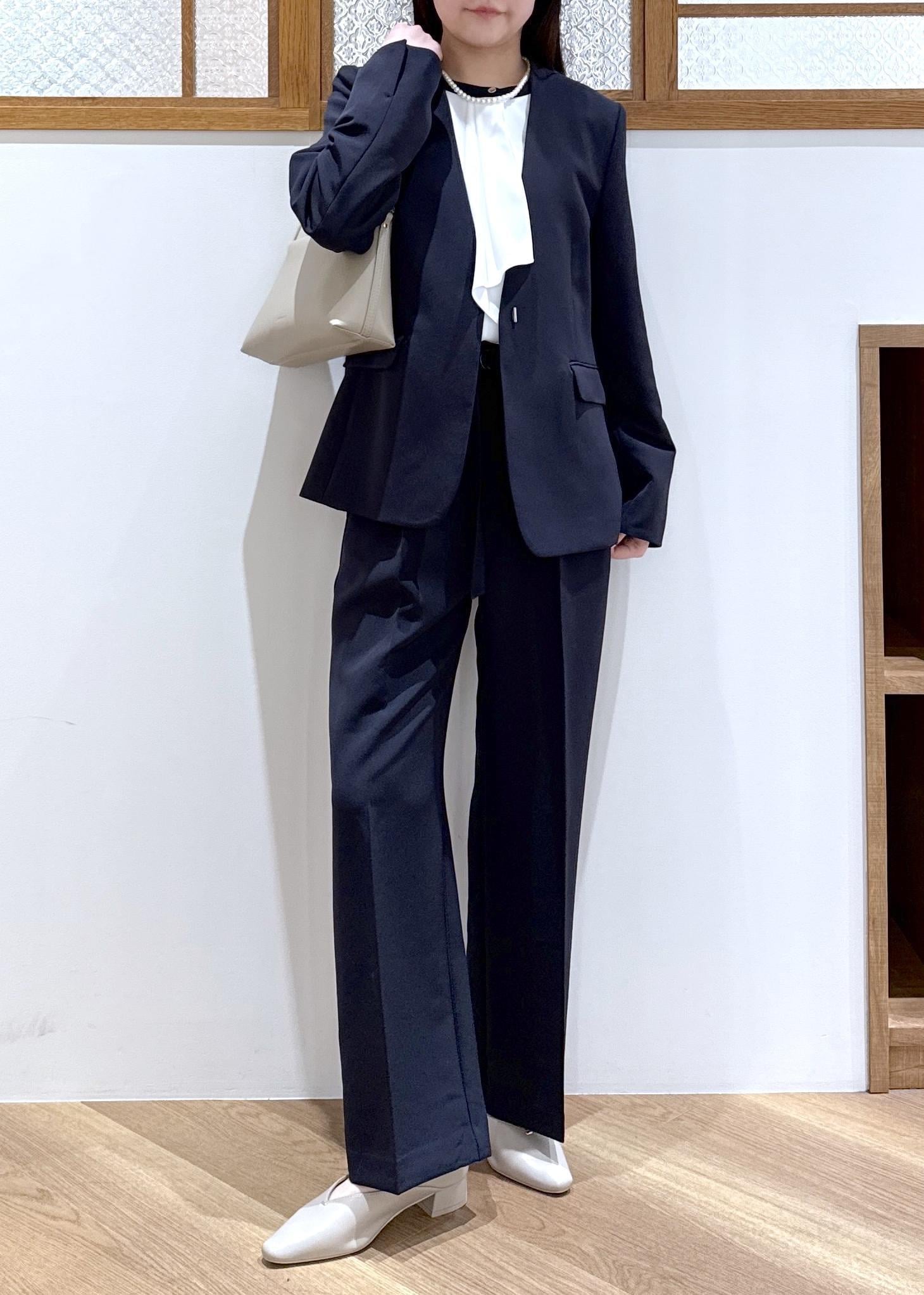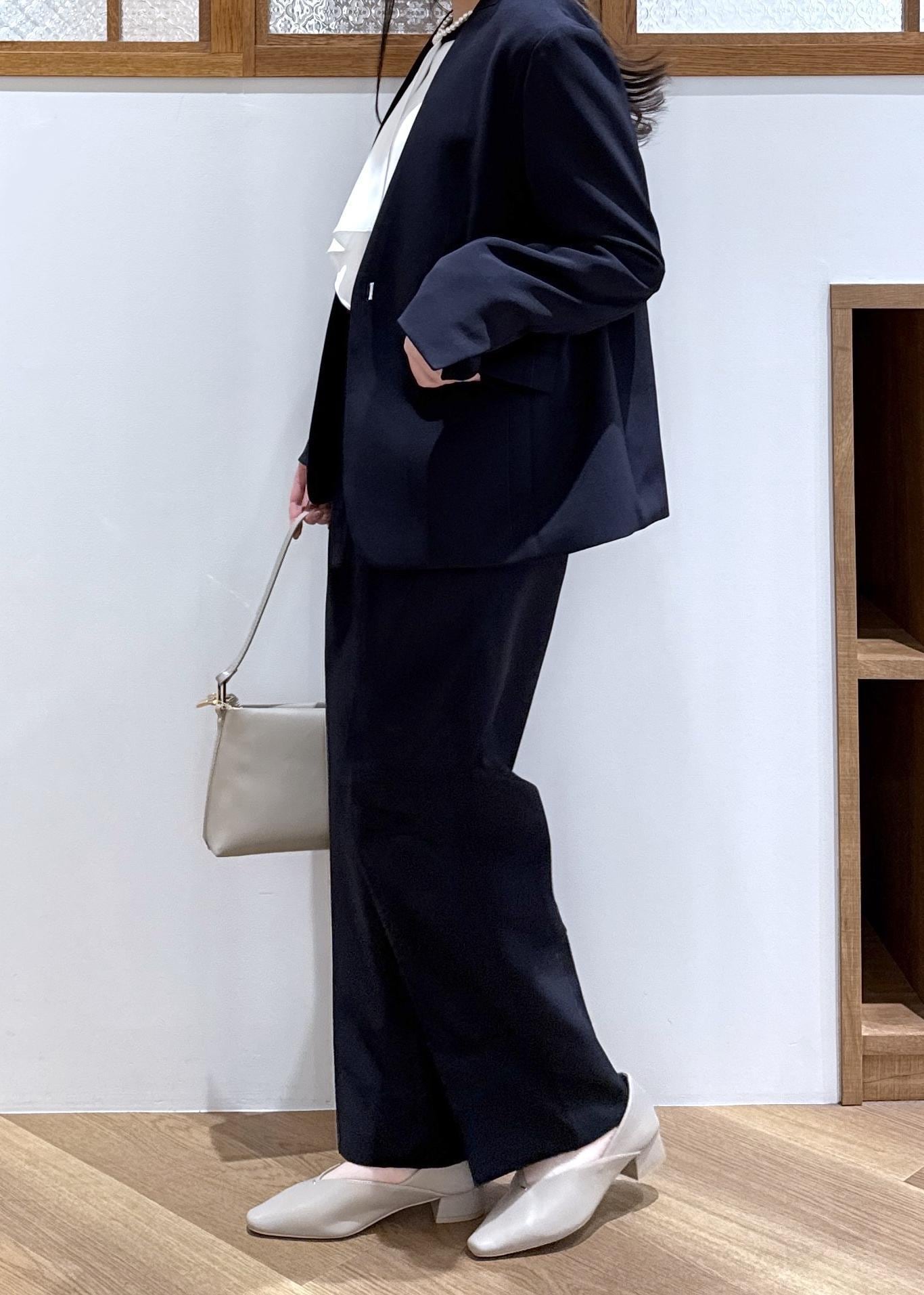 ネイビーのジャケットとパンツを合わせ、セットアップ風に着た統一感のあるコーディネートです。