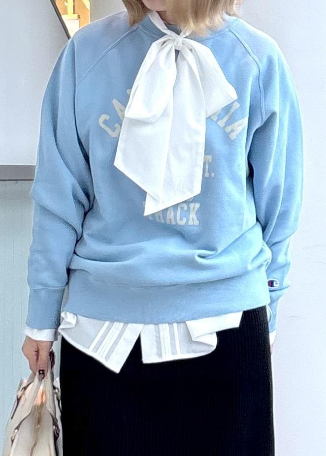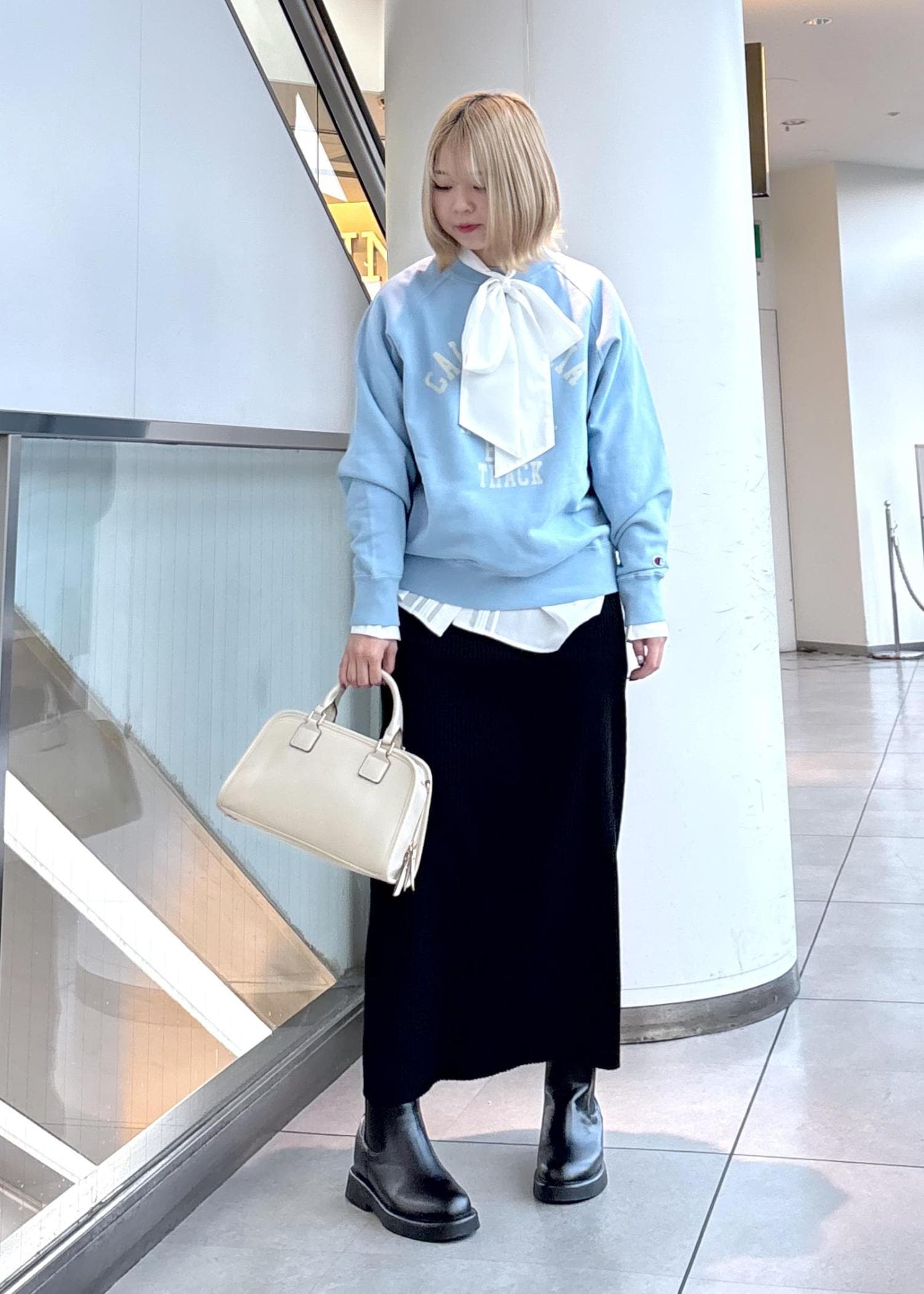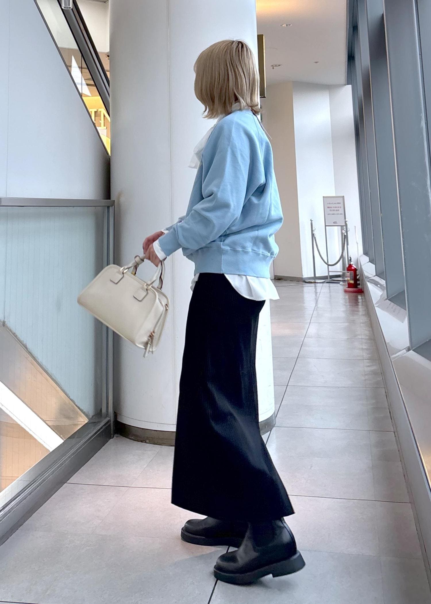 春らしいブルーのスウェットを使用した、カジュアルすぎないお出かけコーデにしてみました☺︎
