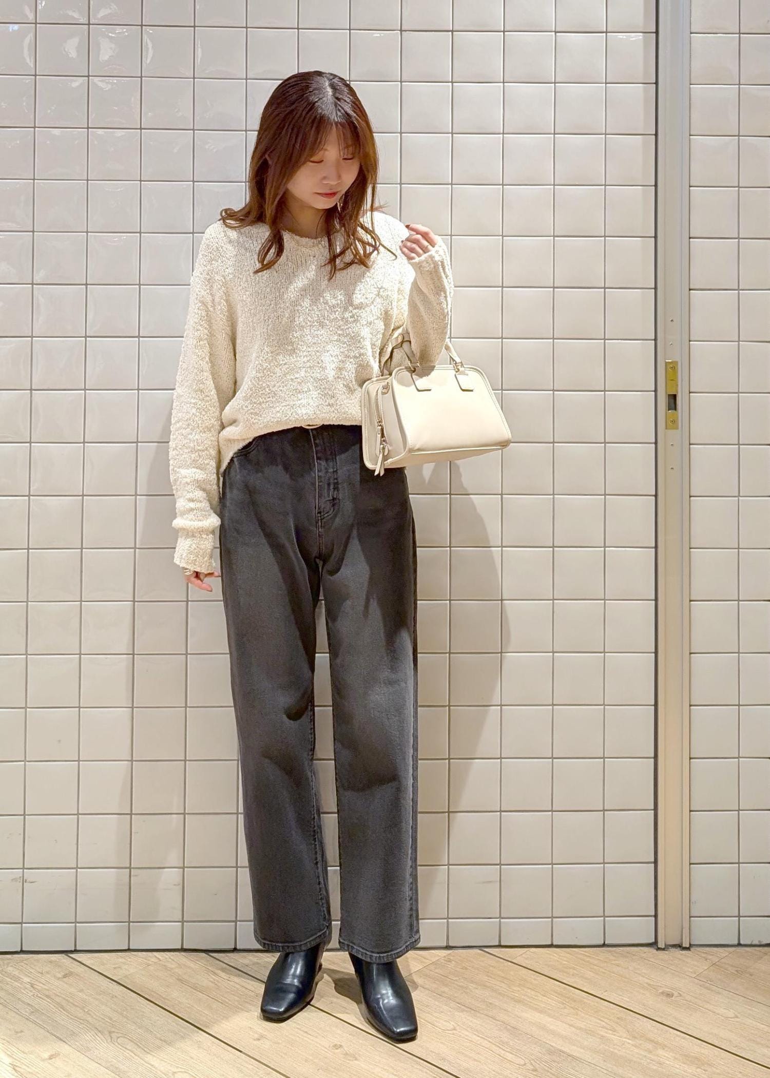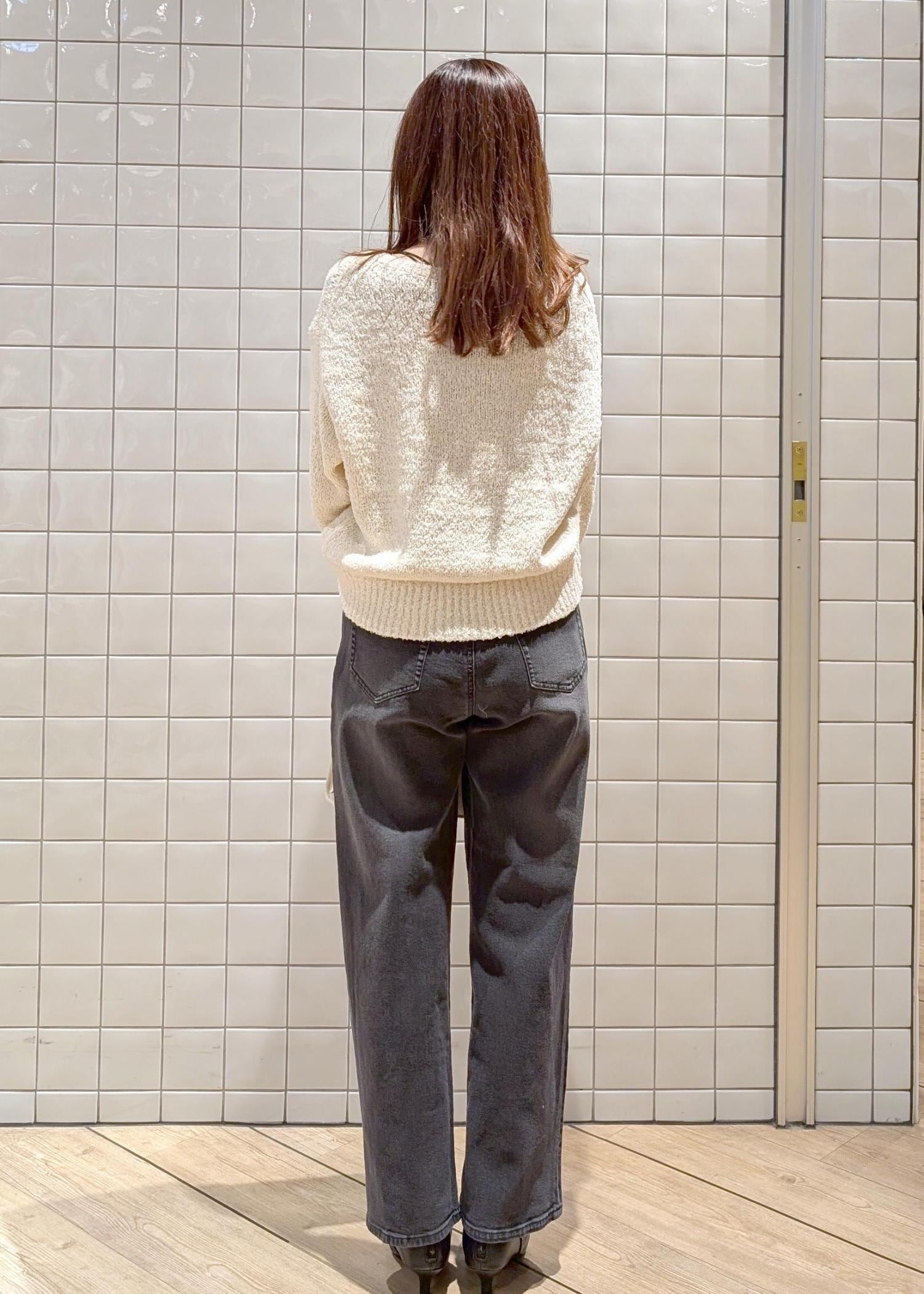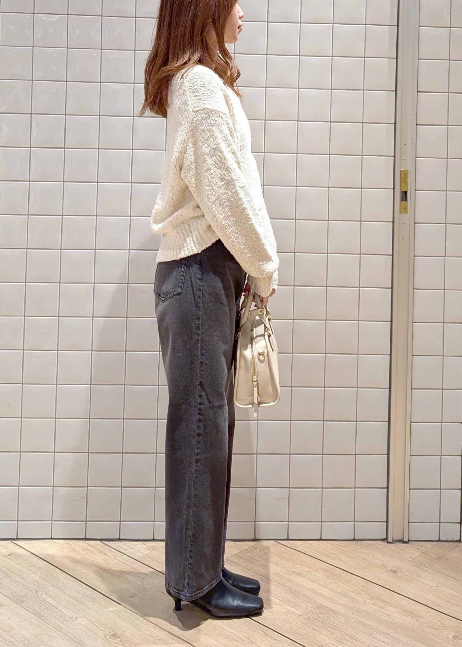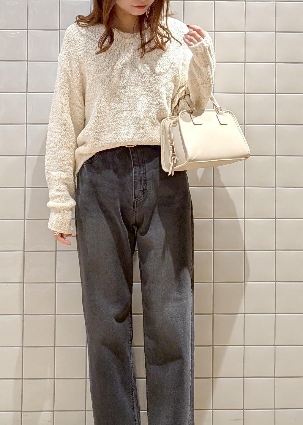 さり気なくラメが入ったフリンジヤーンニットとデニムのシンプルスタイル。程よいゆったりシルエットが可愛いトップスです。インナーを合わせて冬~トップスのみで春まで長くお使いいただけるアイテムです。