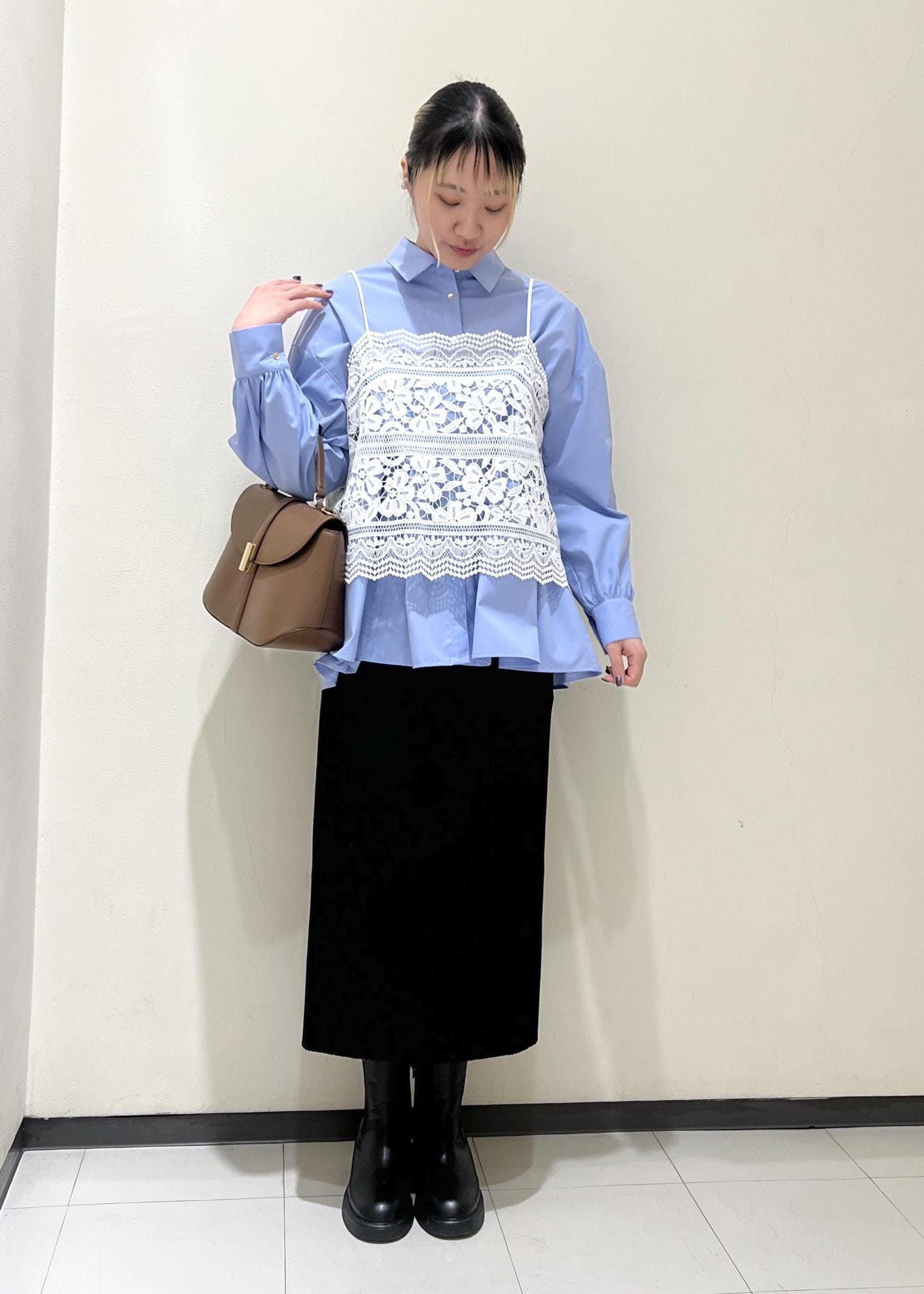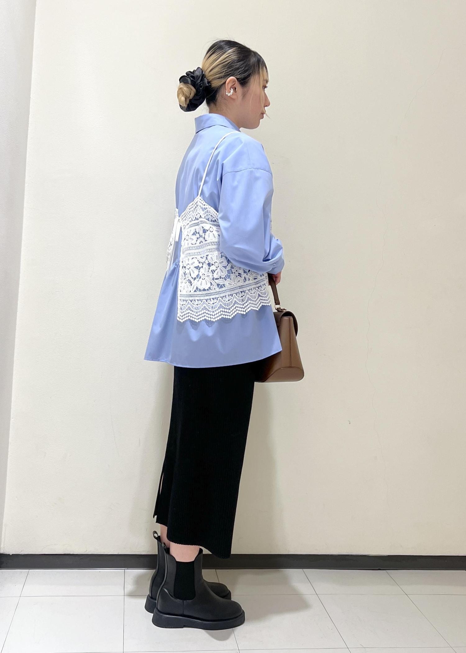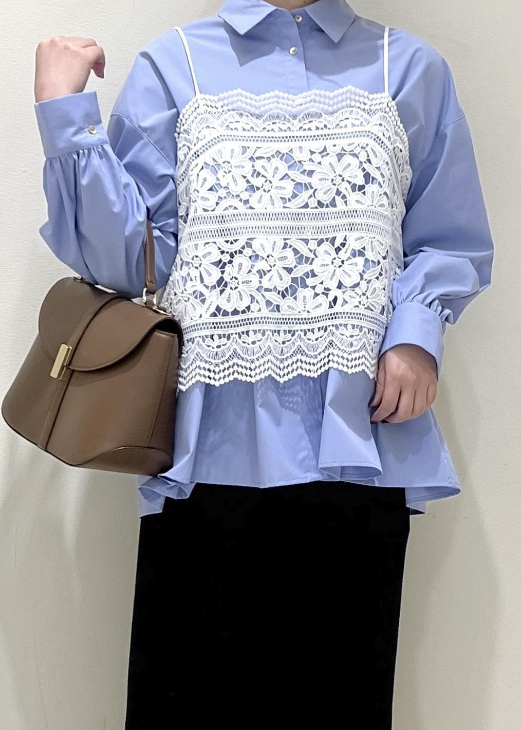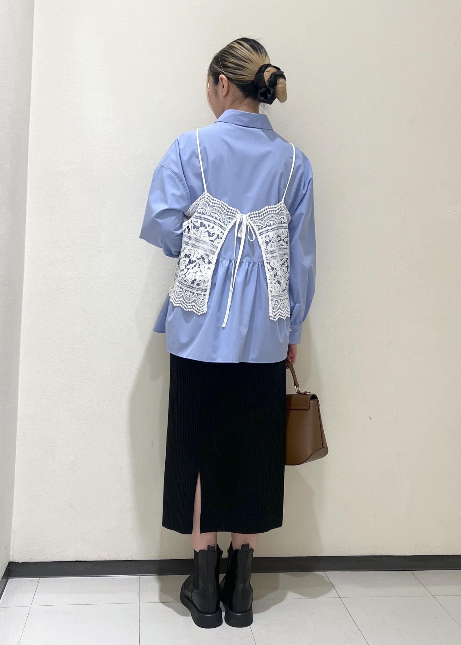 ビスチェの甘いレースデザインをシャツで引き締めることでバランスを良くしました◎