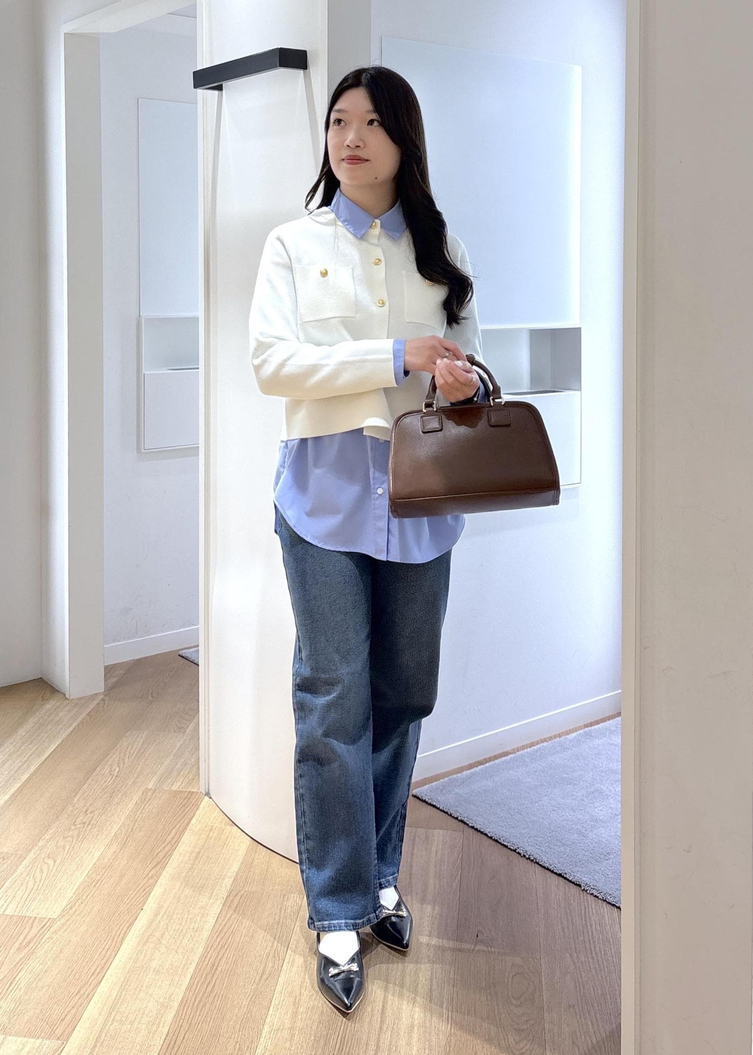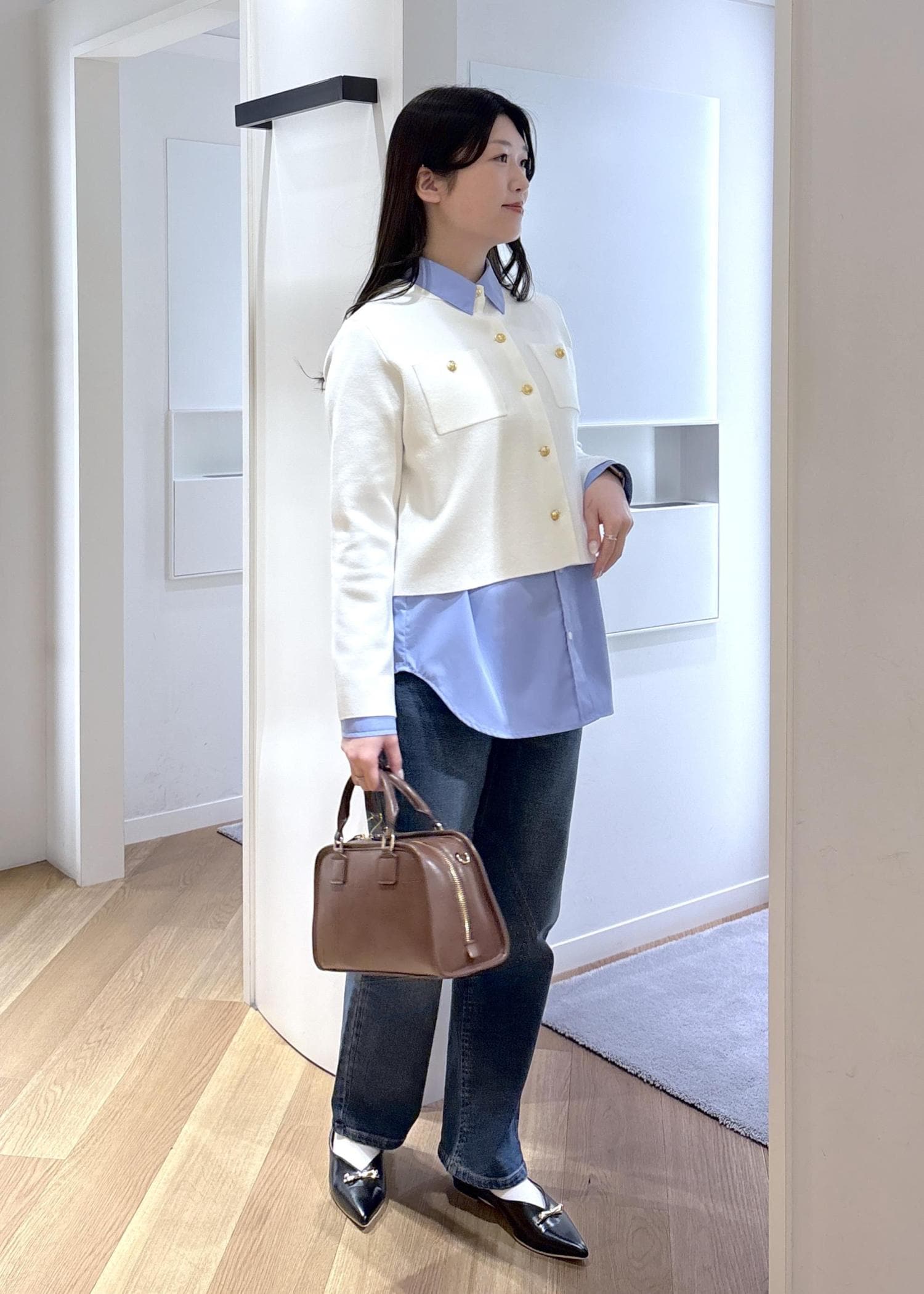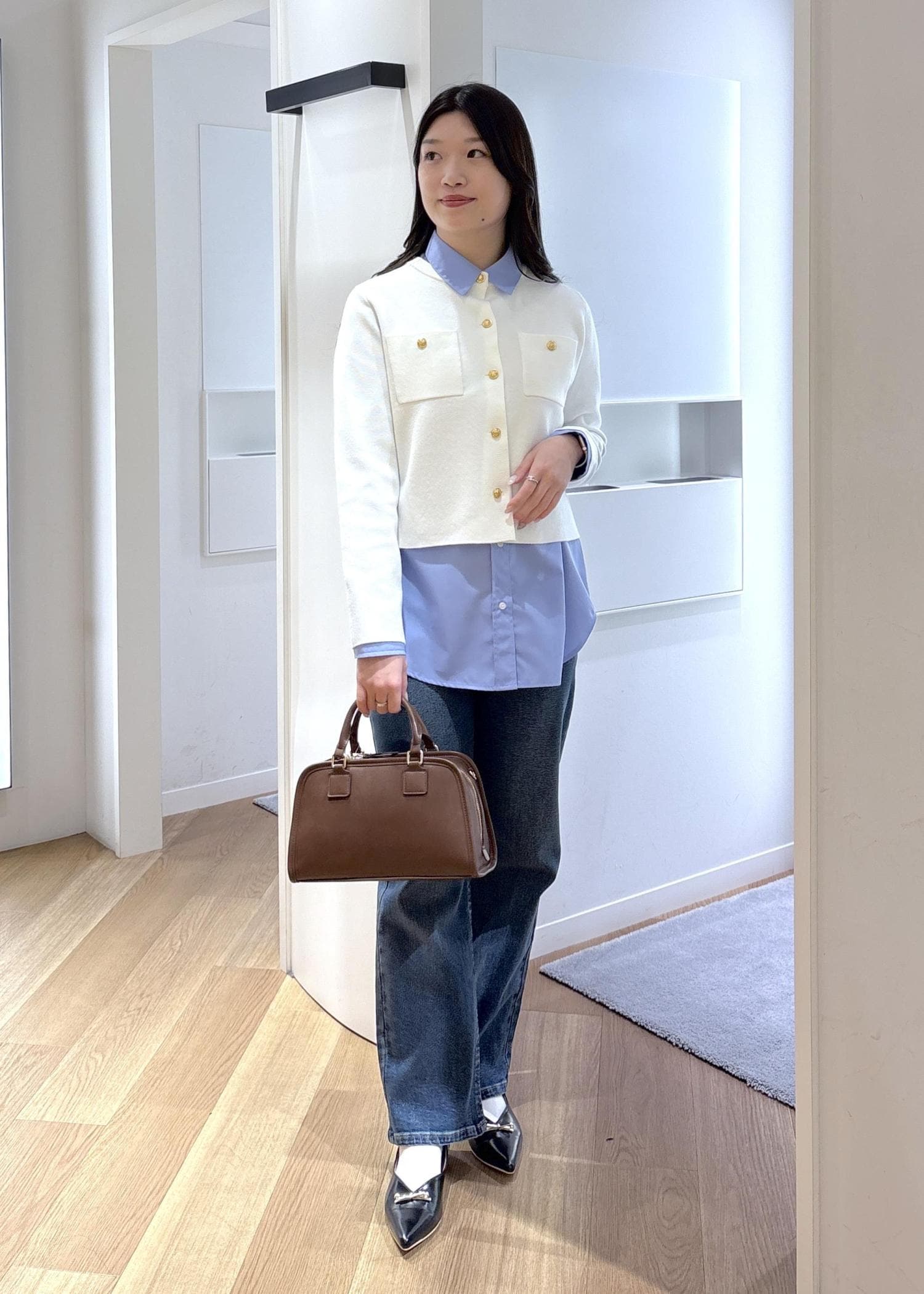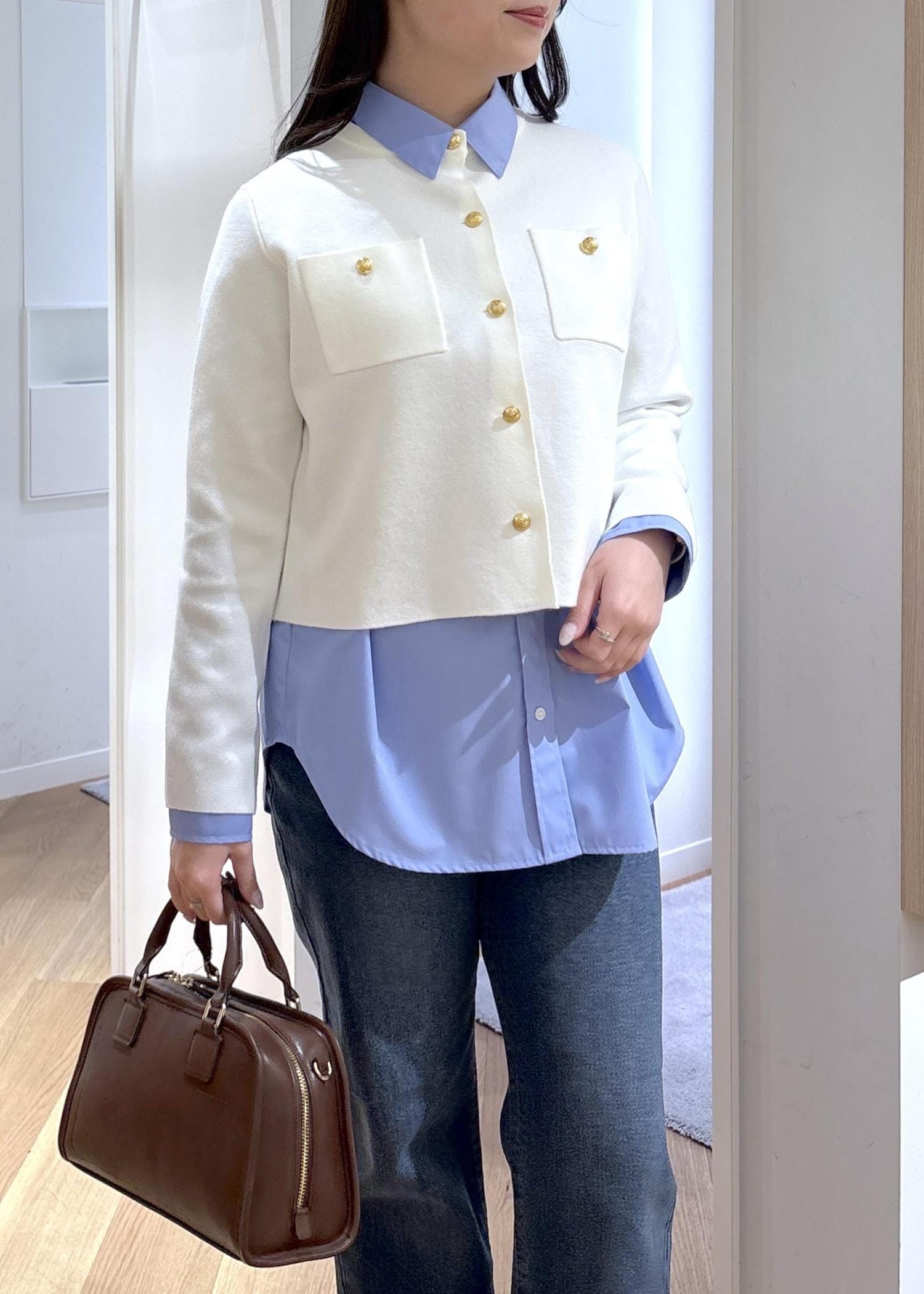 春らしいブルーデニムのカジュアルコーデも、金ボタンのカーディガンを合わせるときちんと感がプラスされます♪