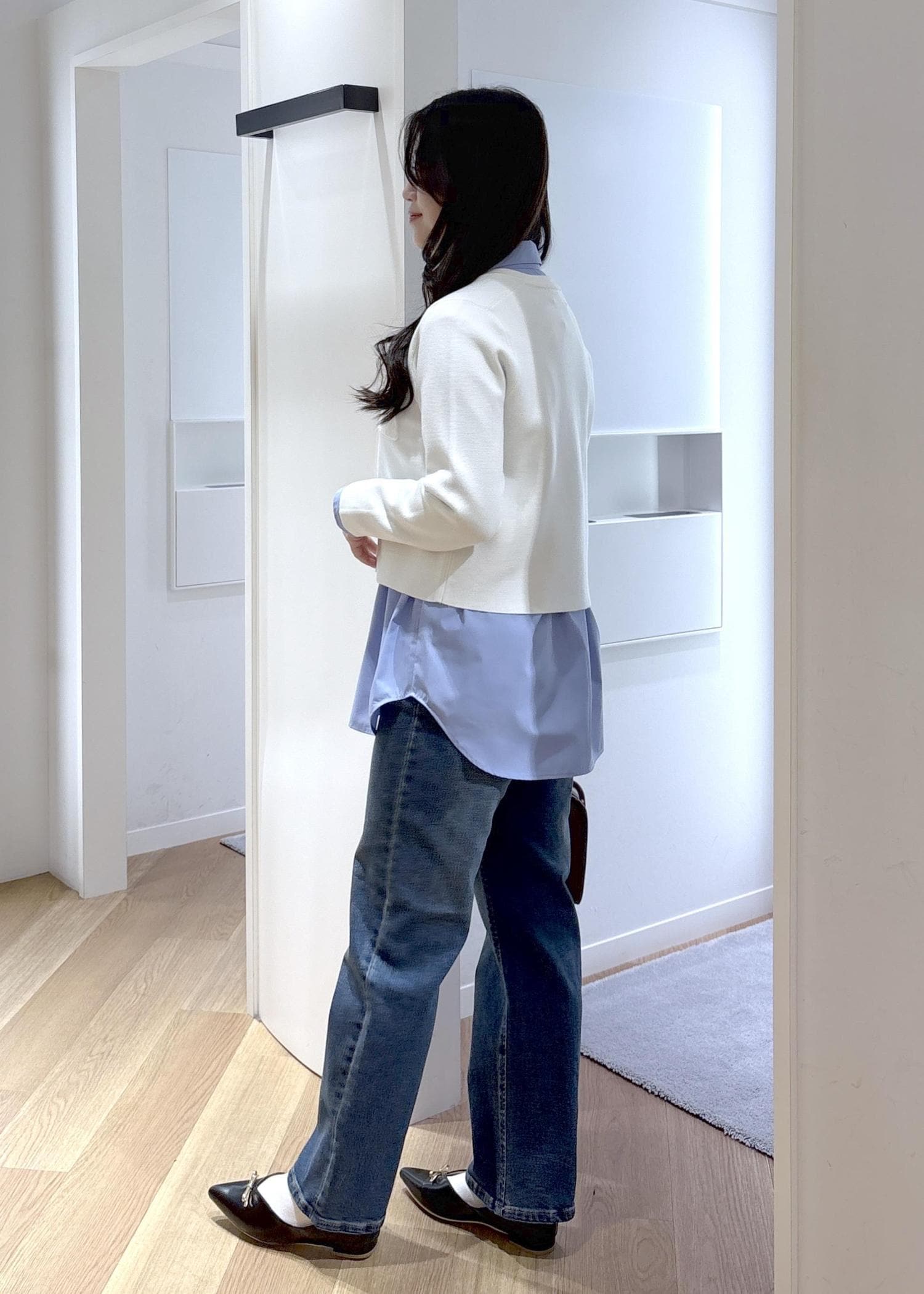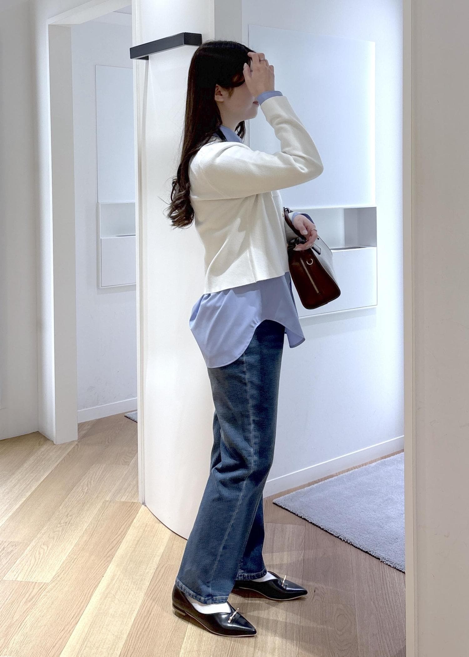スッキリ見えるコンパクトな形ですが、中にシャツや薄手のニットをインできるゆとりがあります。