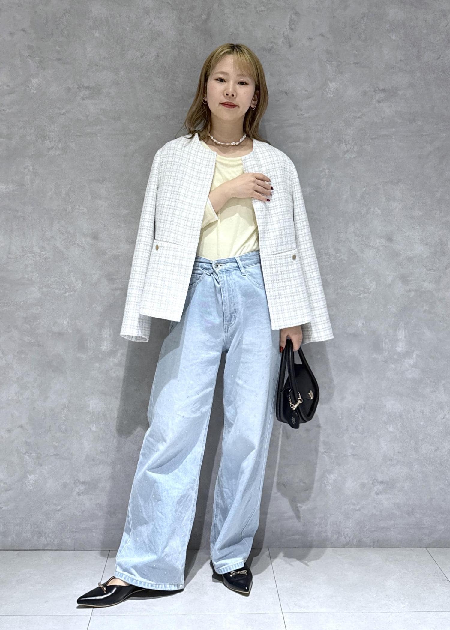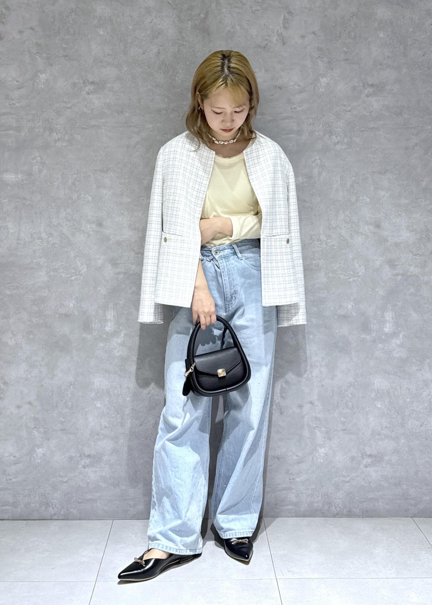 ツイードジャケットのカジュアルコーデ
