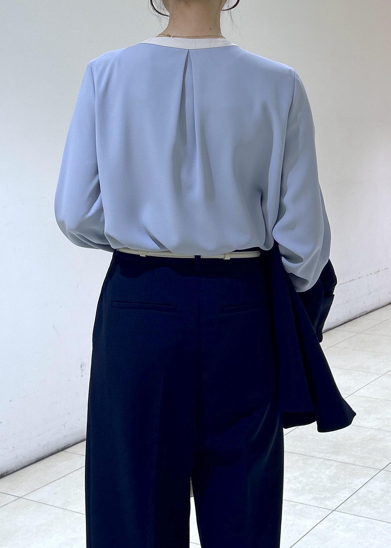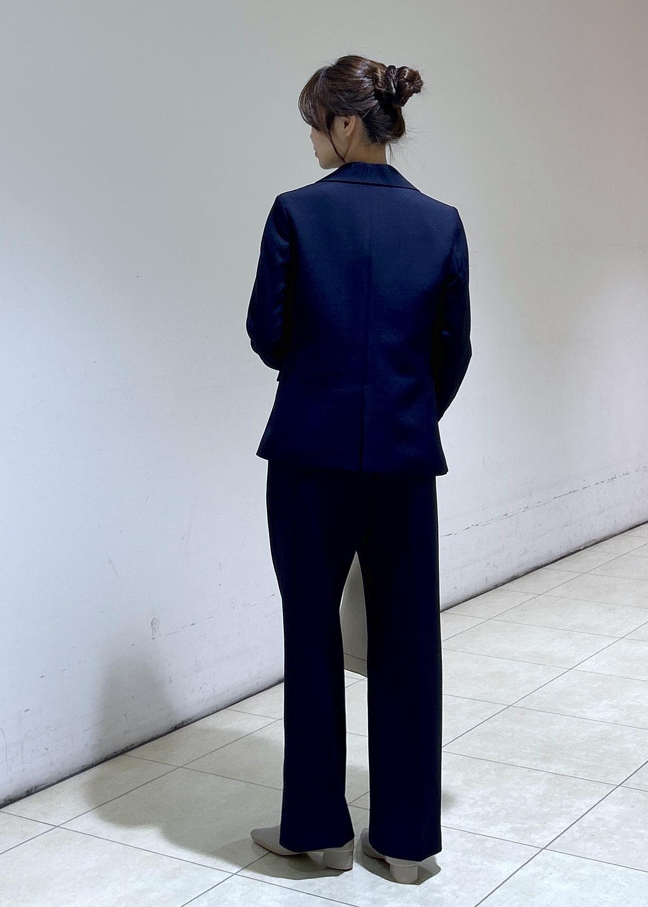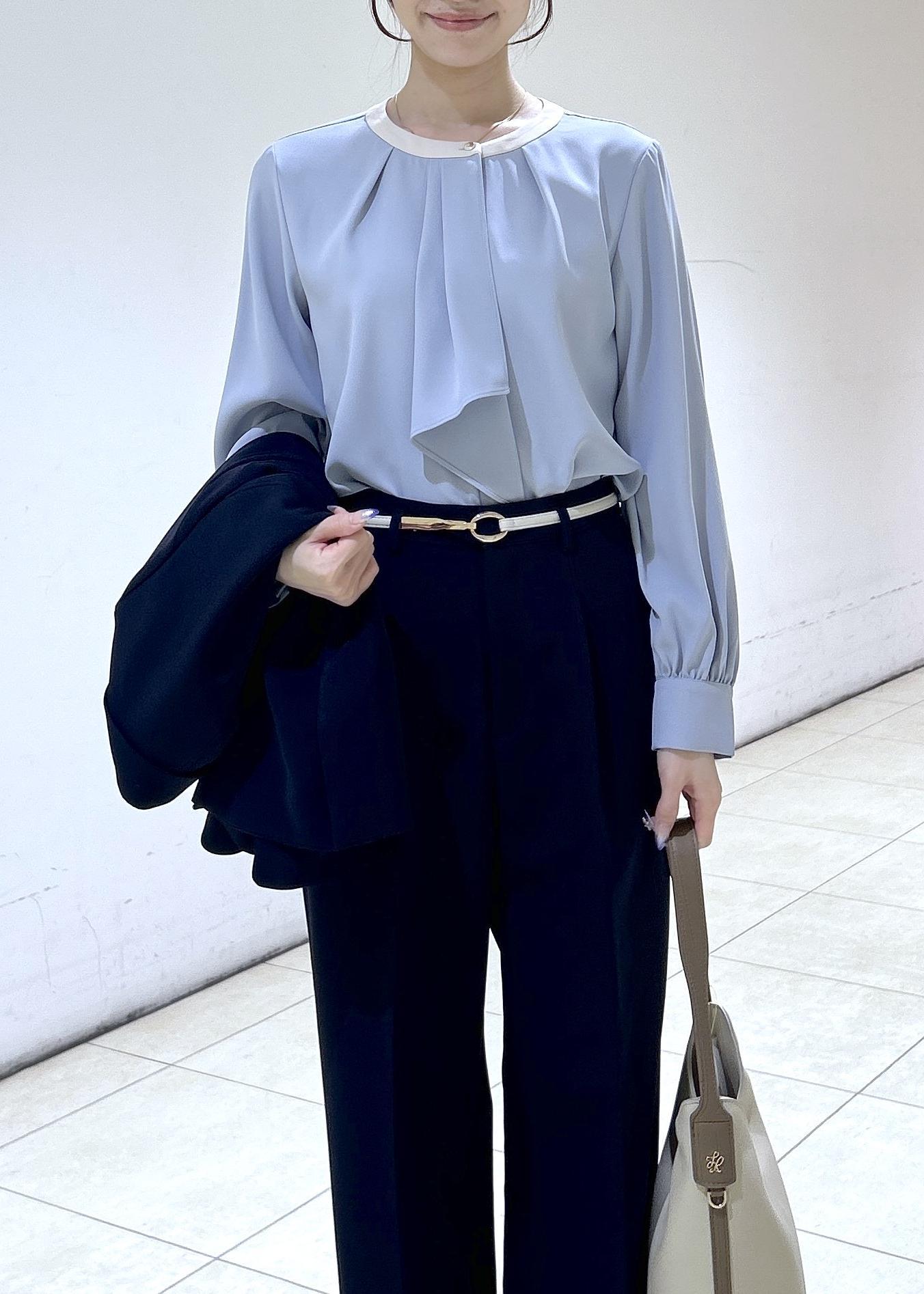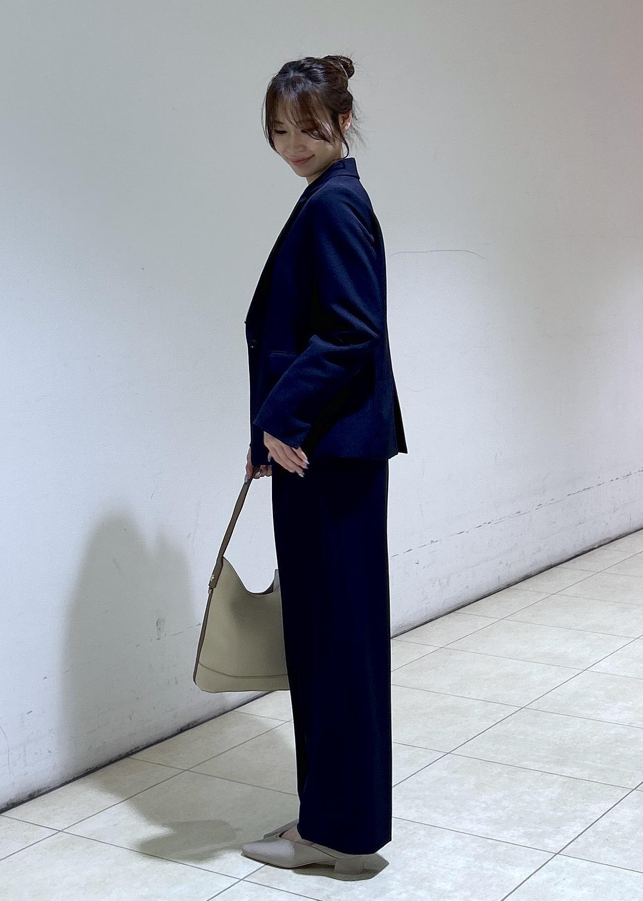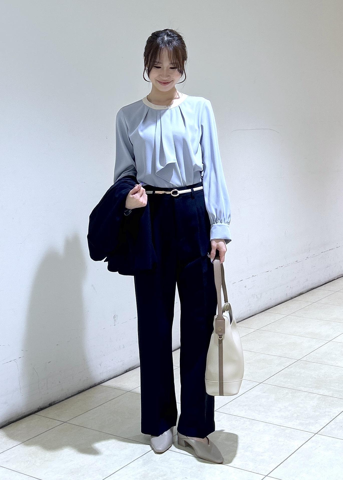 ブルーのブラウスで華やかさを取り入れネイビーのセットアップでまとまりのあるスタイリングにしました。