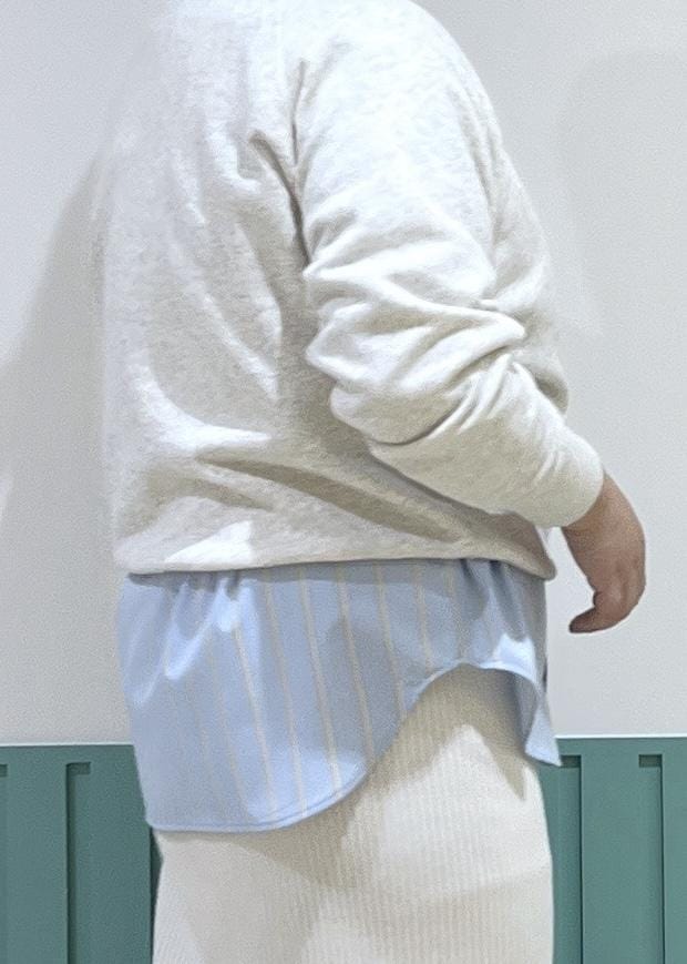ブルーのシャツをアクセントにレイヤード。