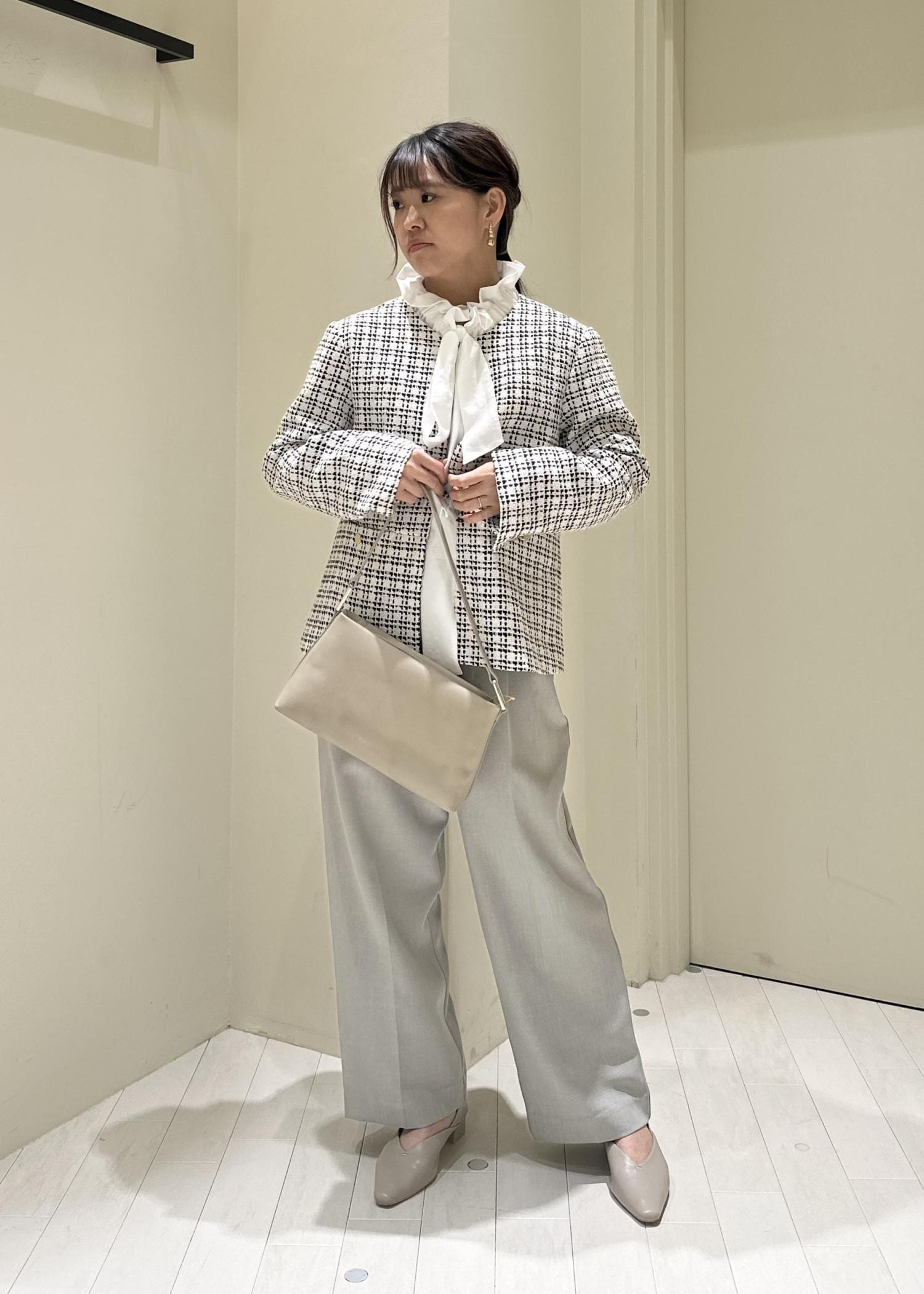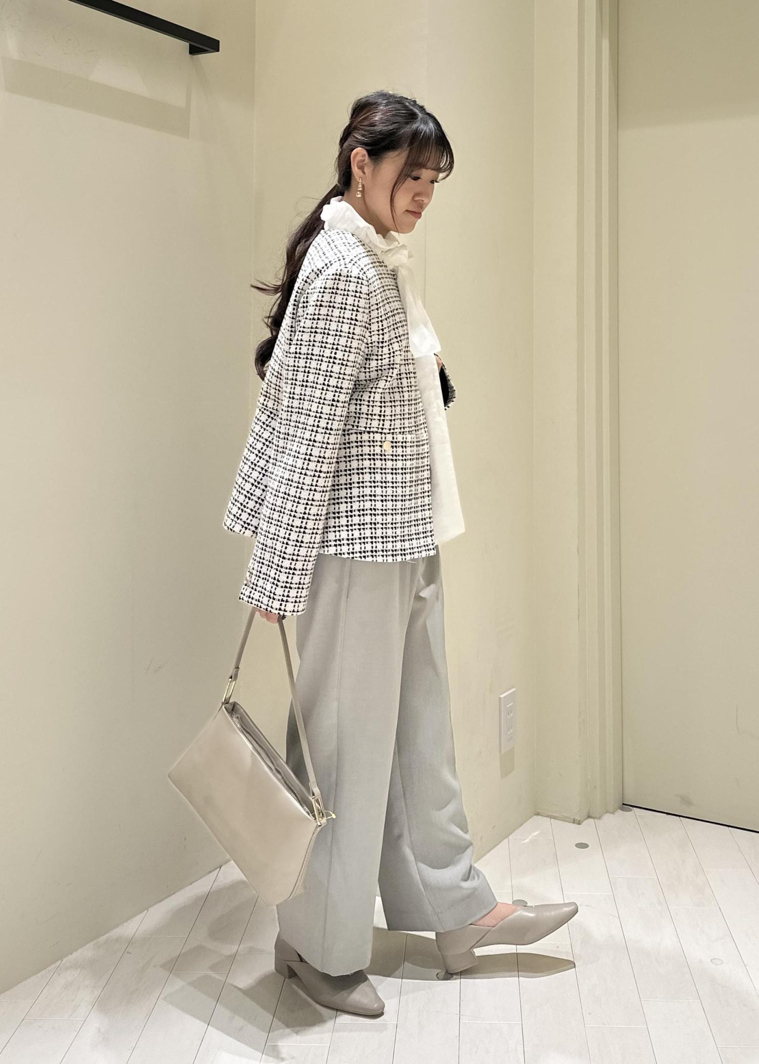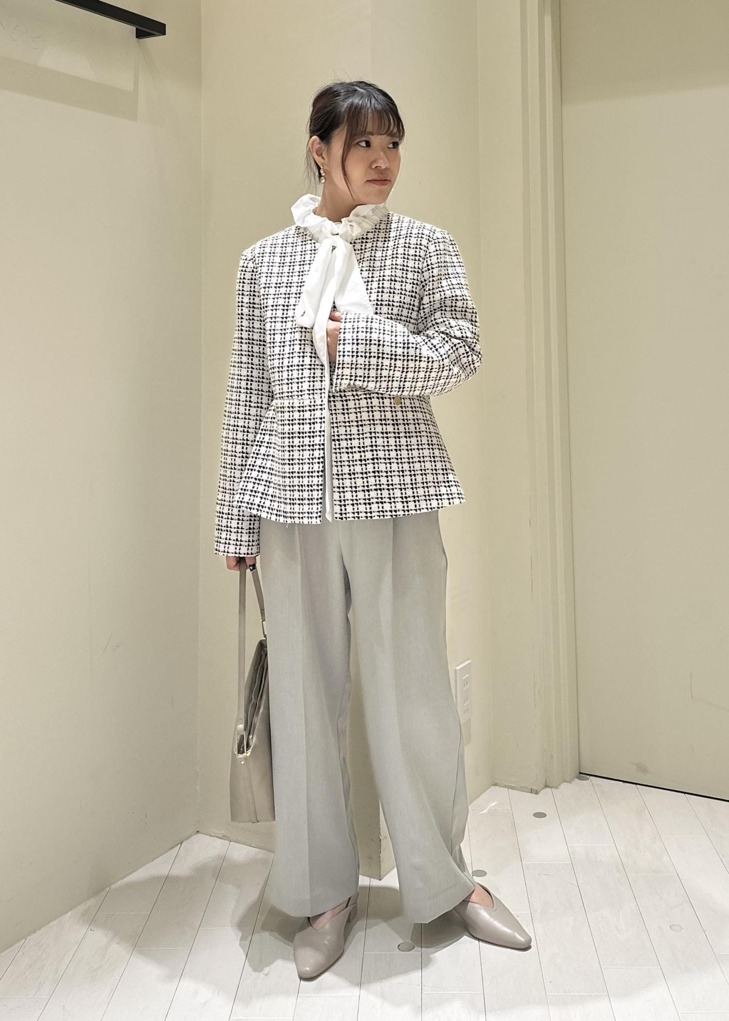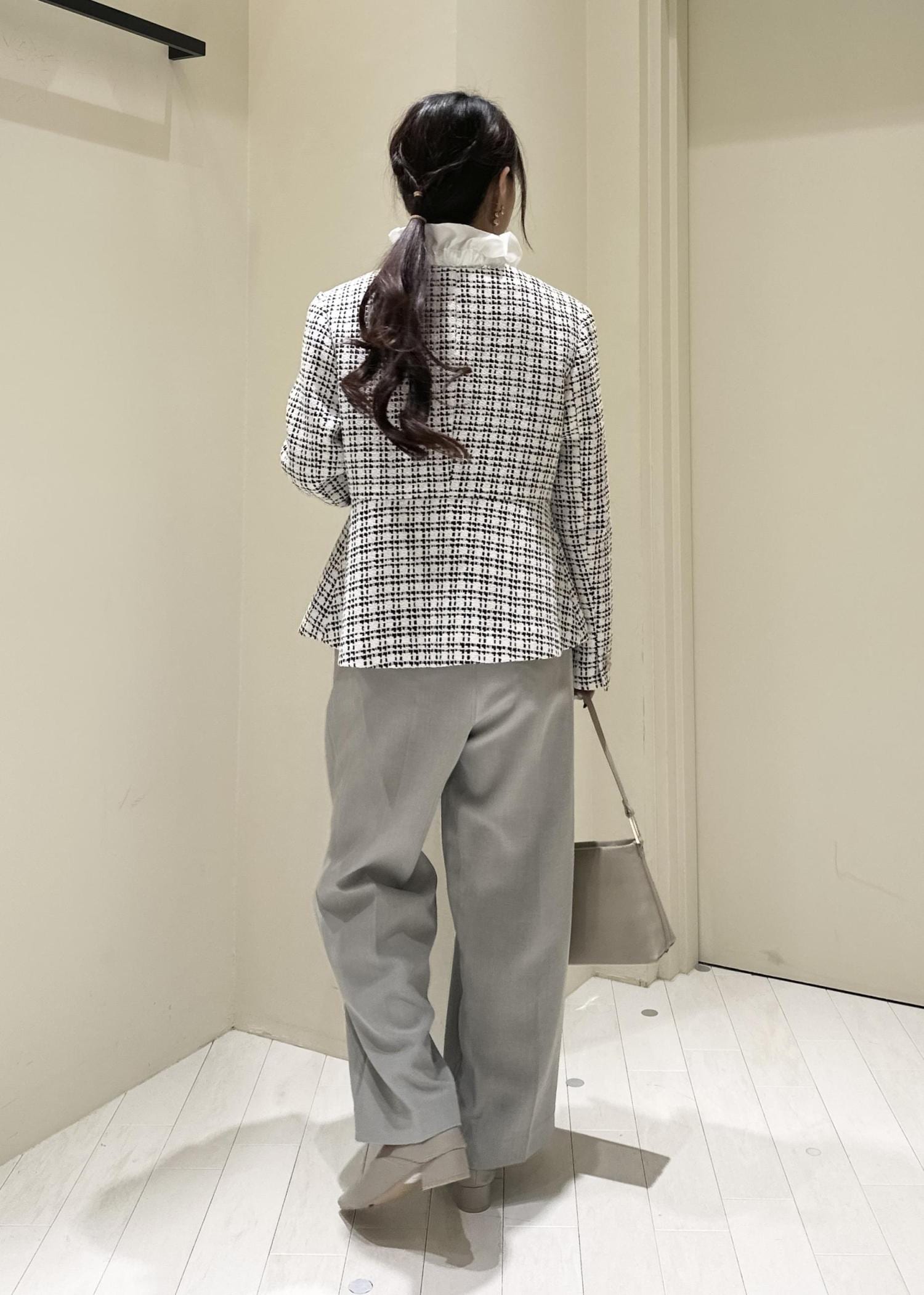 王道ツイードのジャケットをメインに淡めカラーでコーデを組んでみました!
