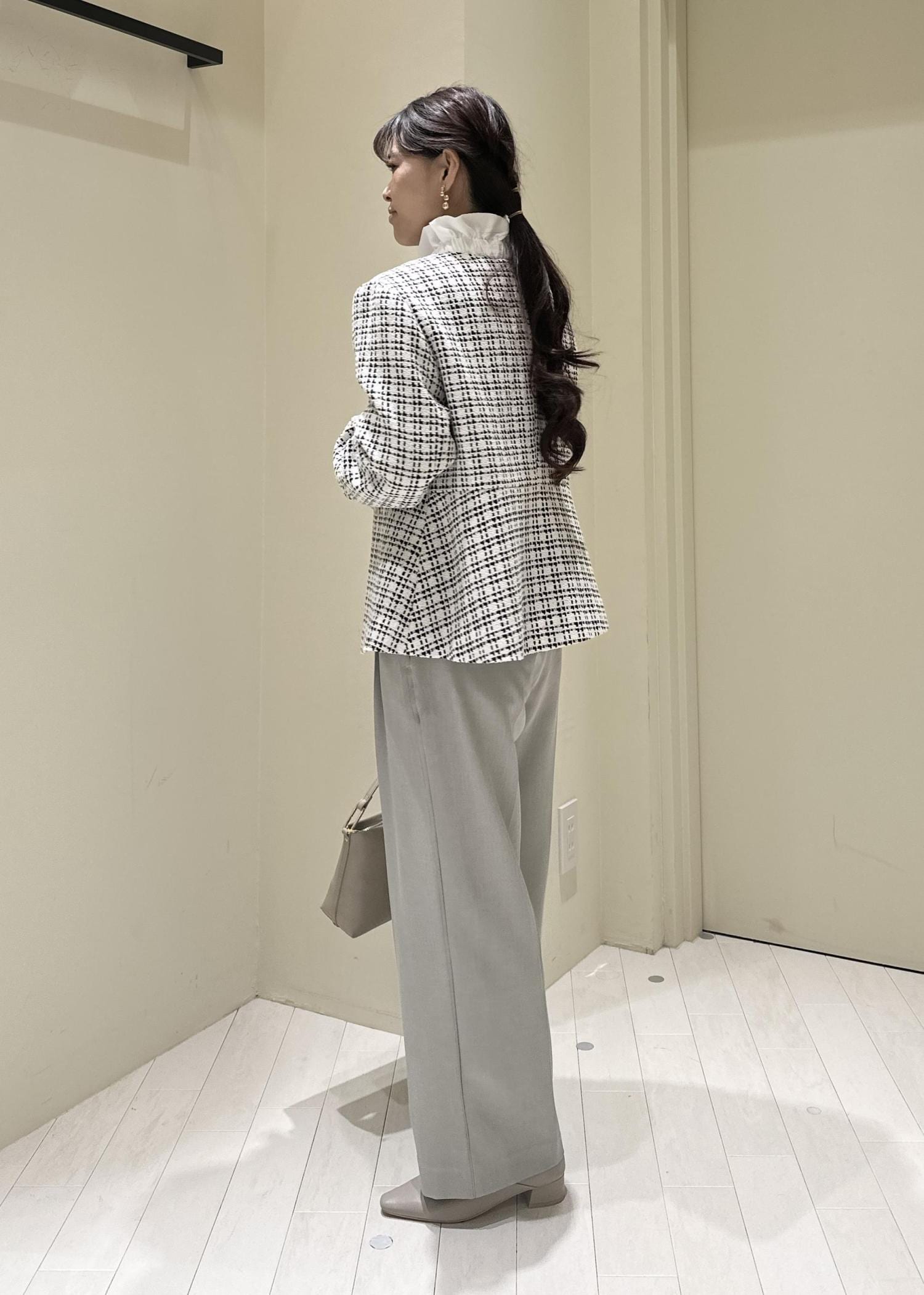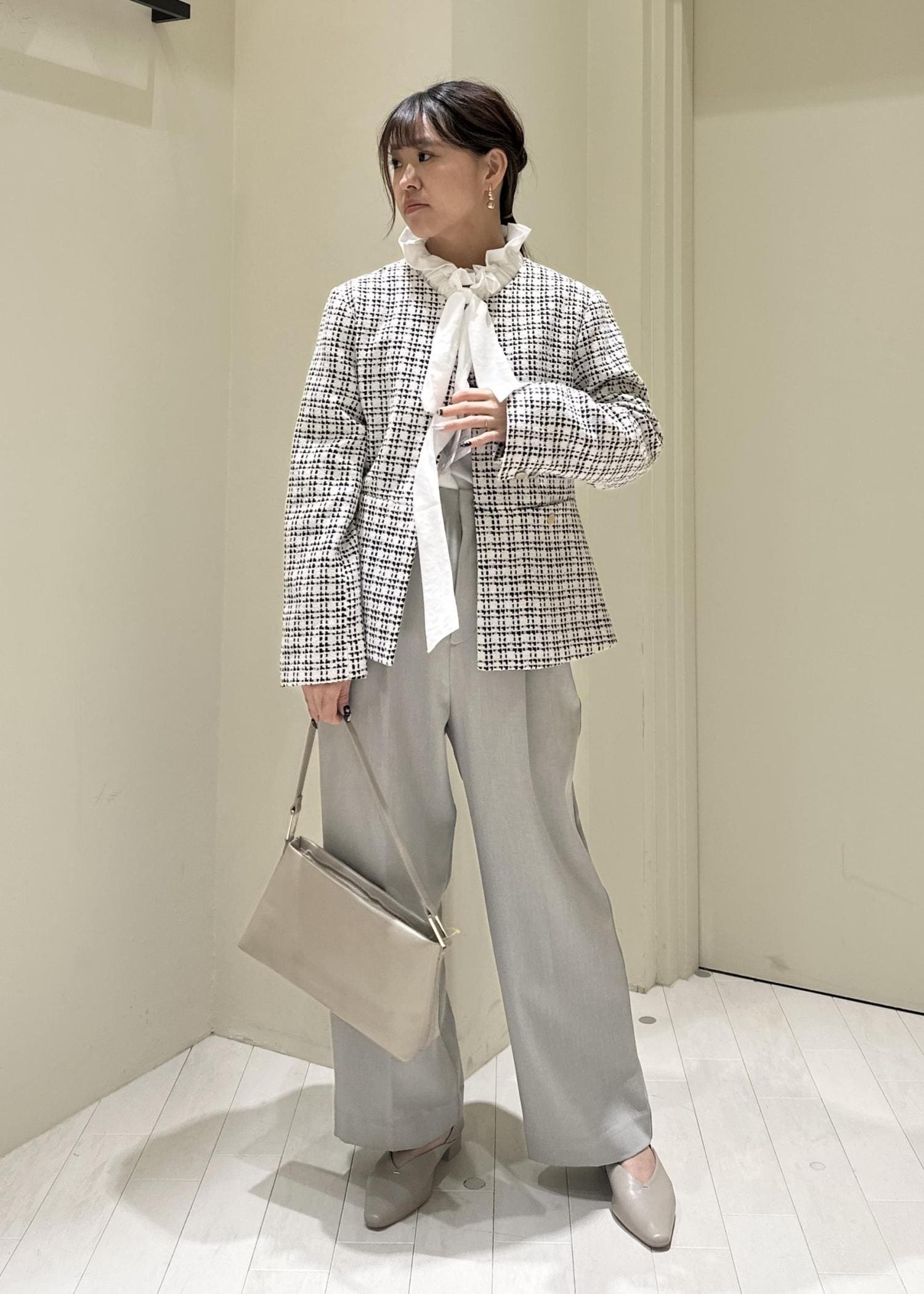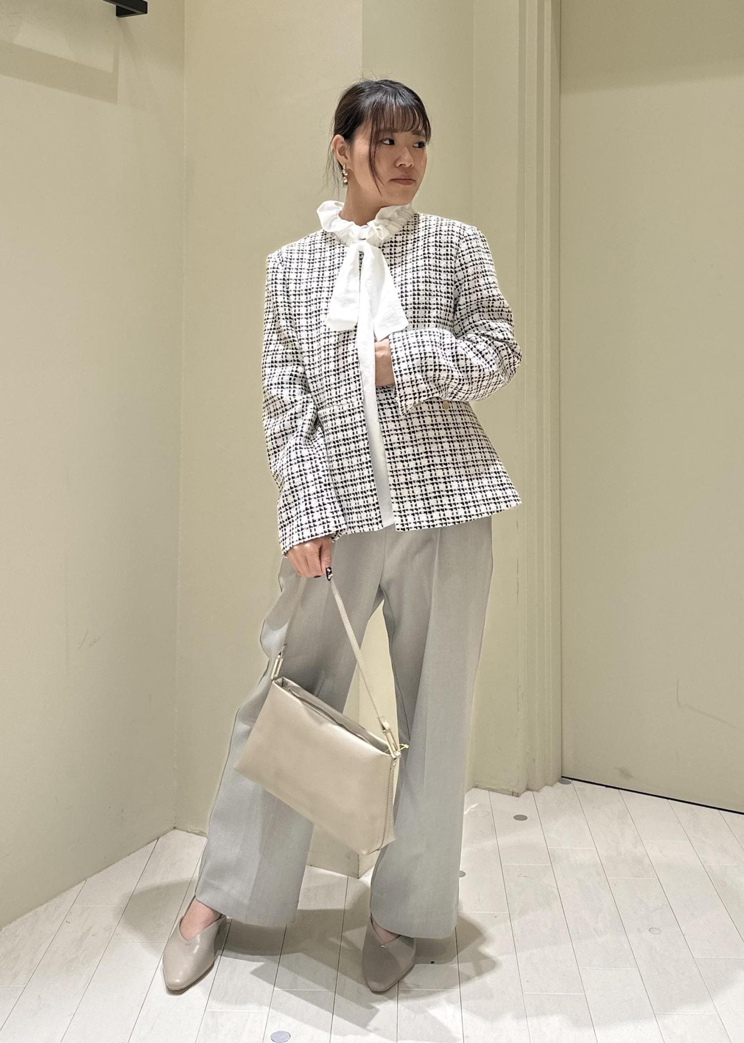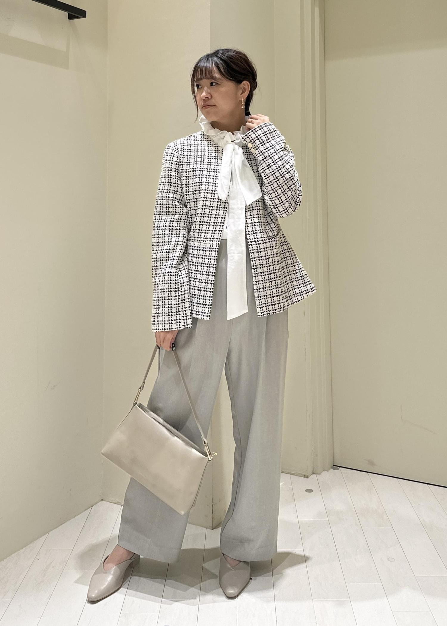 王道ツイードのジャケットをメインに淡めカラーでコーデを組んでみました!