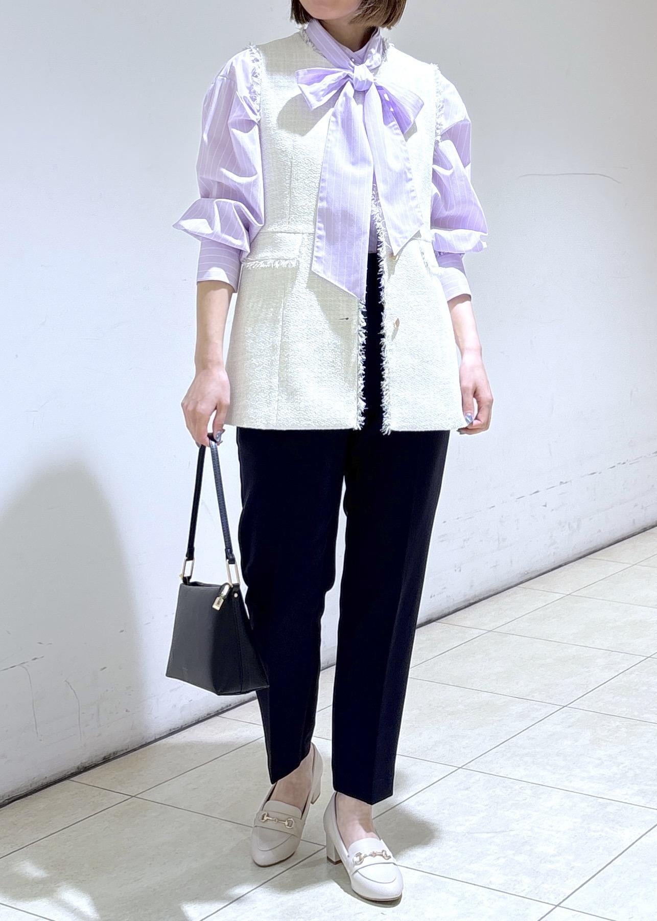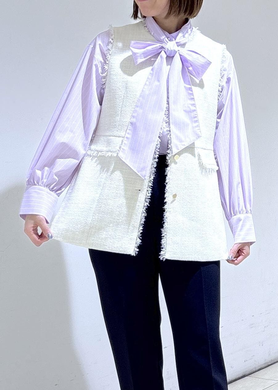 ホワイトのツイードジレにリボンブラウスを合わせた