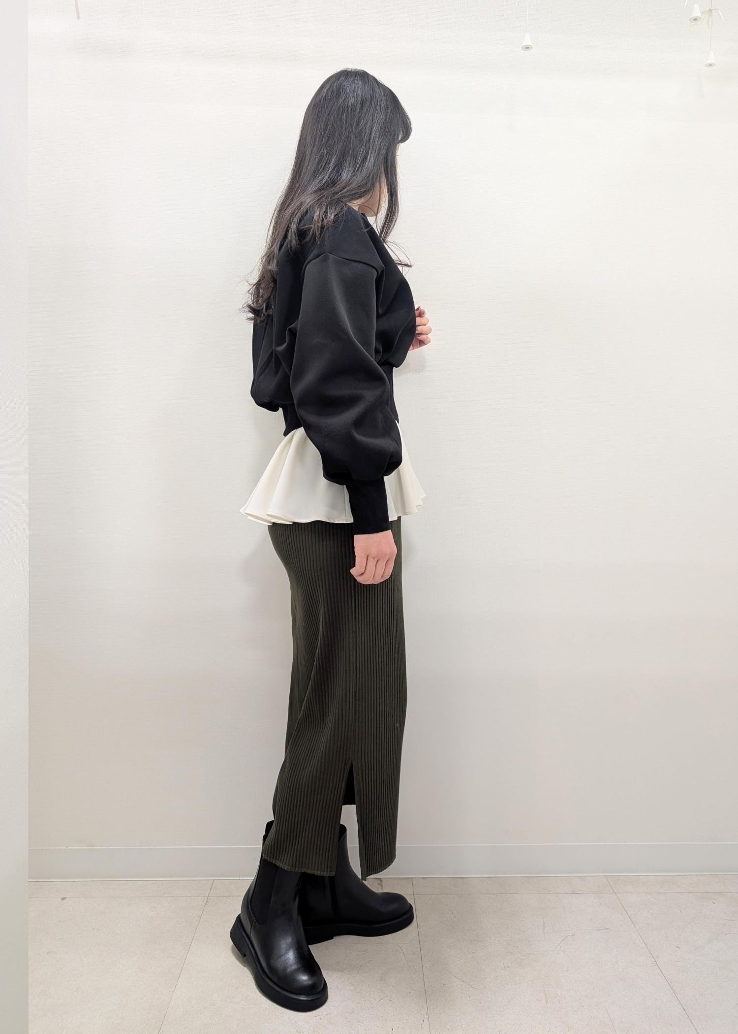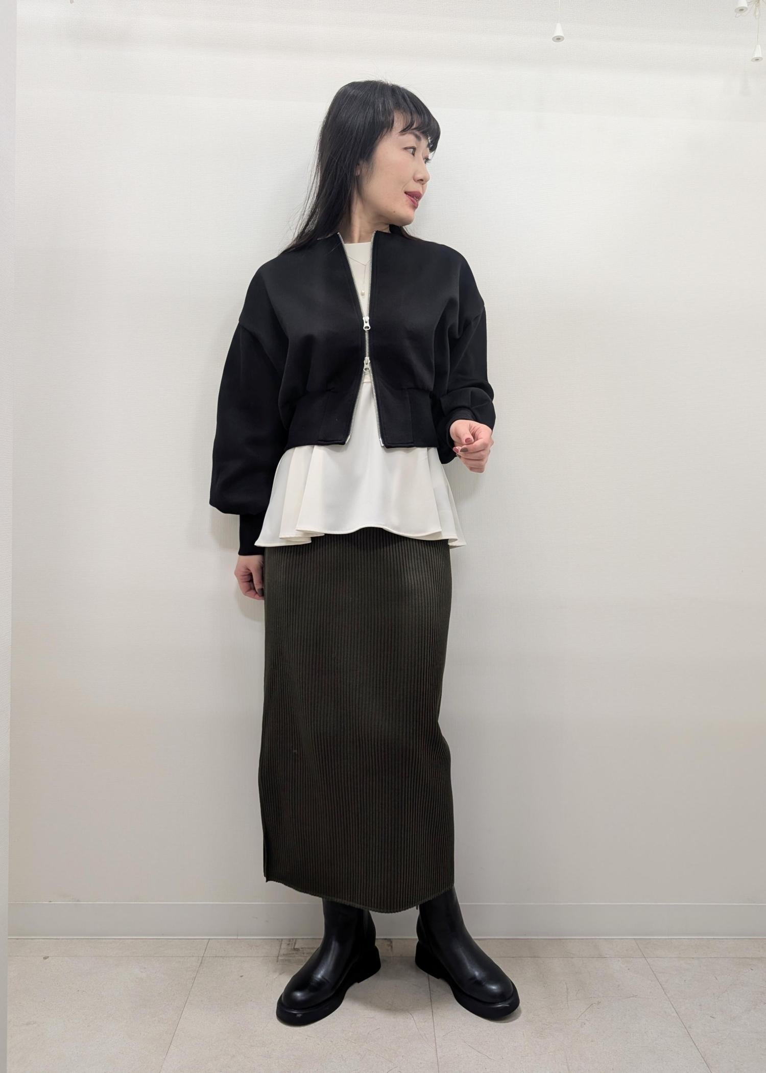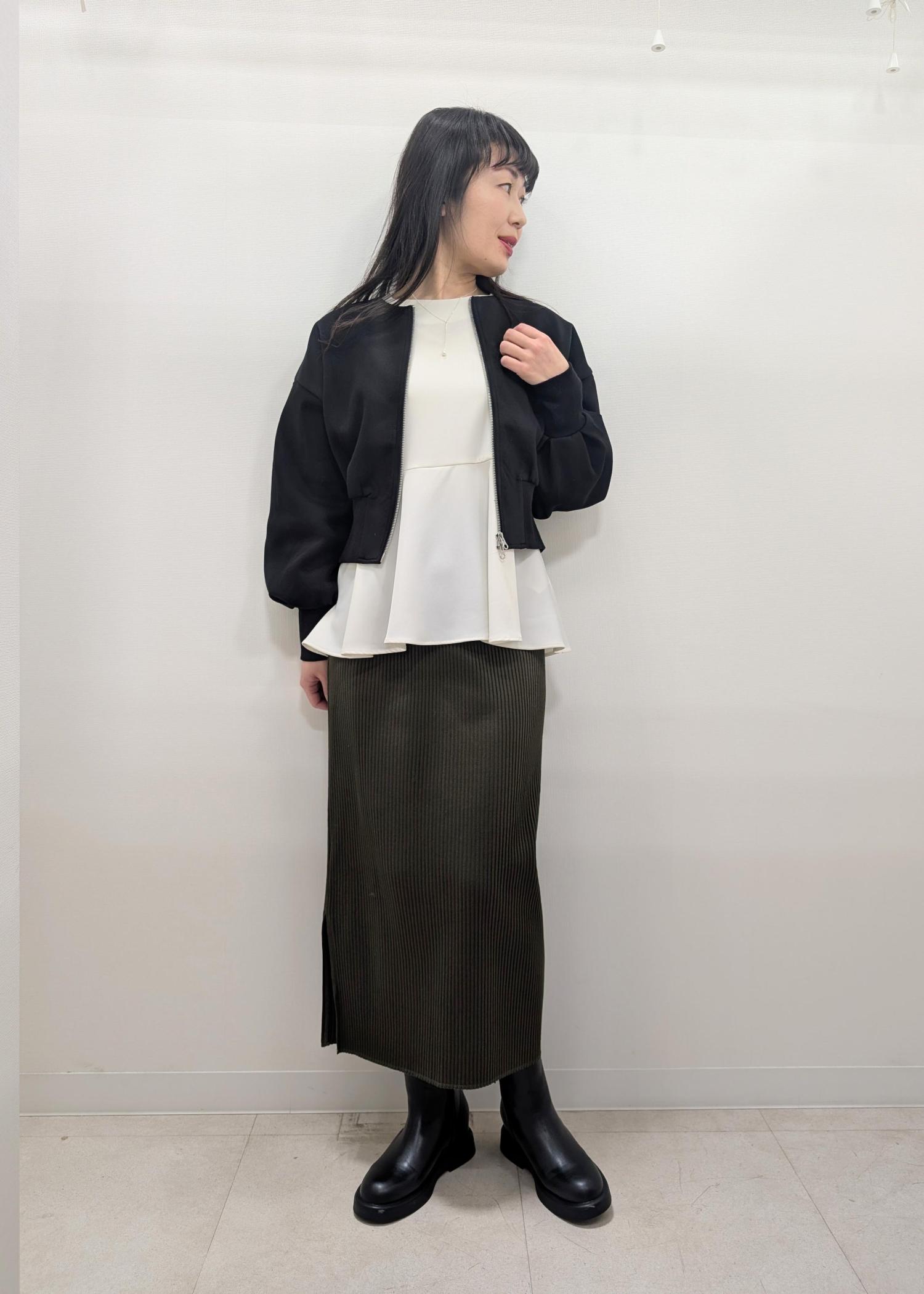 ペプラムブラウスにショート丈のカーディガンをあわせたレイヤードコーデ。トップスが目を引くシルエットなので、ボトムはシンプルなタイトスカートを合わせました(^.^)