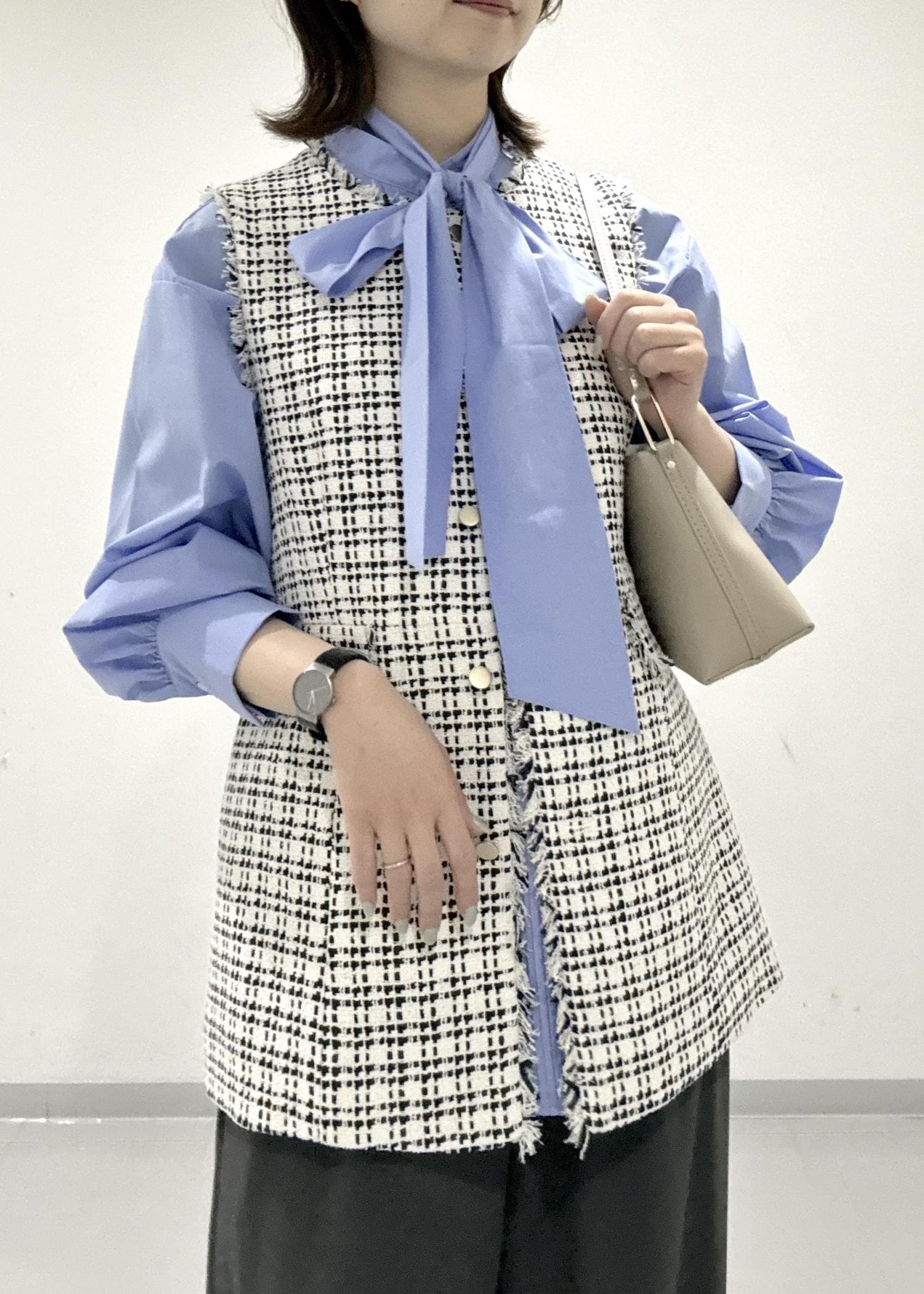 大きめのボウタイがついたブルーのブラウスがカラーのポイントになっています◎