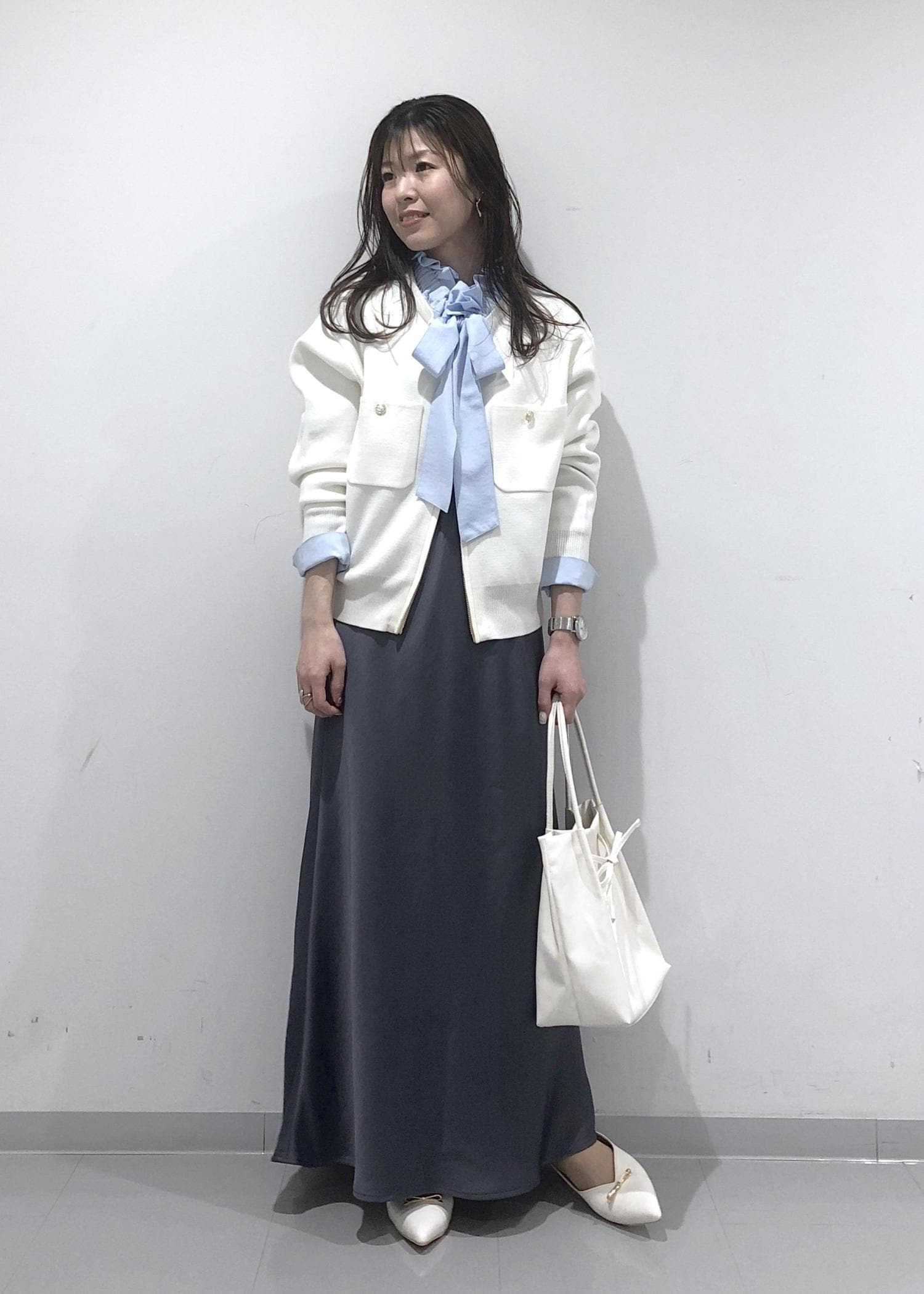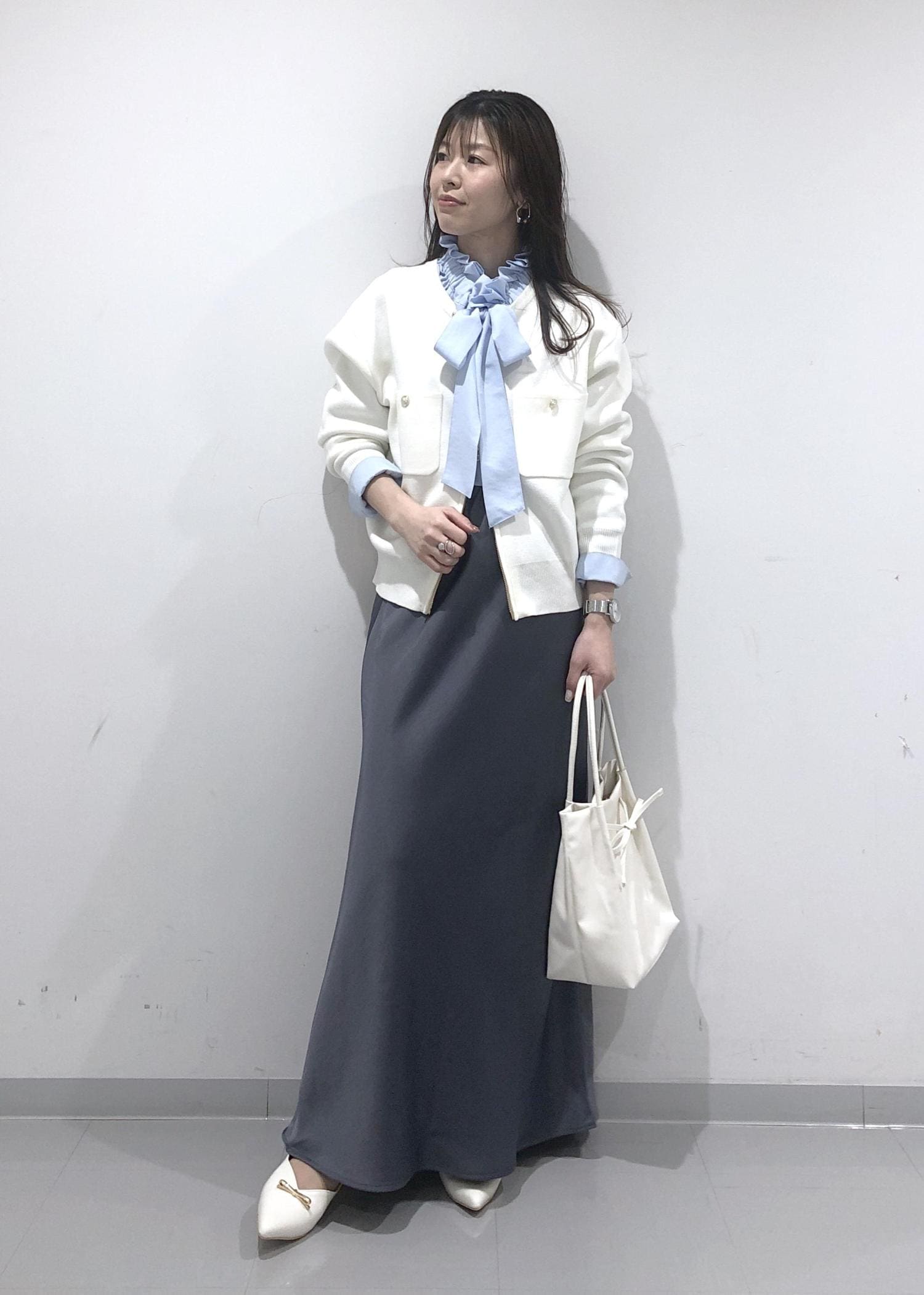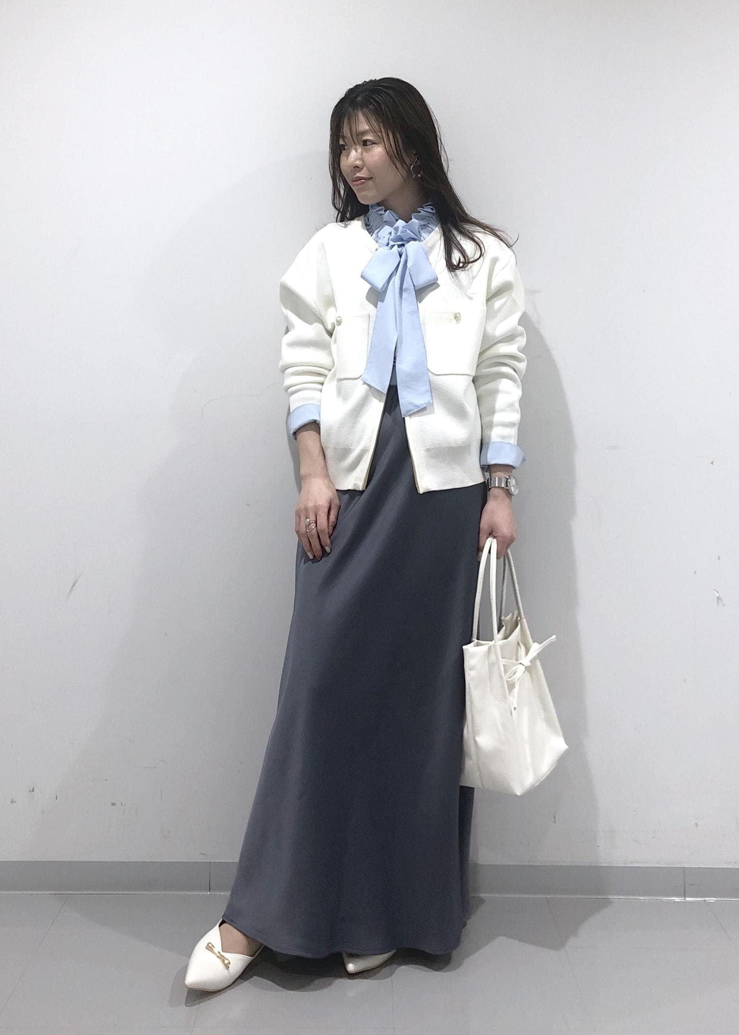 ブルーのフリルリボンブラウスに、ダブルジップアップカーディガン、サテン調マーメイドスカートを合わせ、小物類はホワイトで統一させた、爽やかな春カラーコーデ!