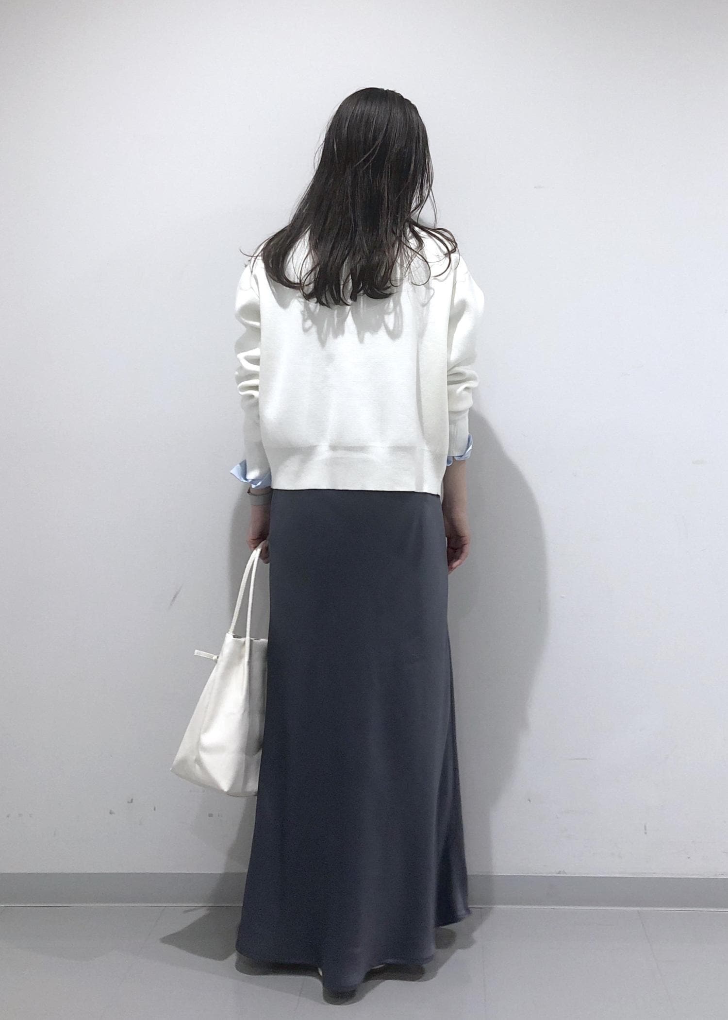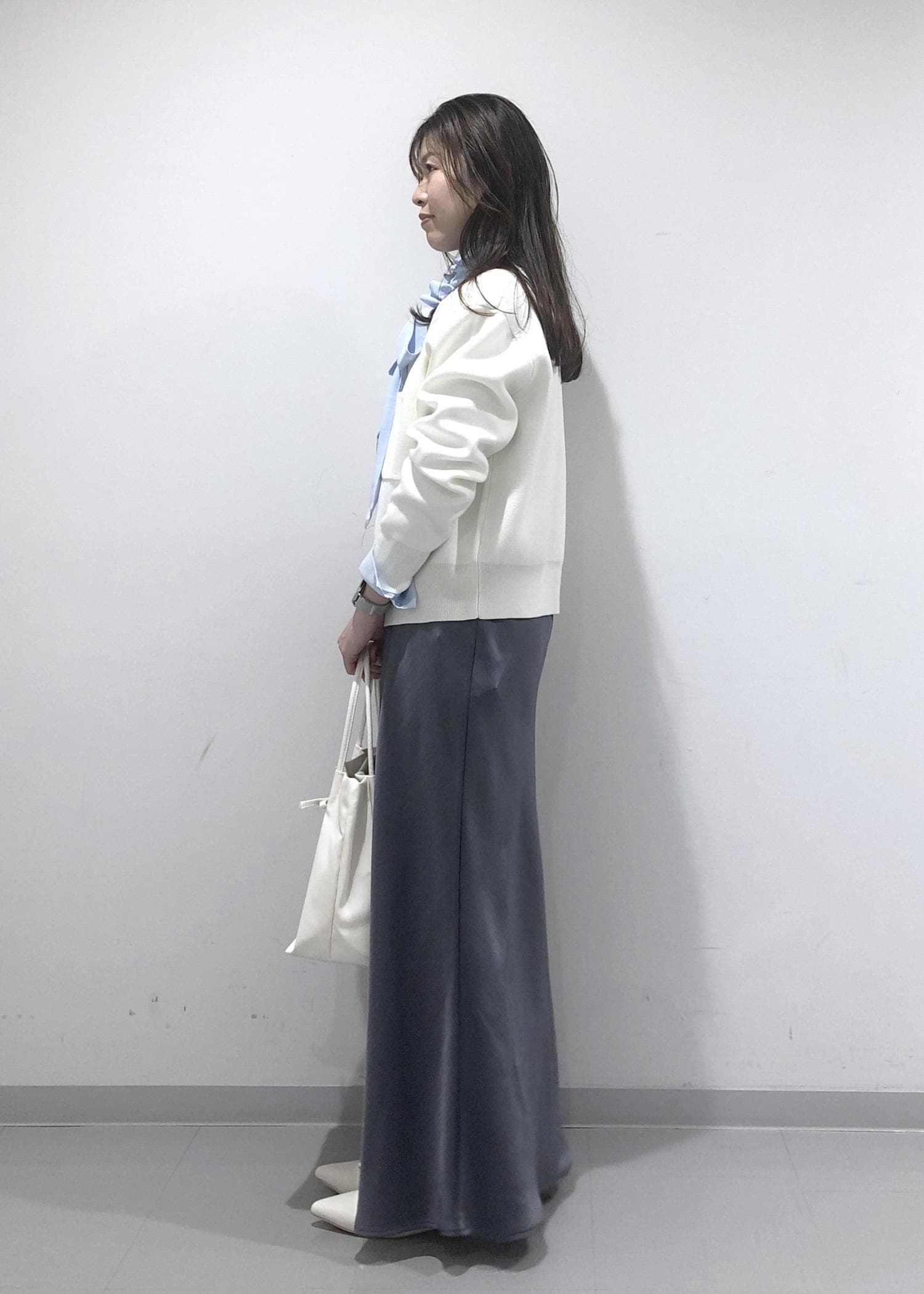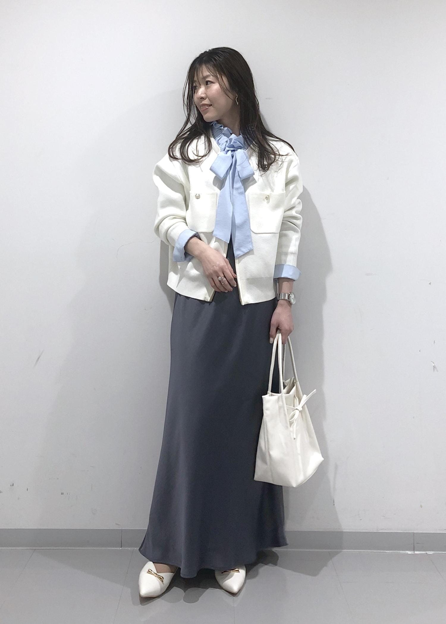 ブルーのフリルリボンブラウスに、ダブルジップアップカーディガン、サテン調マーメイドスカートを合わせ、小物類はホワイトで統一させた、爽やかな春カラーコーデ!