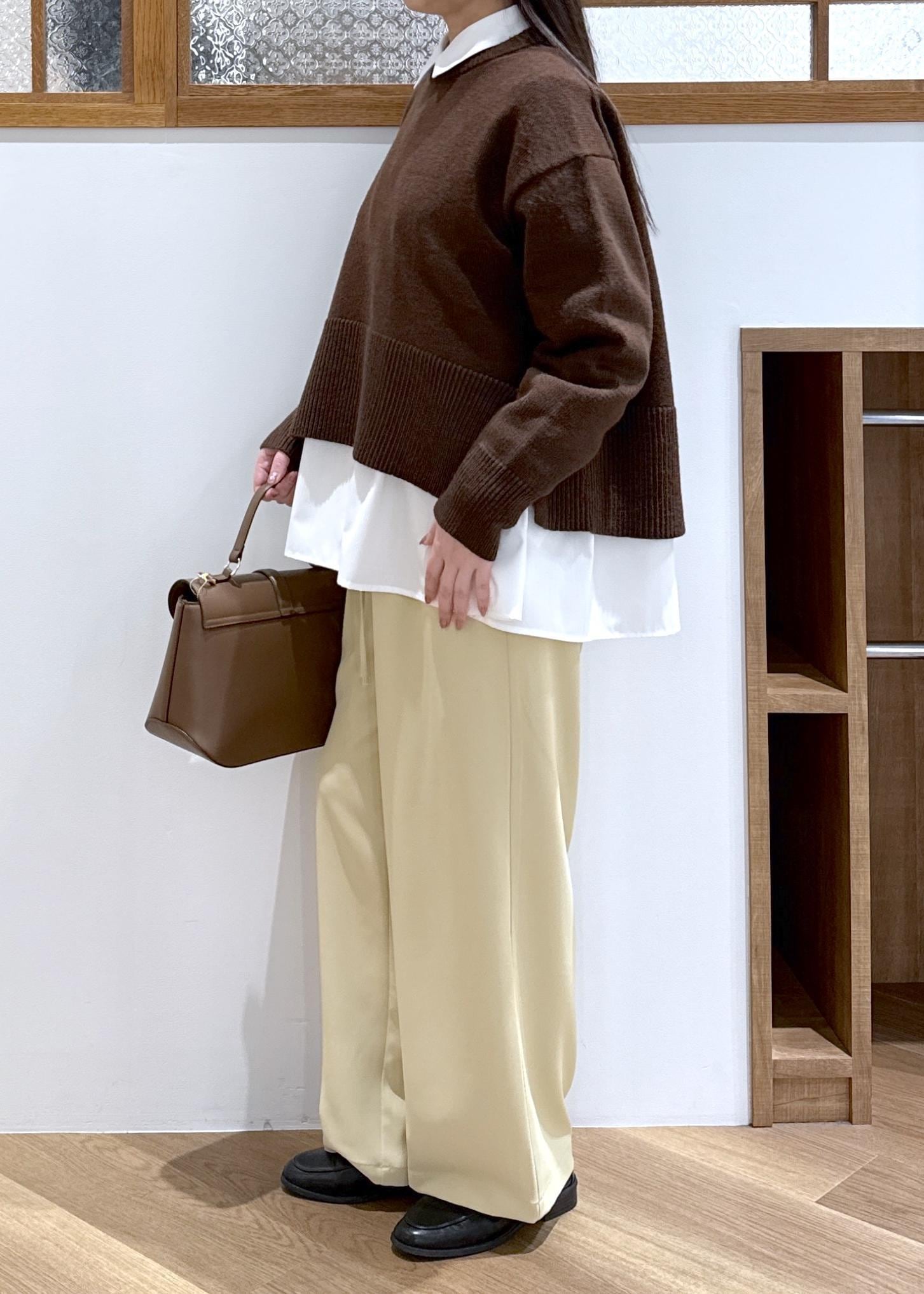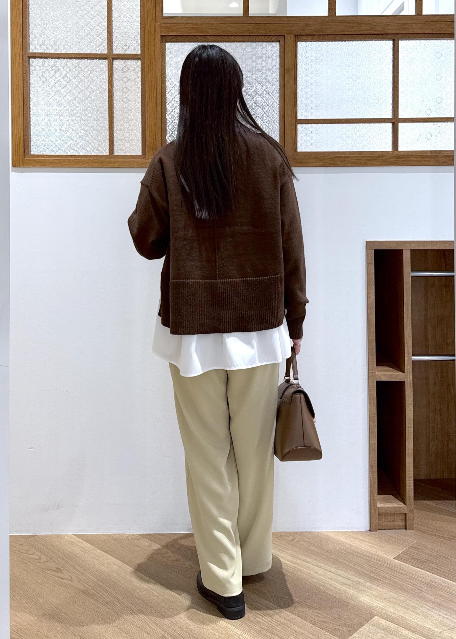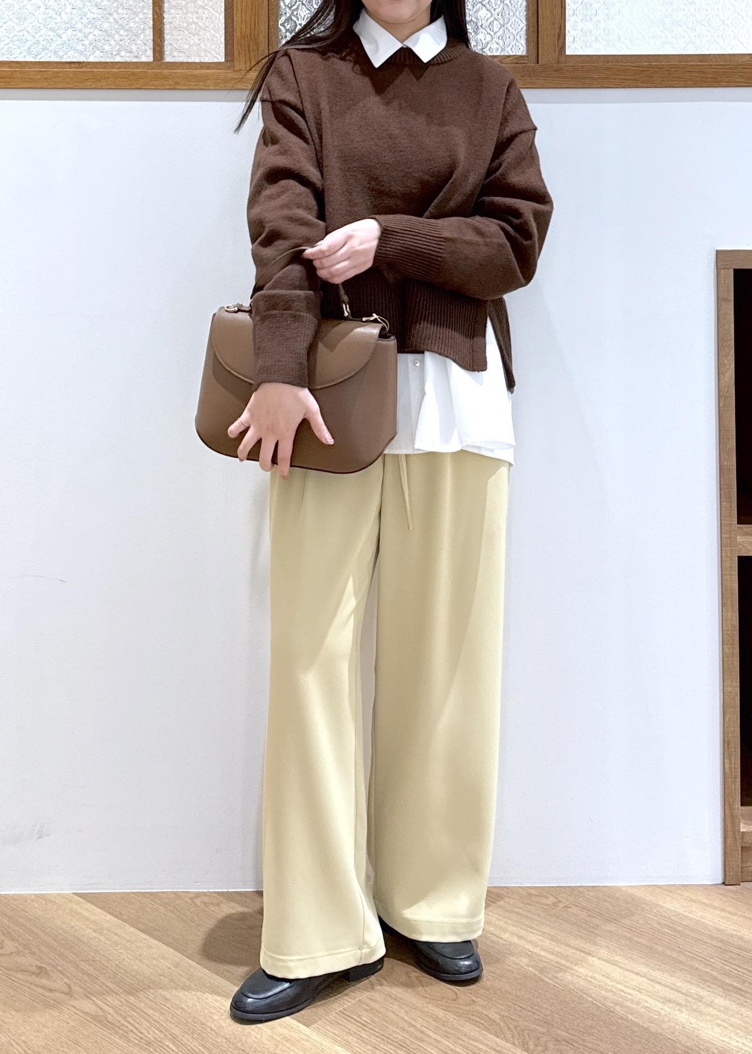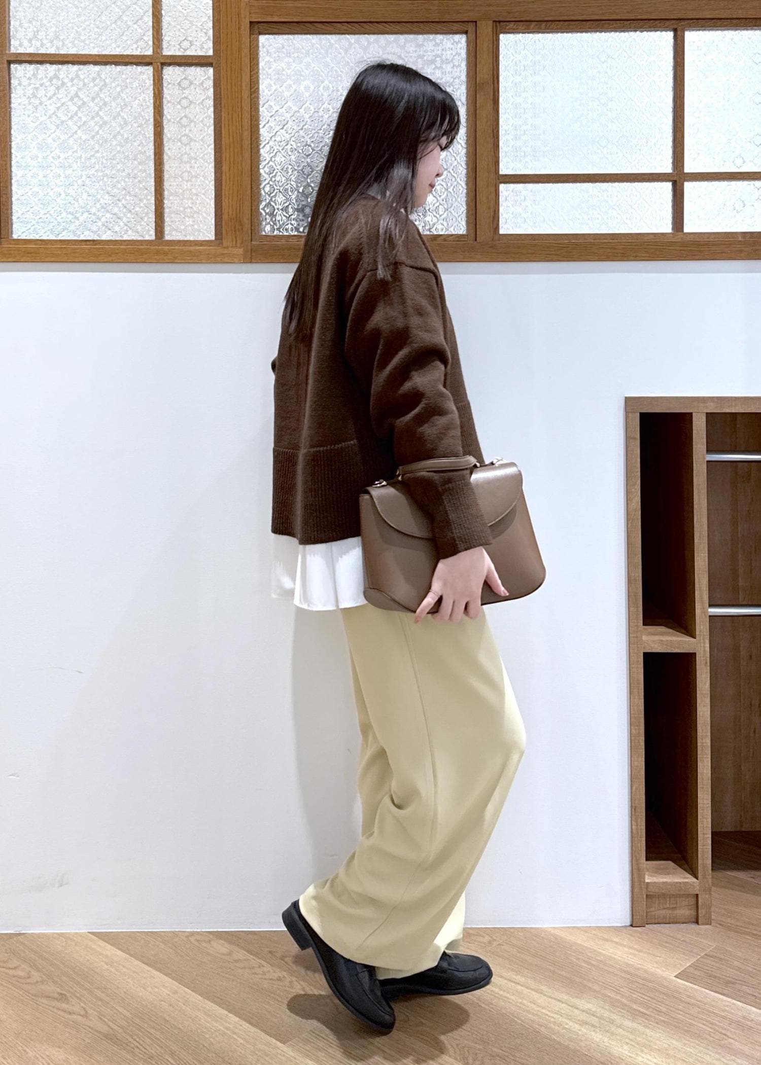 今季流行りのブラウンとイエローを使ったチョコバナナの色味のコーディネートです。