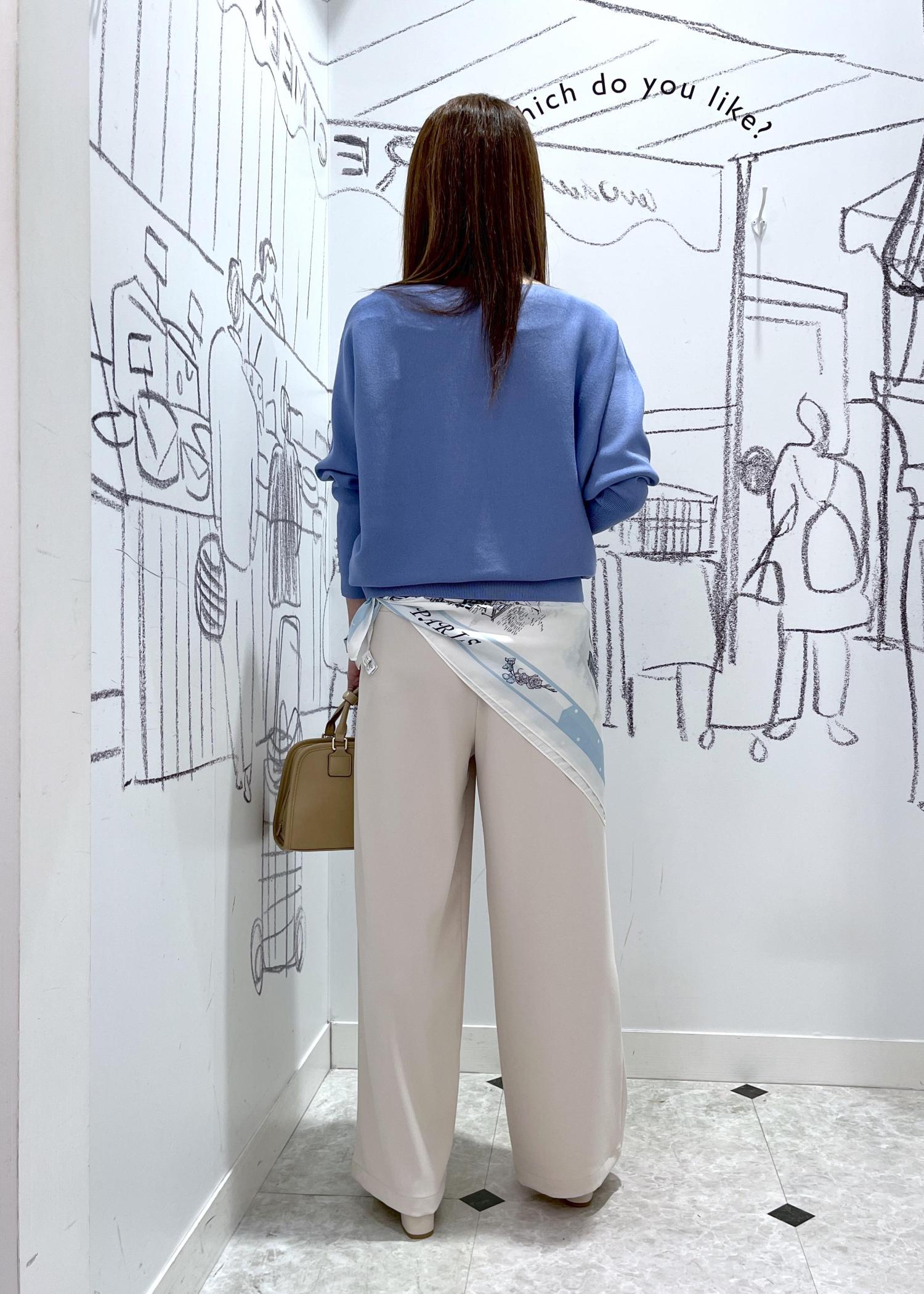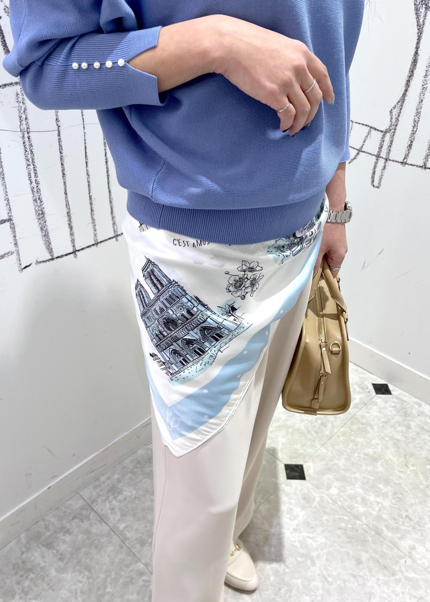着心地が楽でおしゃれに見える春コーデです。身幅ゆったりのドルマンニットに、ウエストゴムで楽な履き心地のワイドパンツを合わせてます。そのままでもシンプルで良いですが、スカーフをプラスするとおしゃれ見えしておすすめです。