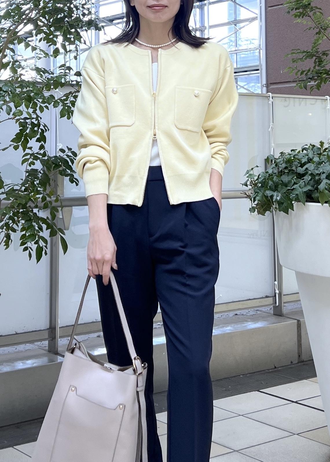 春らしい明るいイエローのニットカーディガンは、きれいめカジュアルにも使えるのでお仕事コーデにもおすすめ。