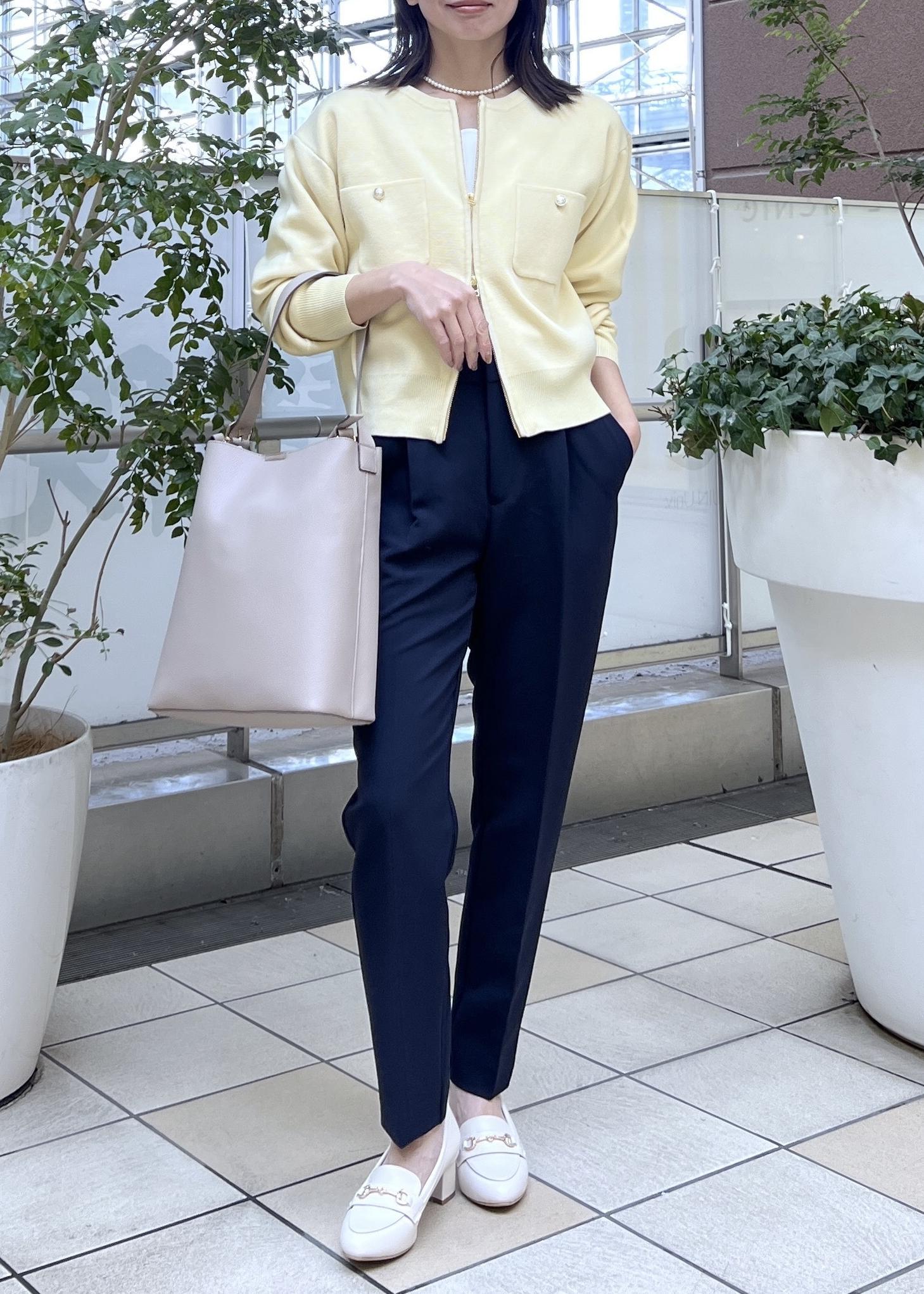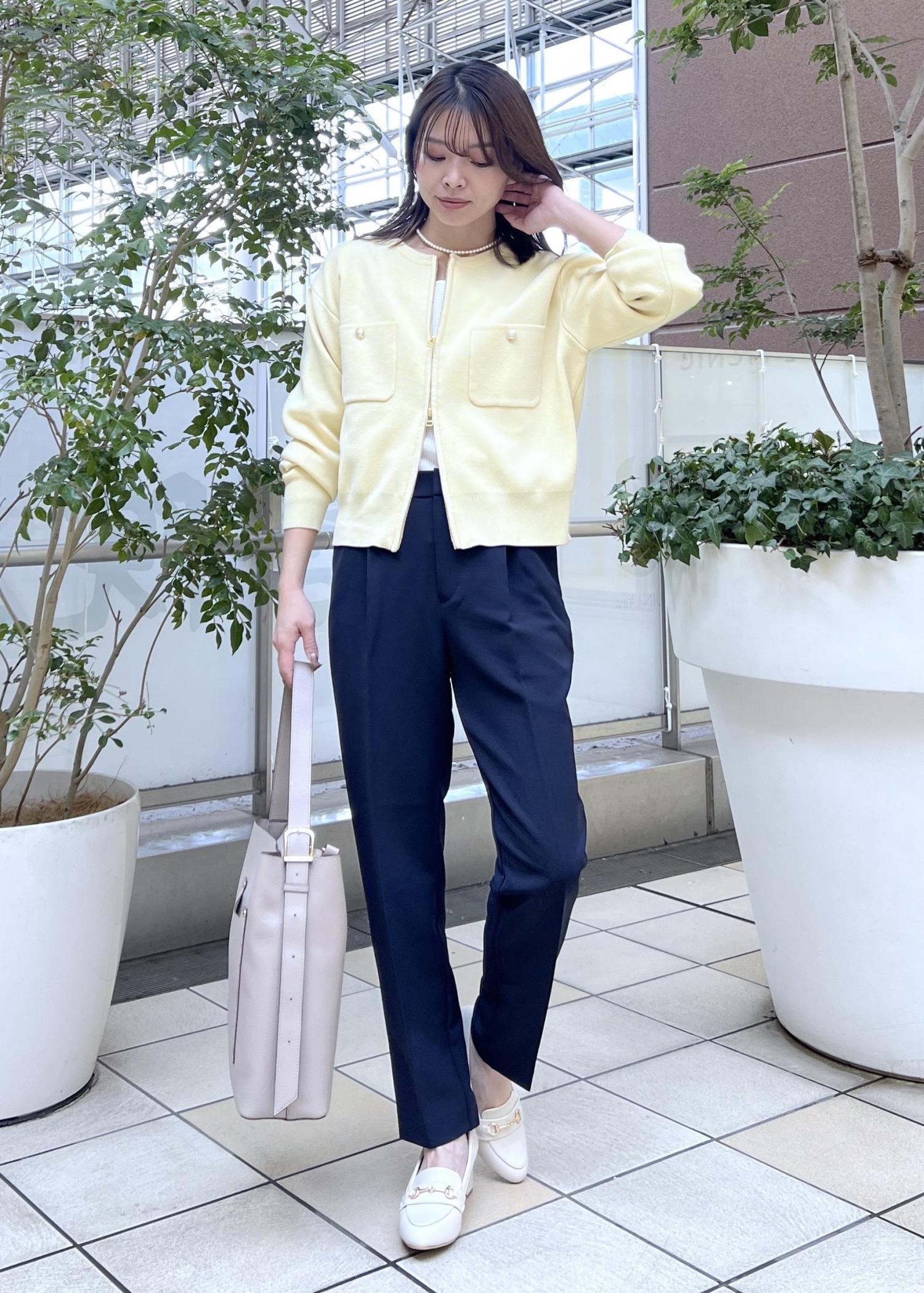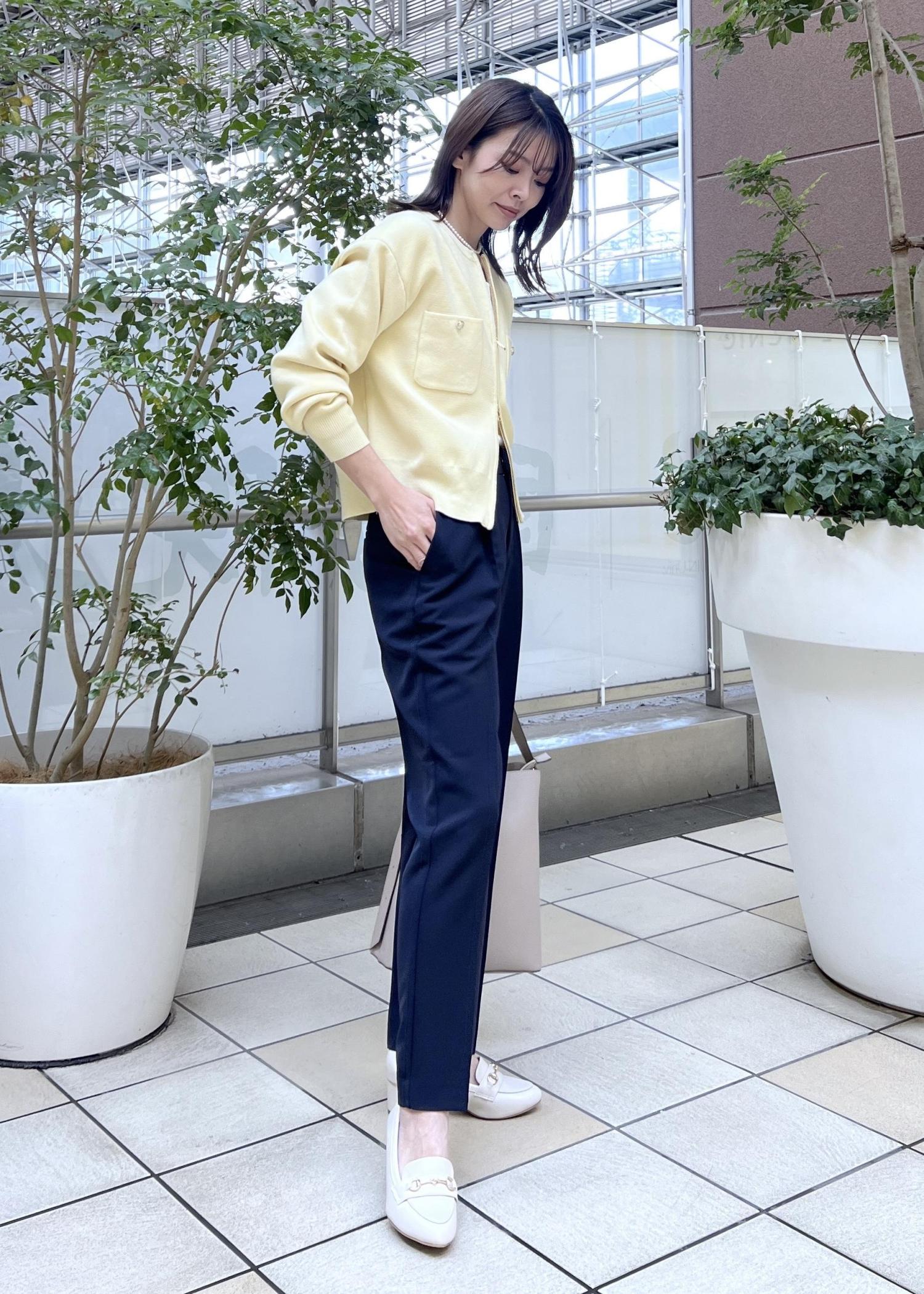 イエローには引き締めてくれるネイビーを合わせて、大人のきれいめスタイルの完成です◎。