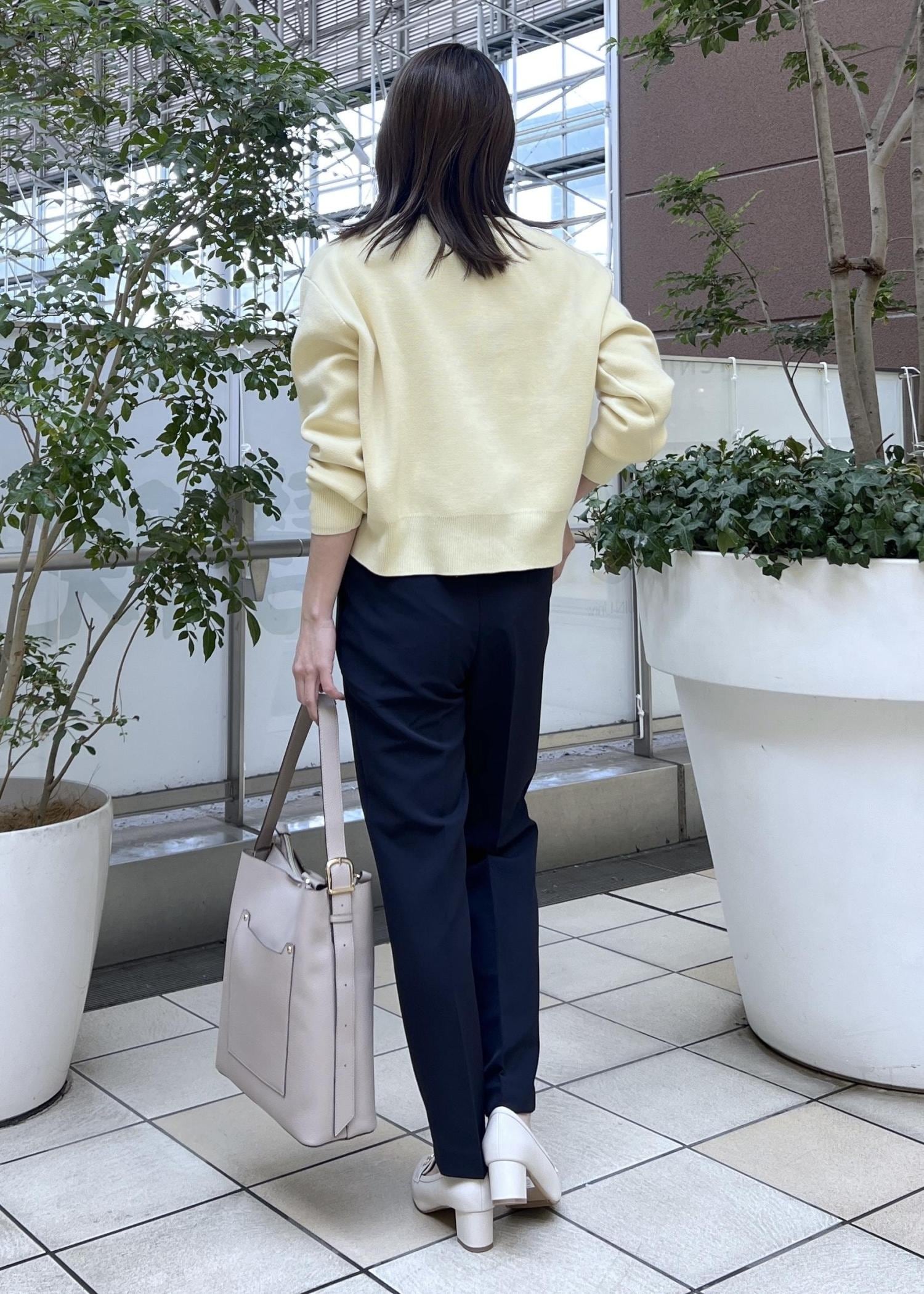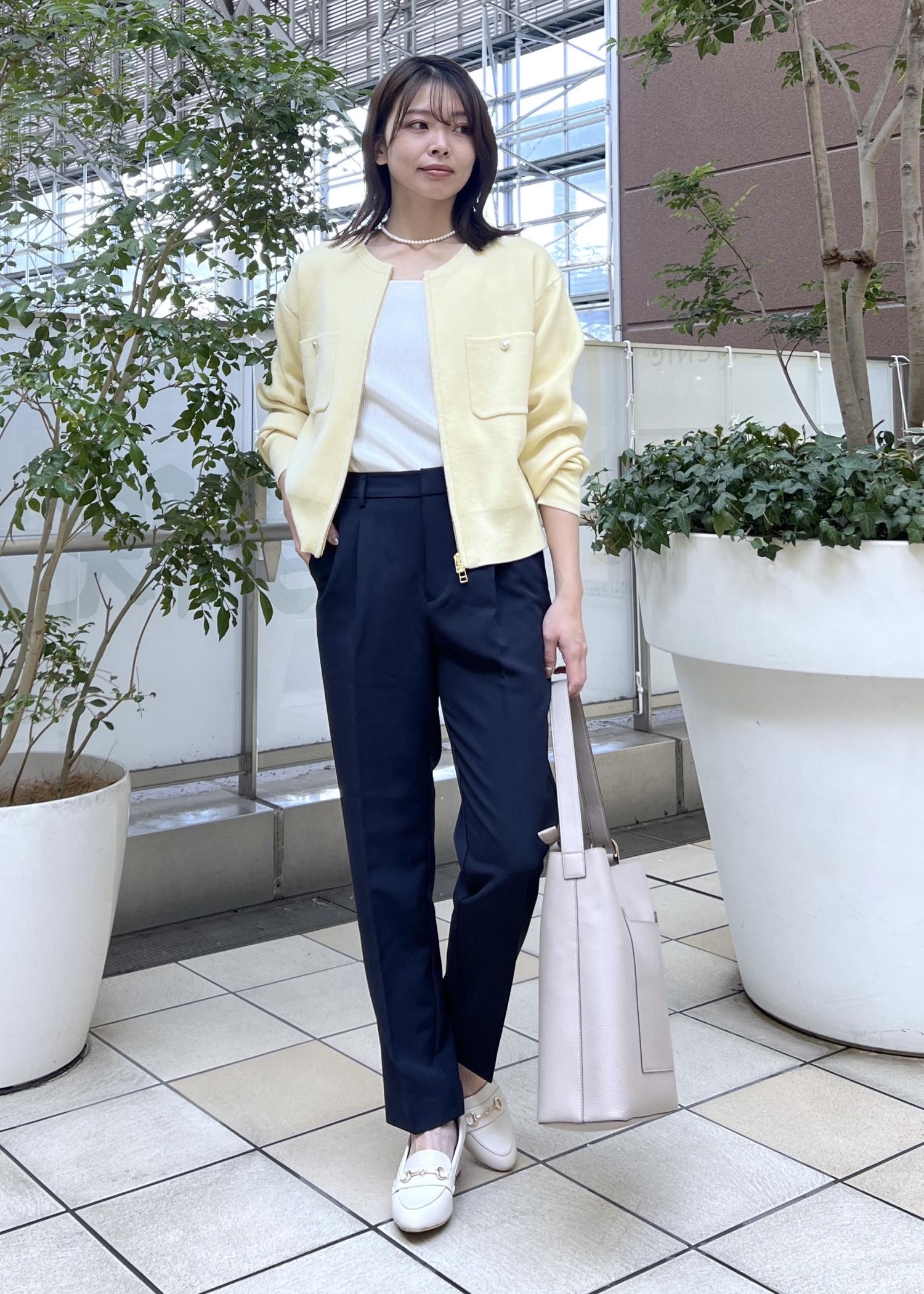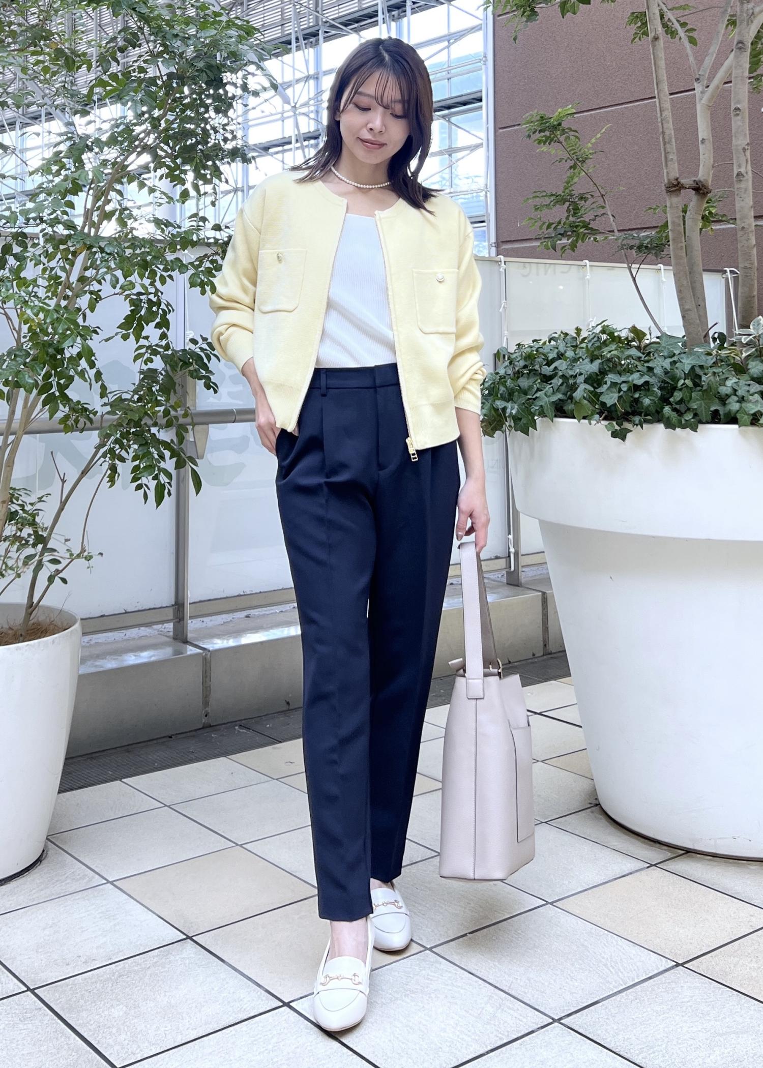 イエローには引き締めてくれるネイビーを合わせて、大人のきれいめスタイルの完成です◎。