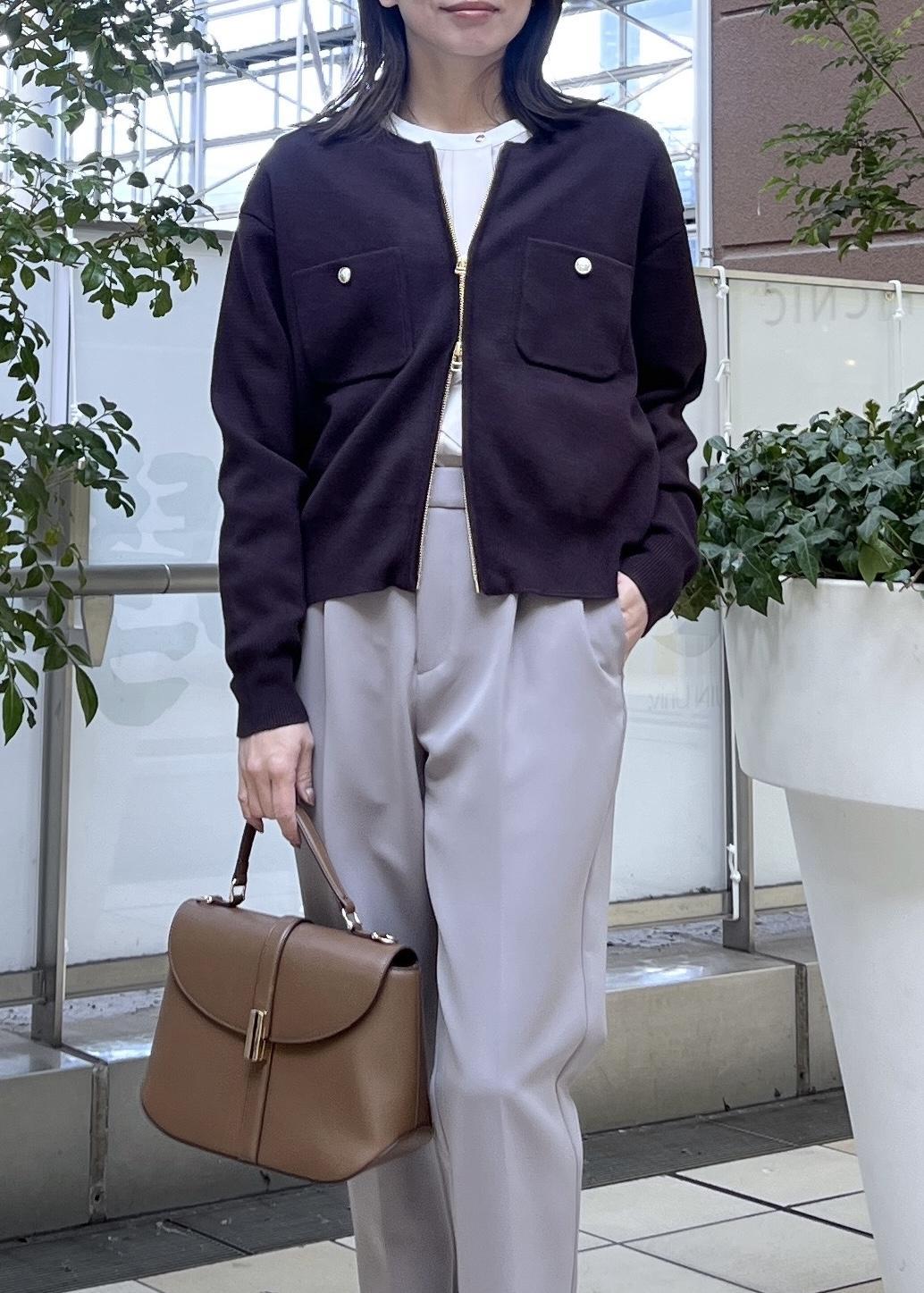 Wファスナーのデザインのカーディガンは、裾側を少し開いて抜け感を出すのも◎