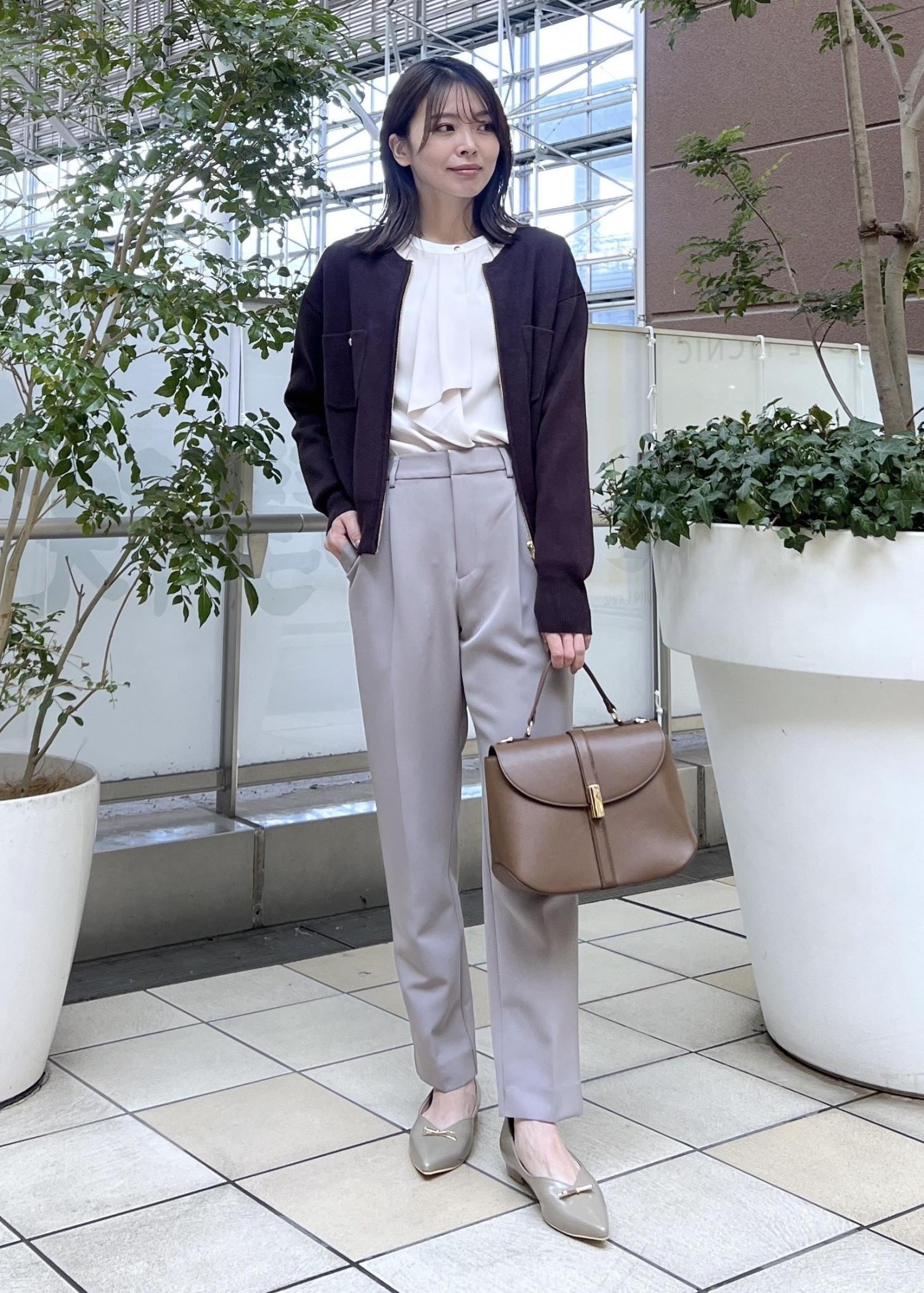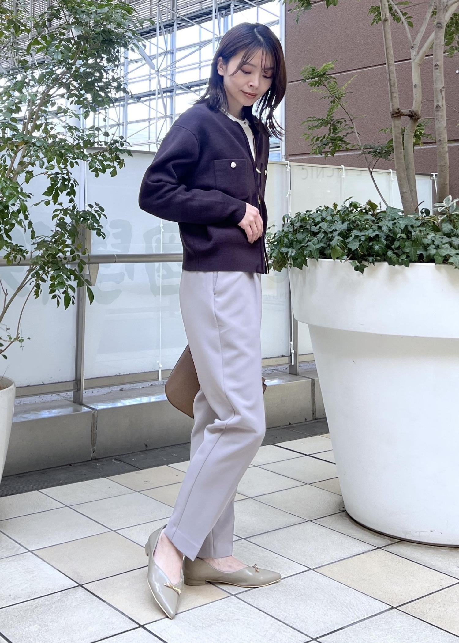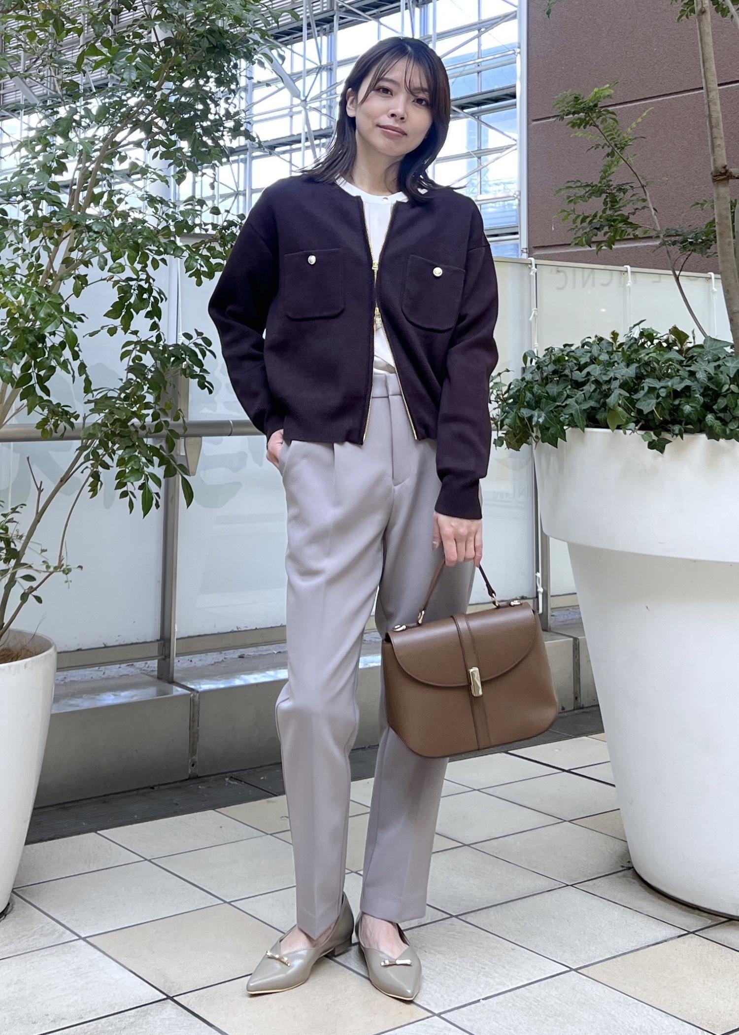 ブラウンのカーディガンにはベージュカラーを合わせて、柔らかさのある女性らしいスタイリングにしました。