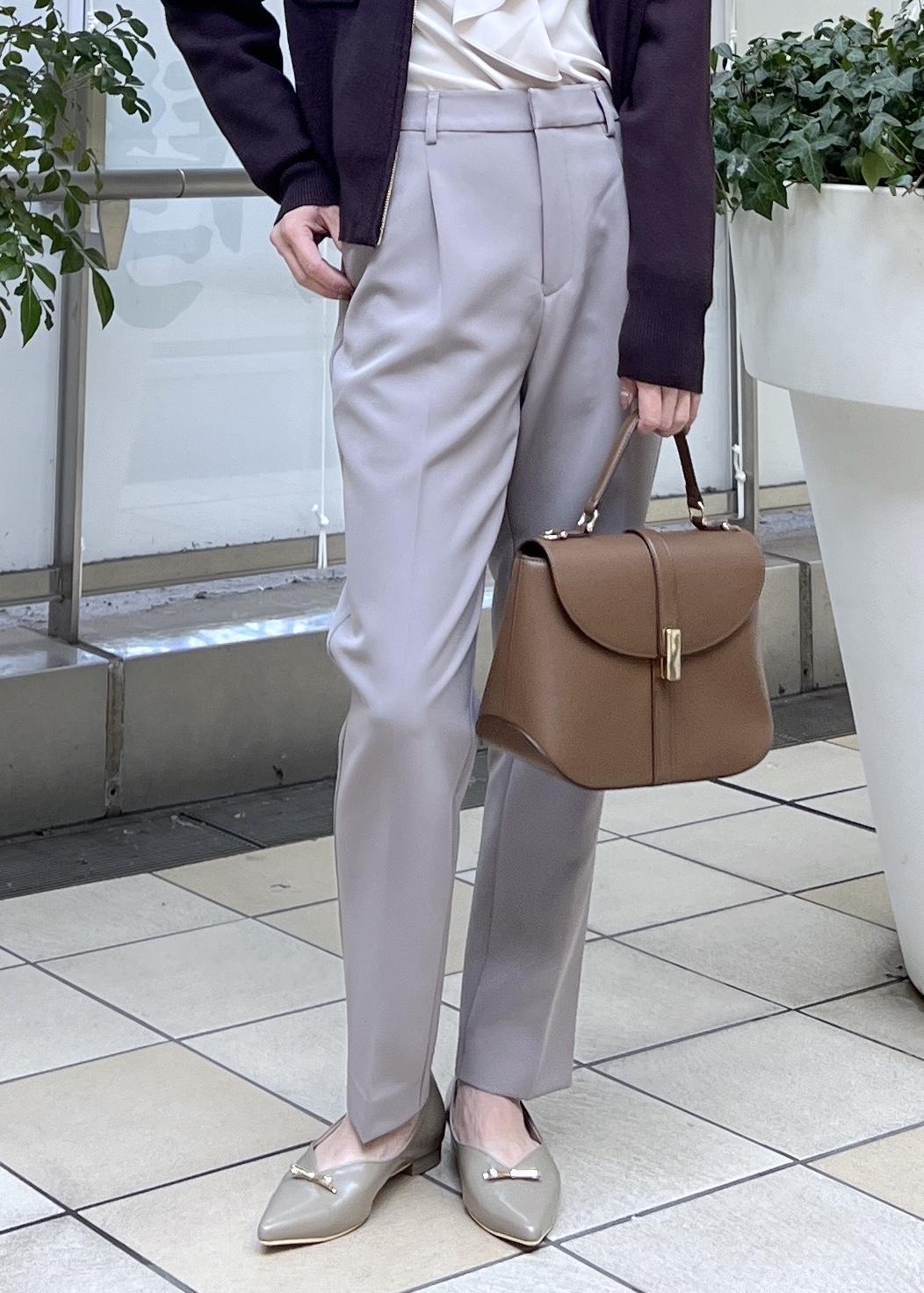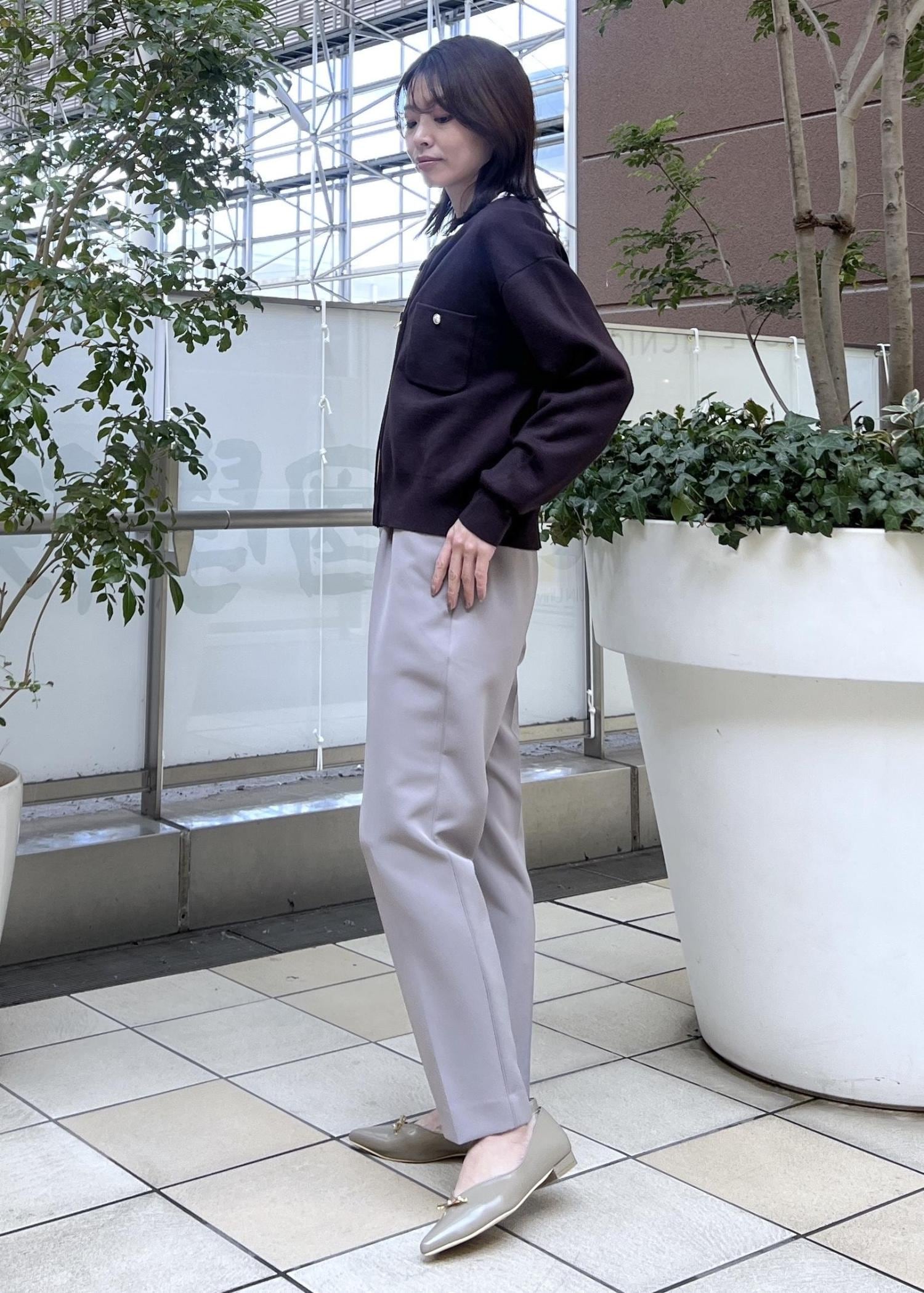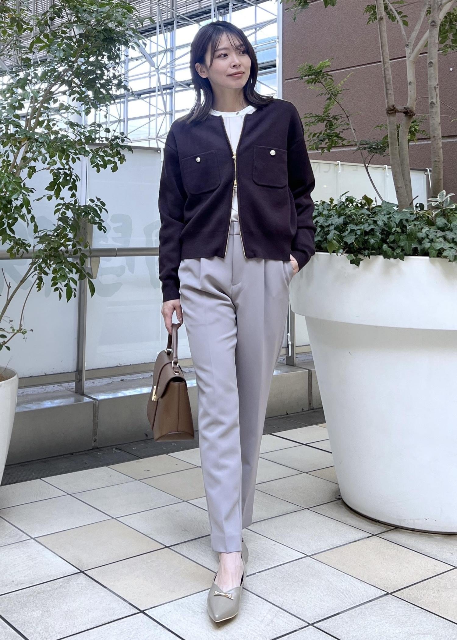 ブラウンのカーディガンにはベージュカラーを合わせて、柔らかさのある女性らしいスタイリングにしました。