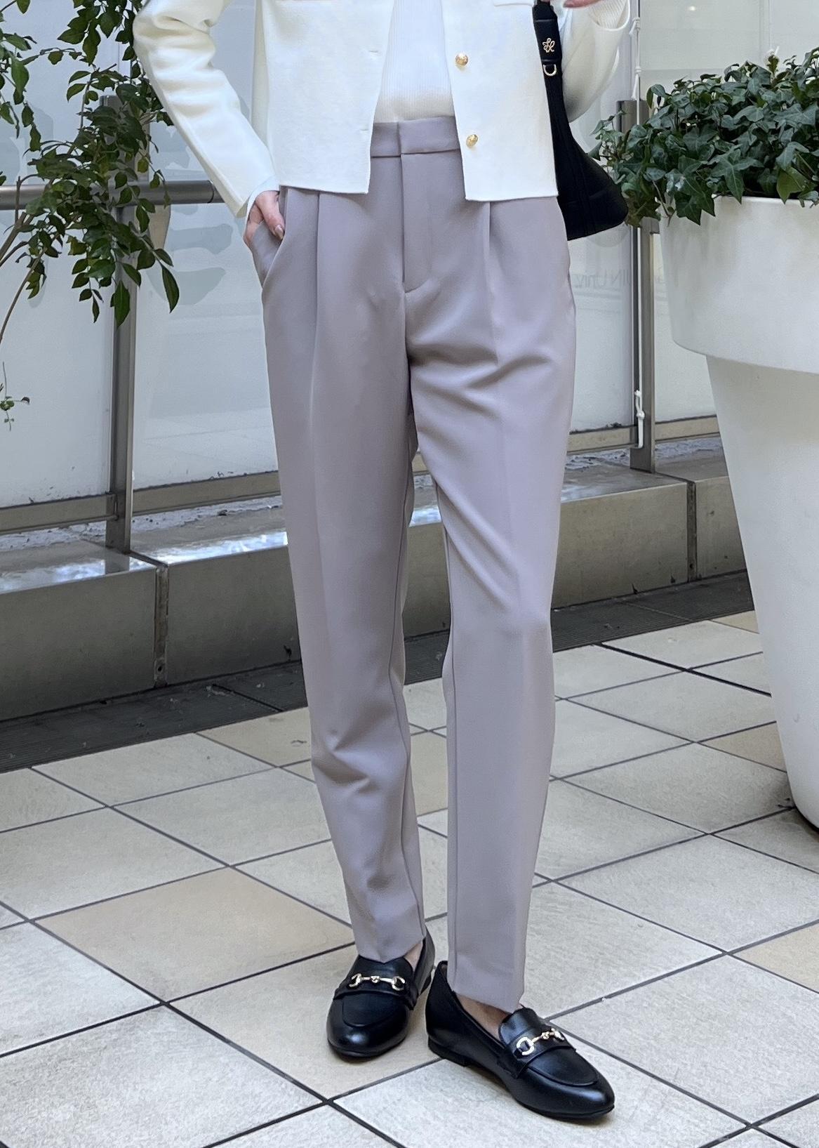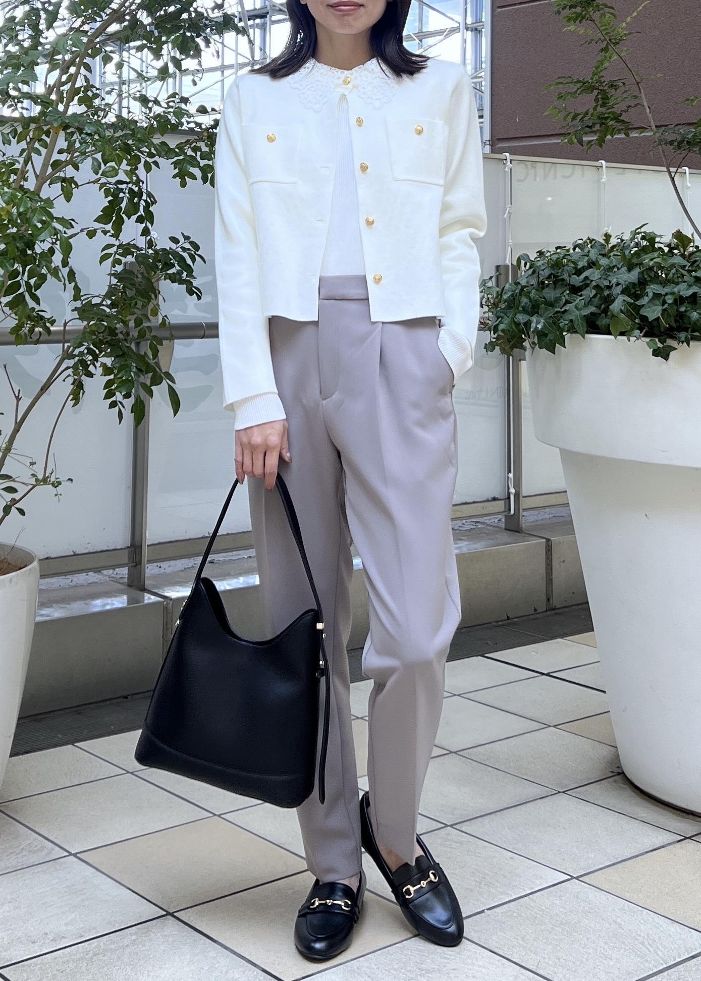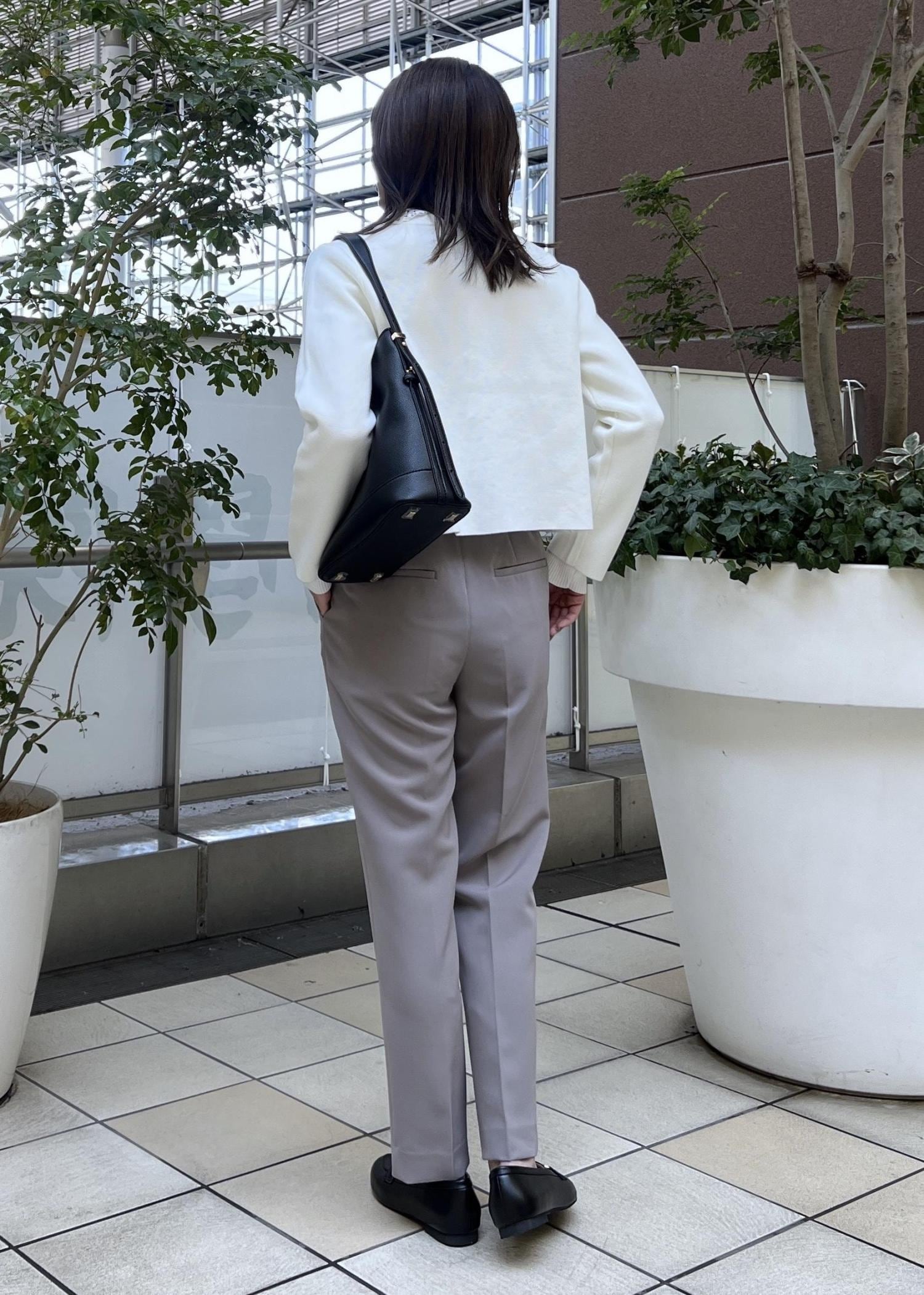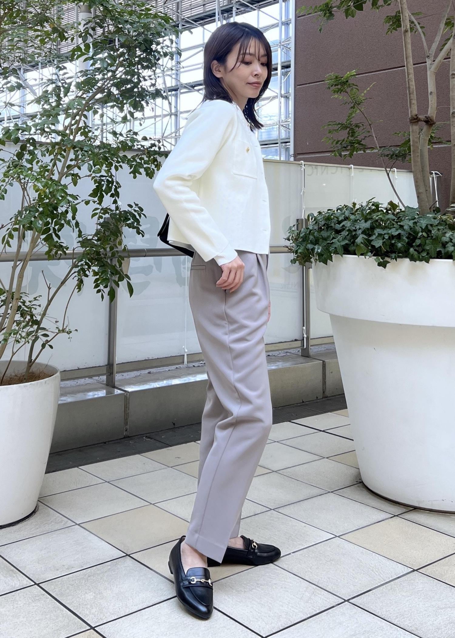 ベージュのテーパードパンツで、動きやすいお仕事コーデの完成です。