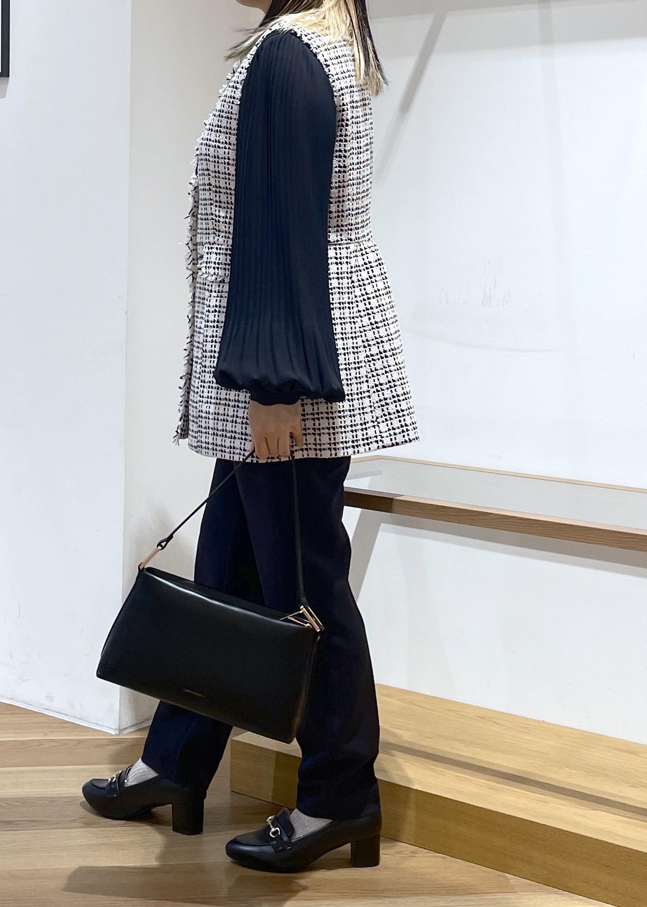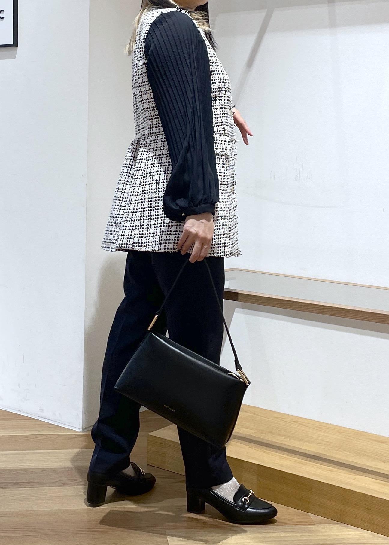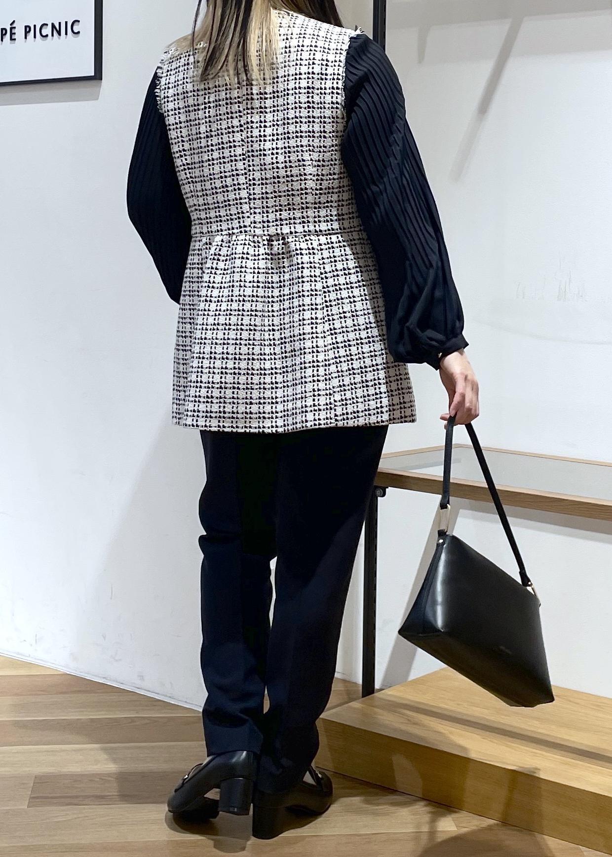 セレモニーにも普段にも着用していただける万能ツイードジレベストです。ウエストのギャザーの切り返しがふわりとしていて、お腹とお尻のカバーができちゃいます○