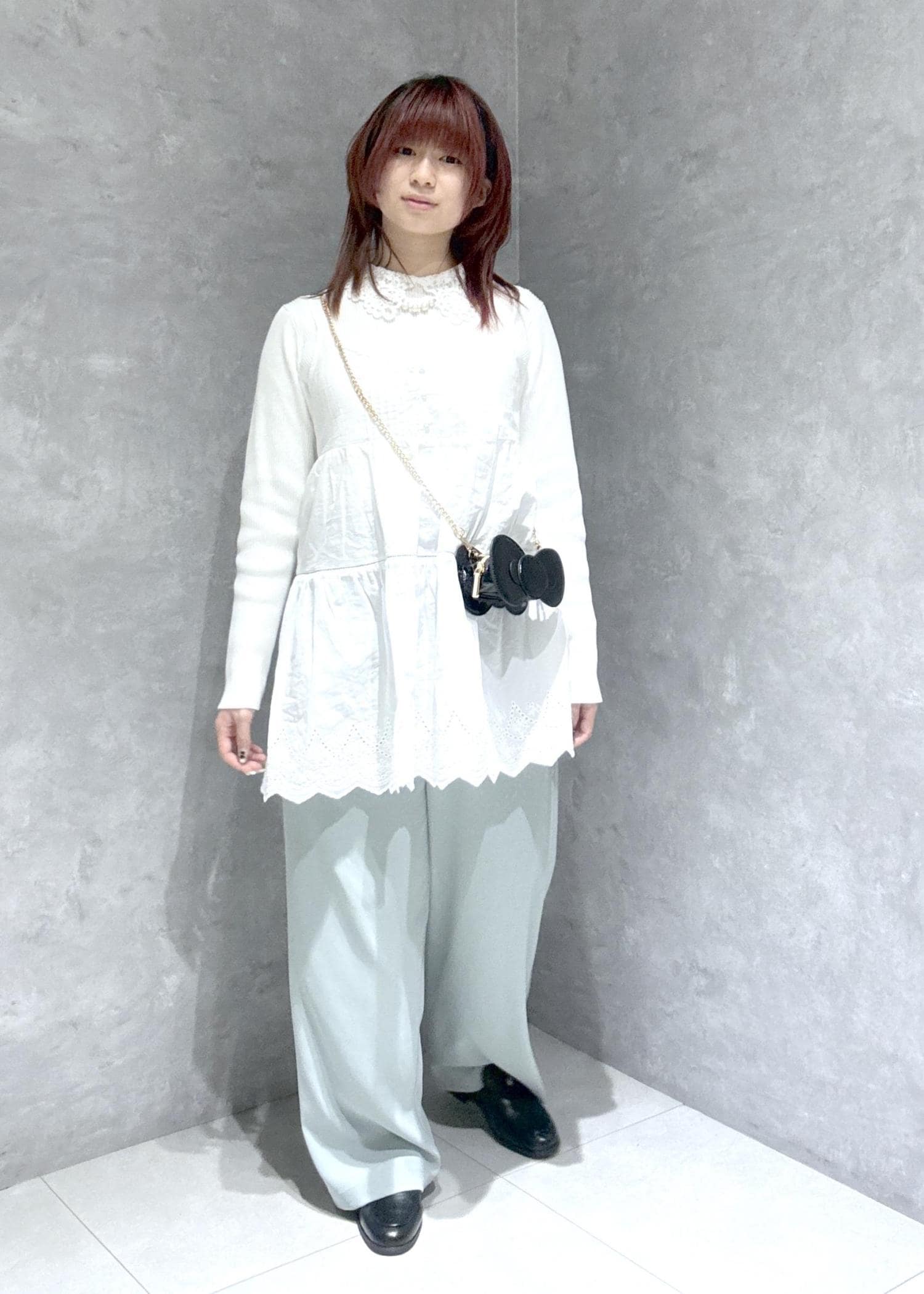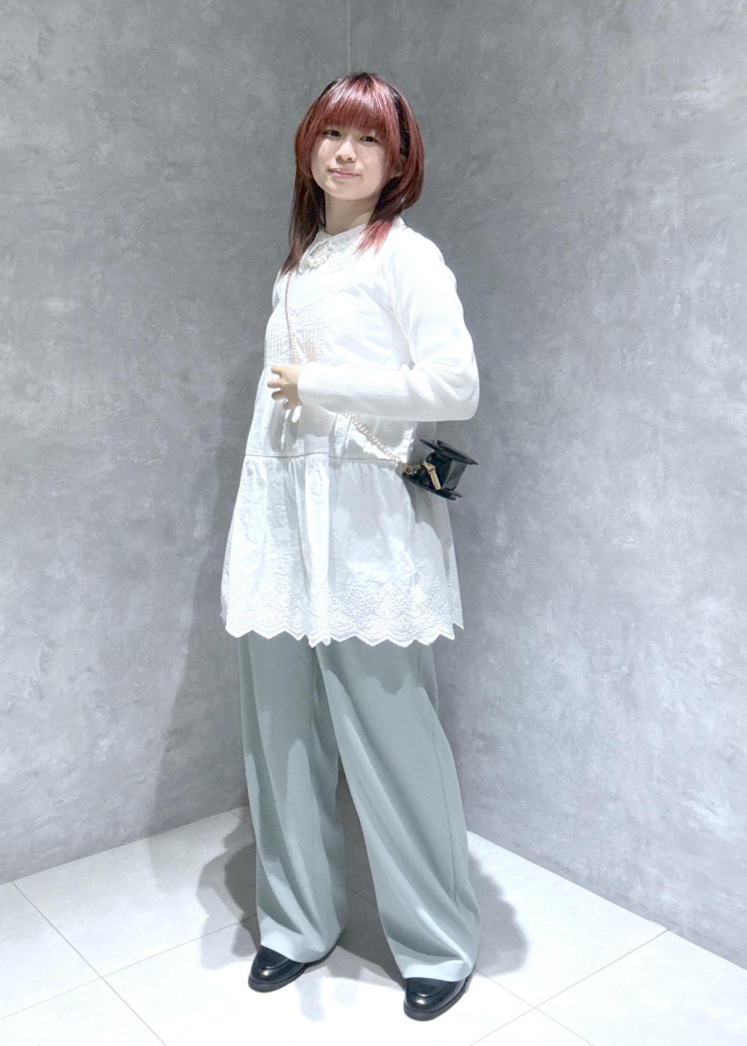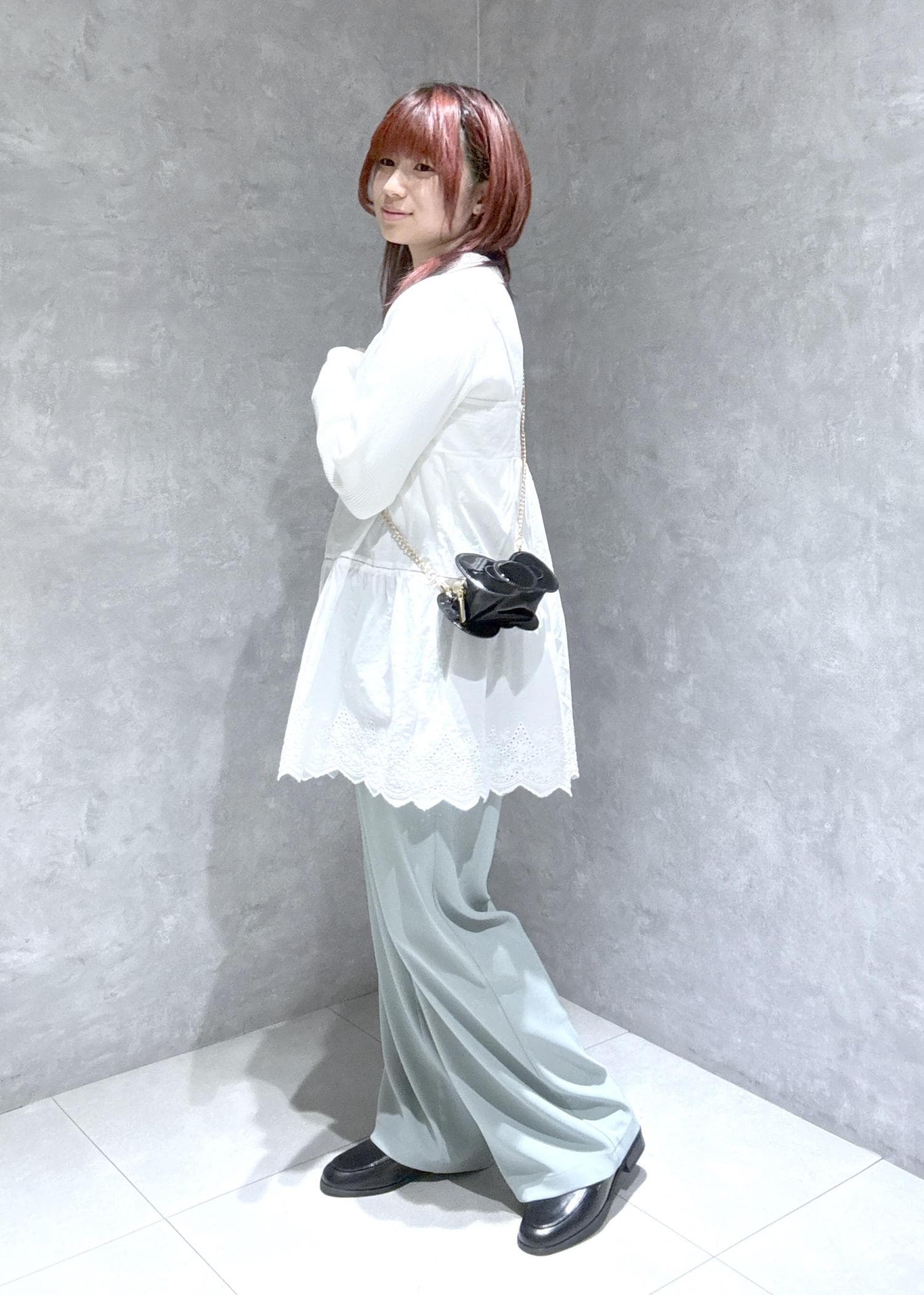 全体的に白やブルーで明るめの色を取り入れつつ、黒のバッグとローファーで全体を締めました。可愛さもありながらもカジュアルなパンツと合わせて、お出かけこーでにしました。