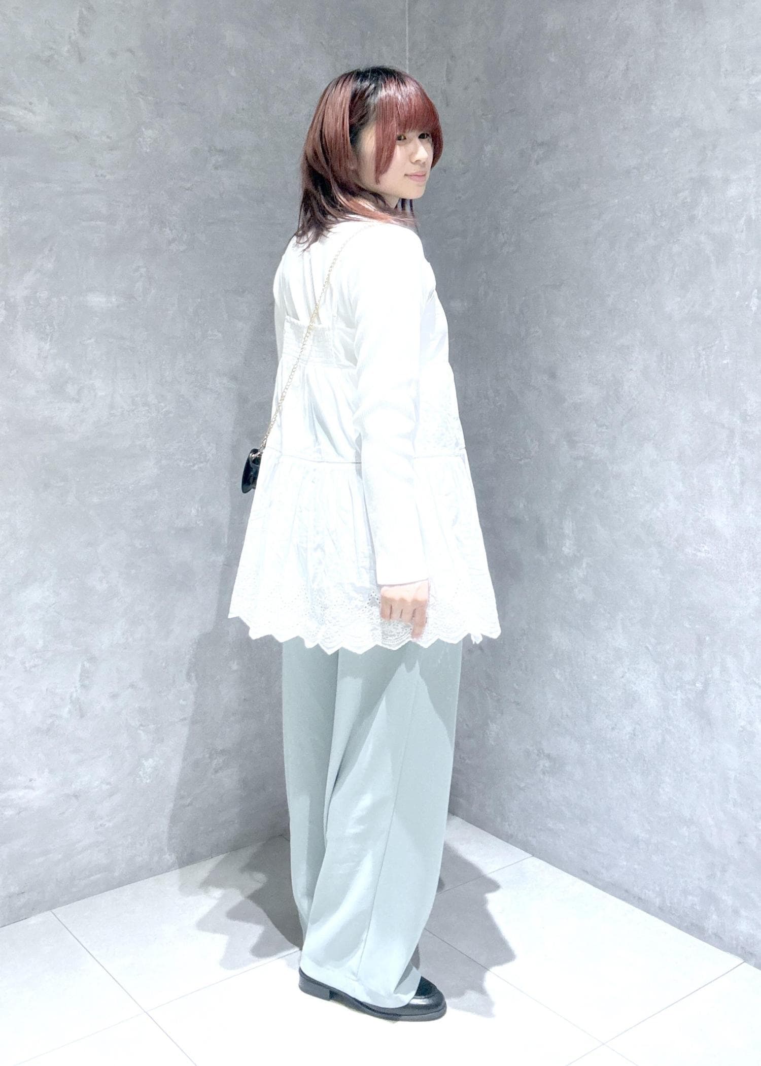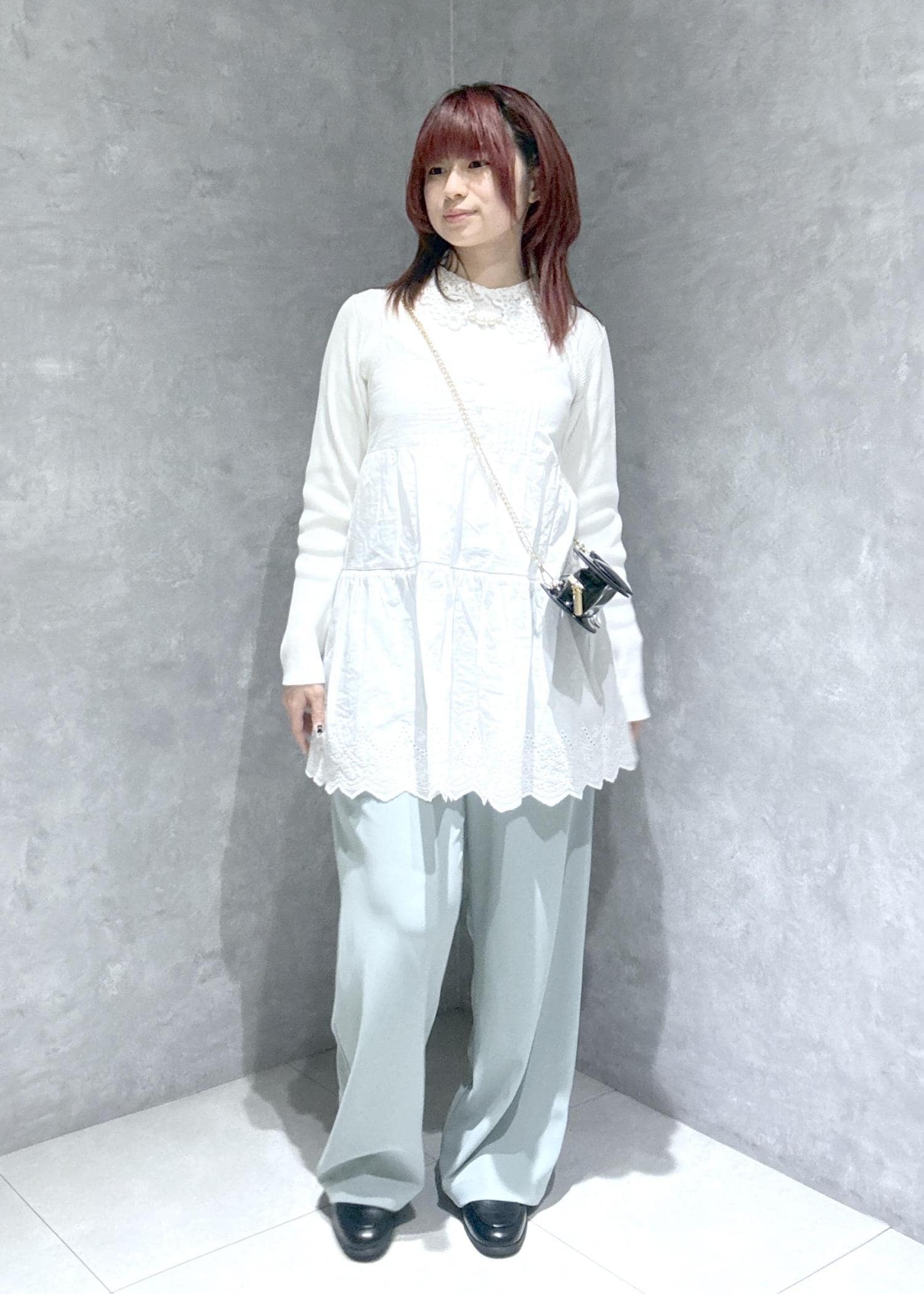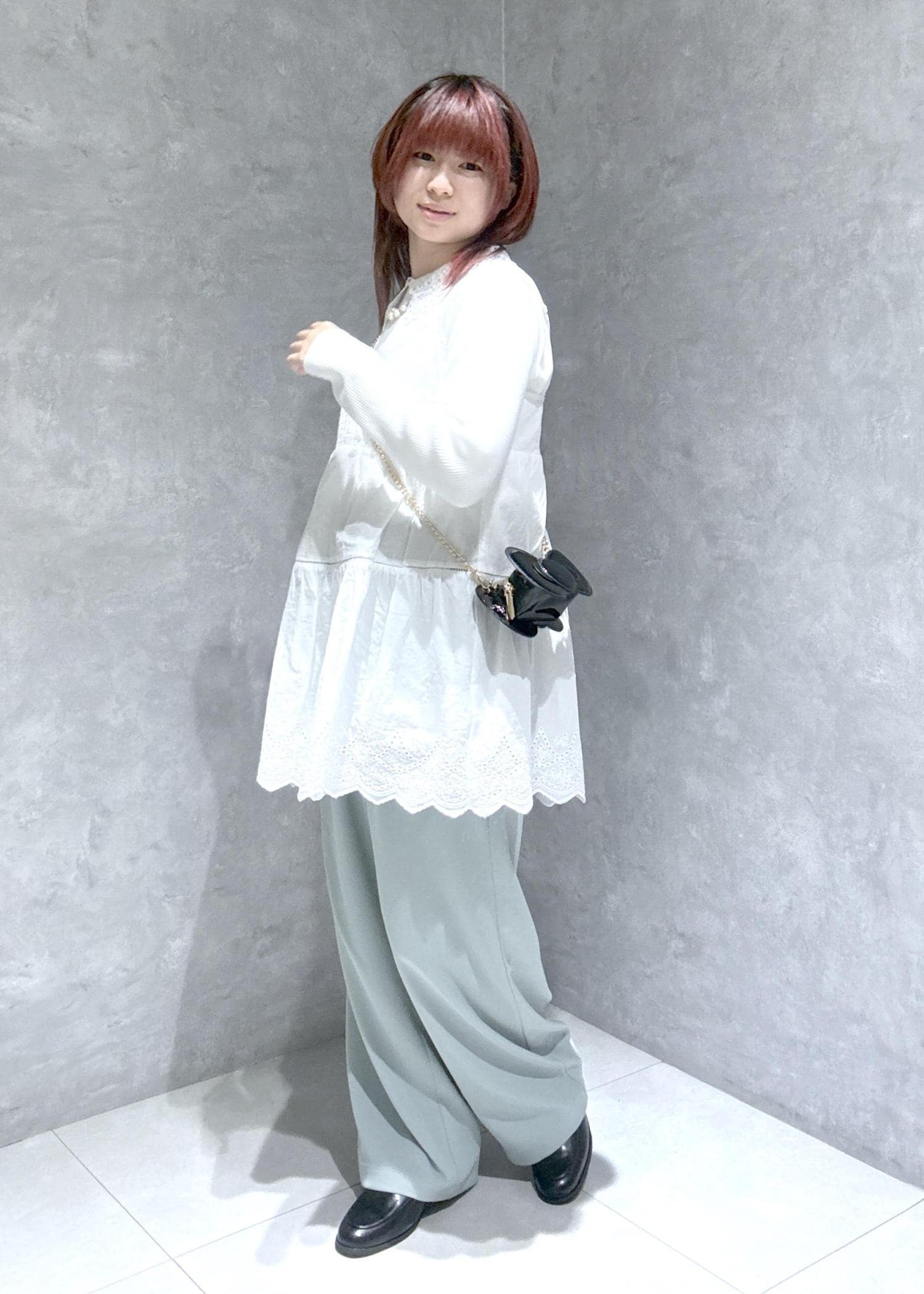 全体的に白やブルーで明るめの色を取り入れつつ、黒のバッグとローファーで全体を締めました。可愛さもありながらもカジュアルなパンツと合わせて、お出かけこーでにしました。