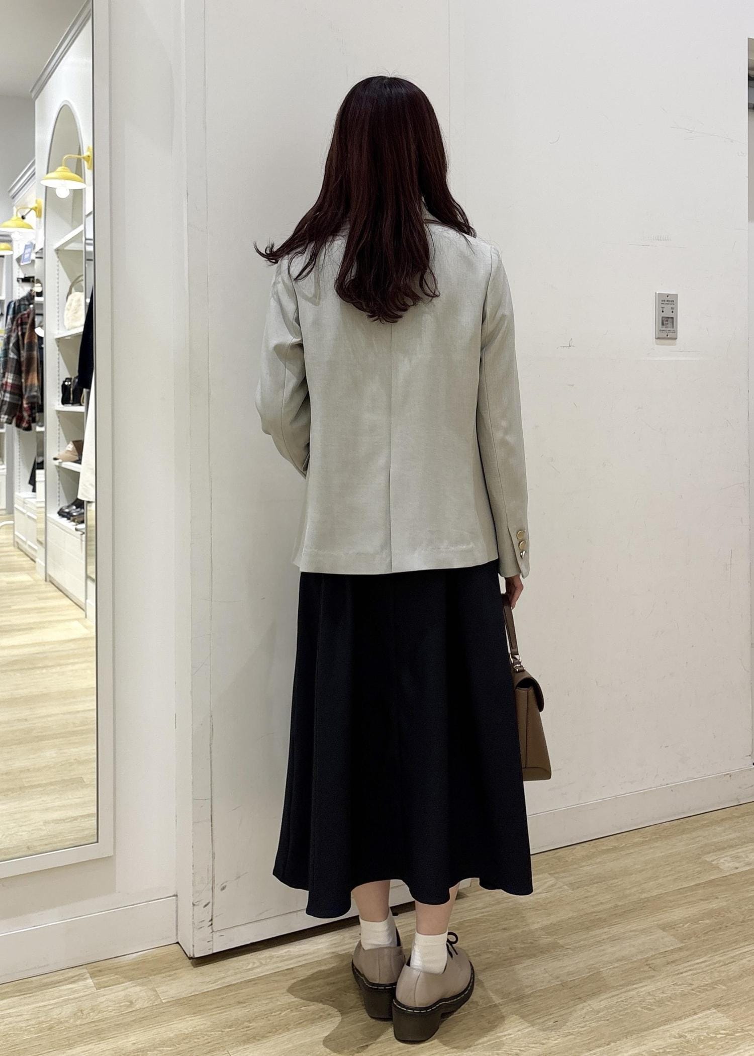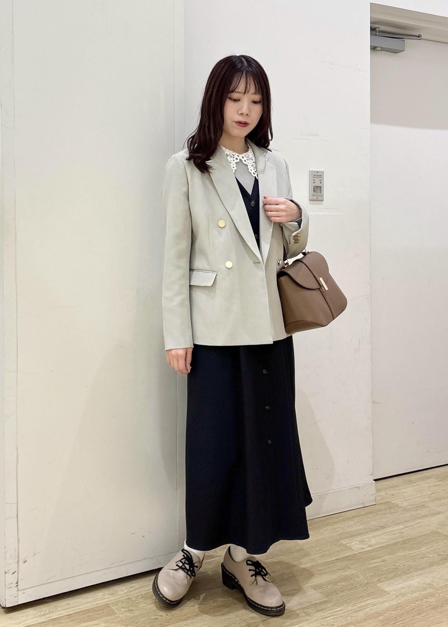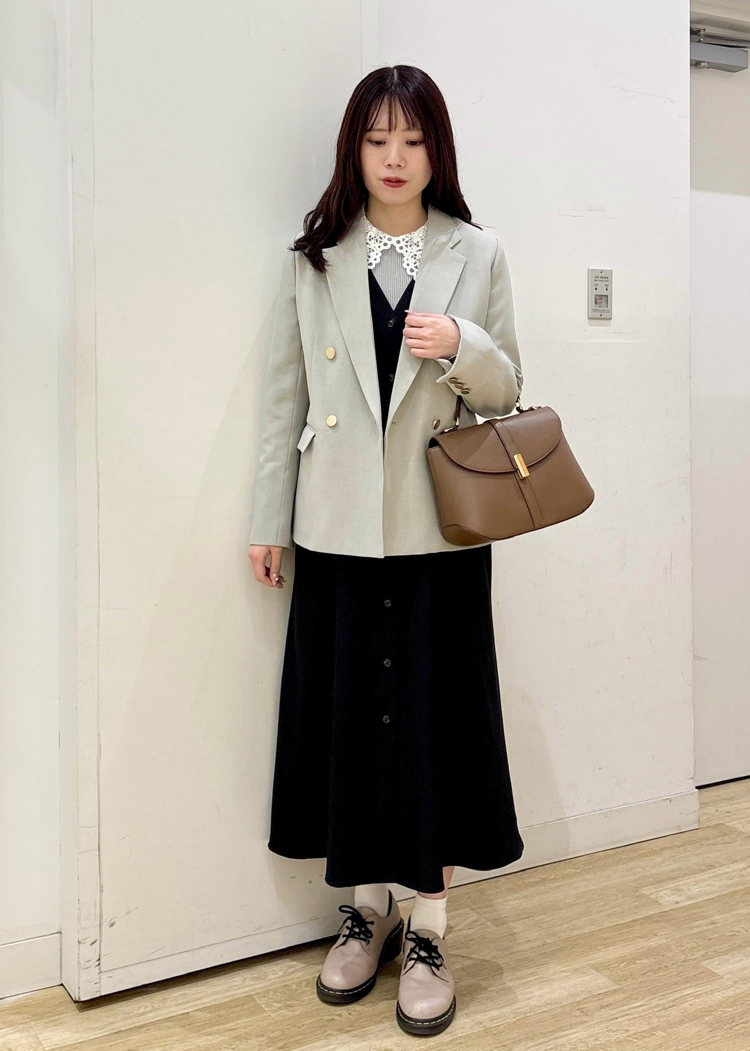 レースカラーニットにネイビーのジャンスカ、グリーンのジャケットを合わせて入学式にも使えるコーディネートに仕上げました◎