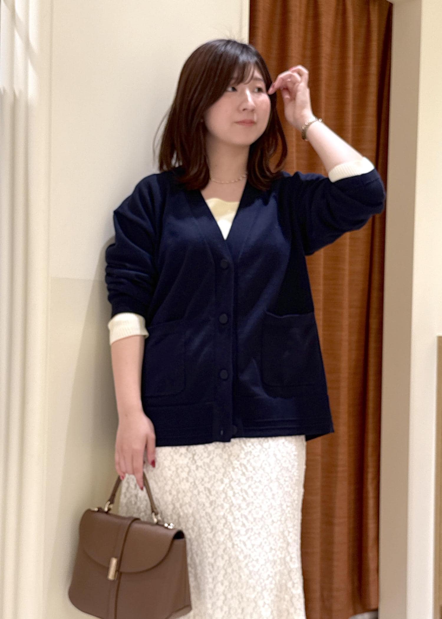シンプルなカーディガンは合わせ方によっては地味見えしてしまうので、インナーをスクエアにして顔周りに抜け感を出したり、アクセサリーをつけて華やかにしたり…。
