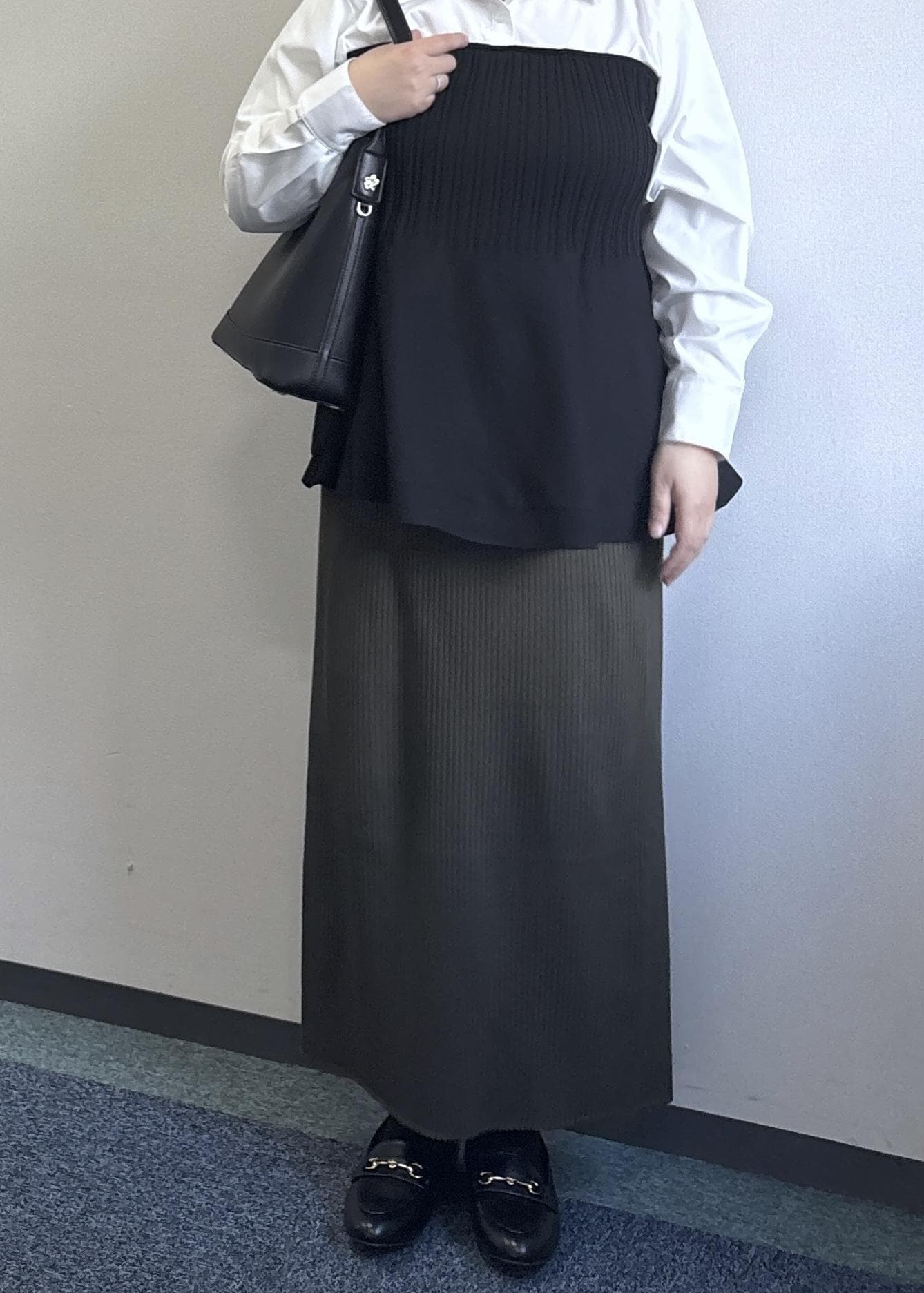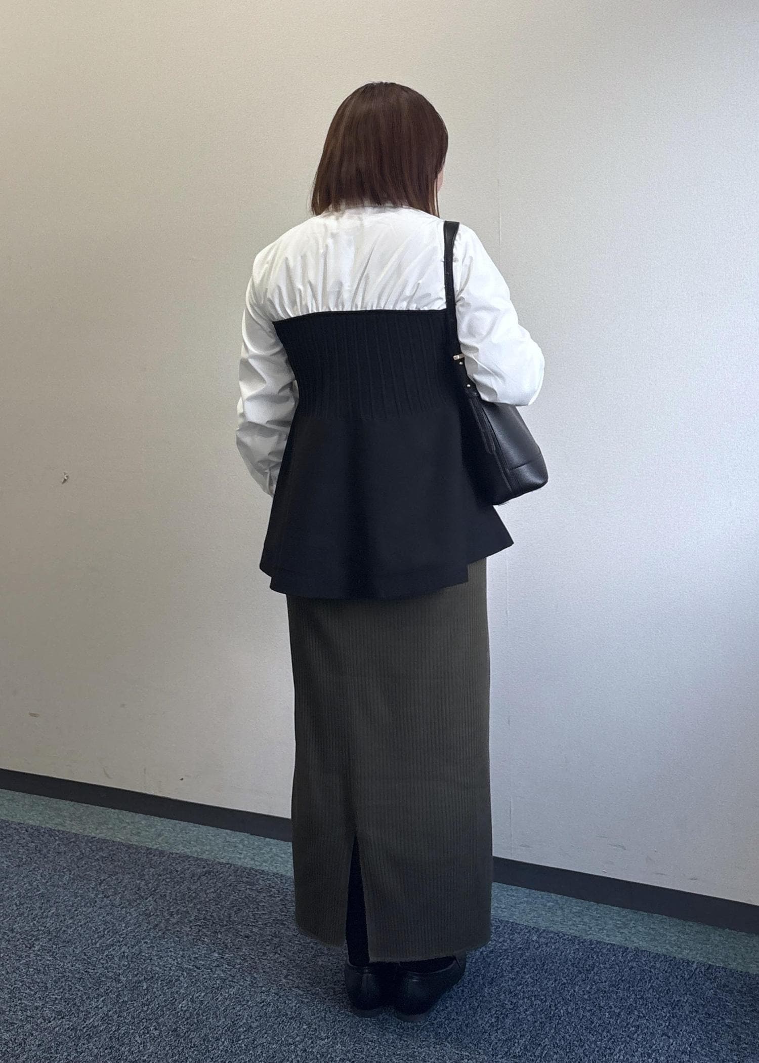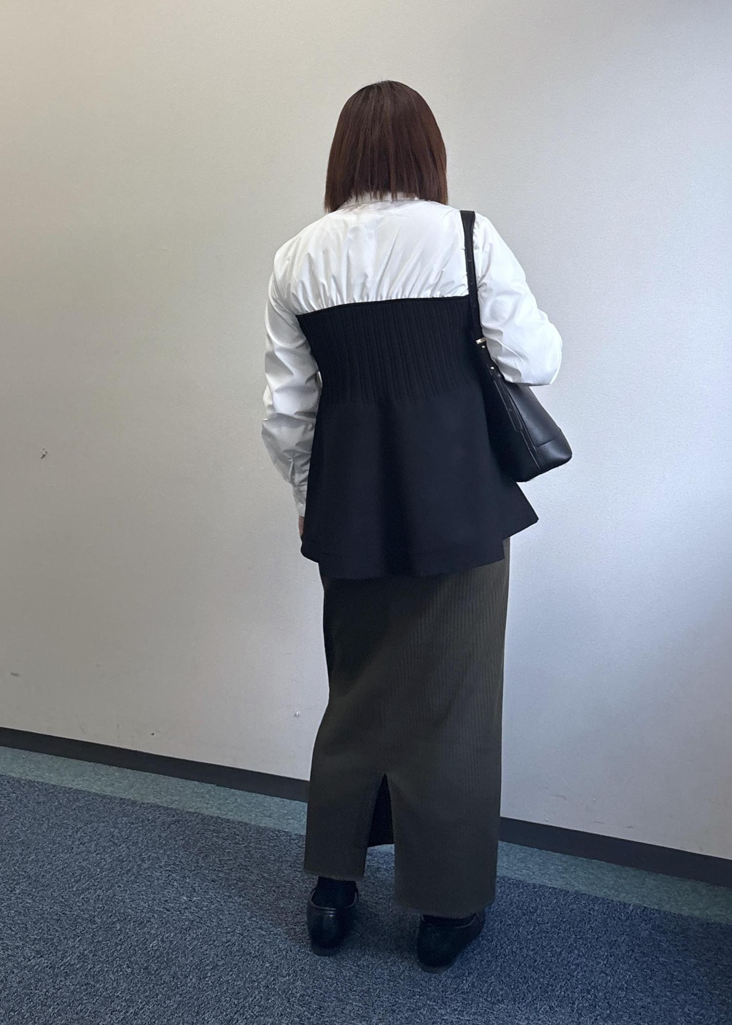 1枚でオシャレにきまるシャツドッキングペプラムニットにIラインスカートを合わせました。