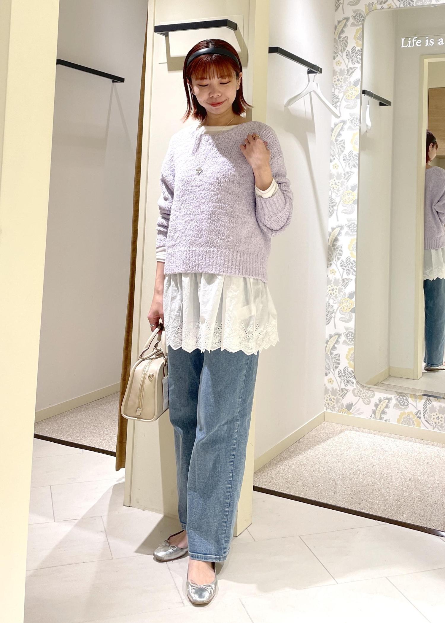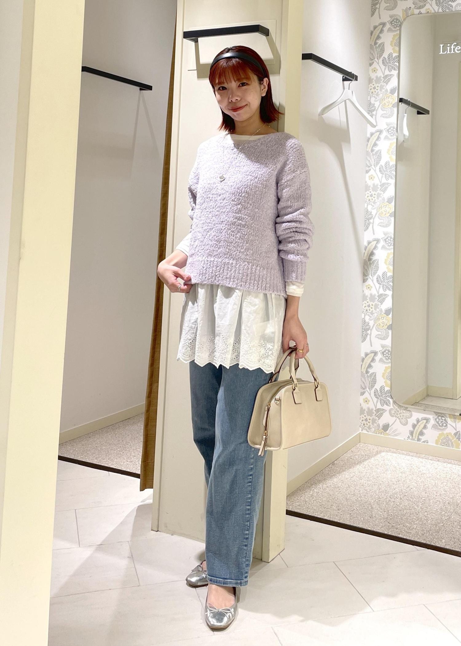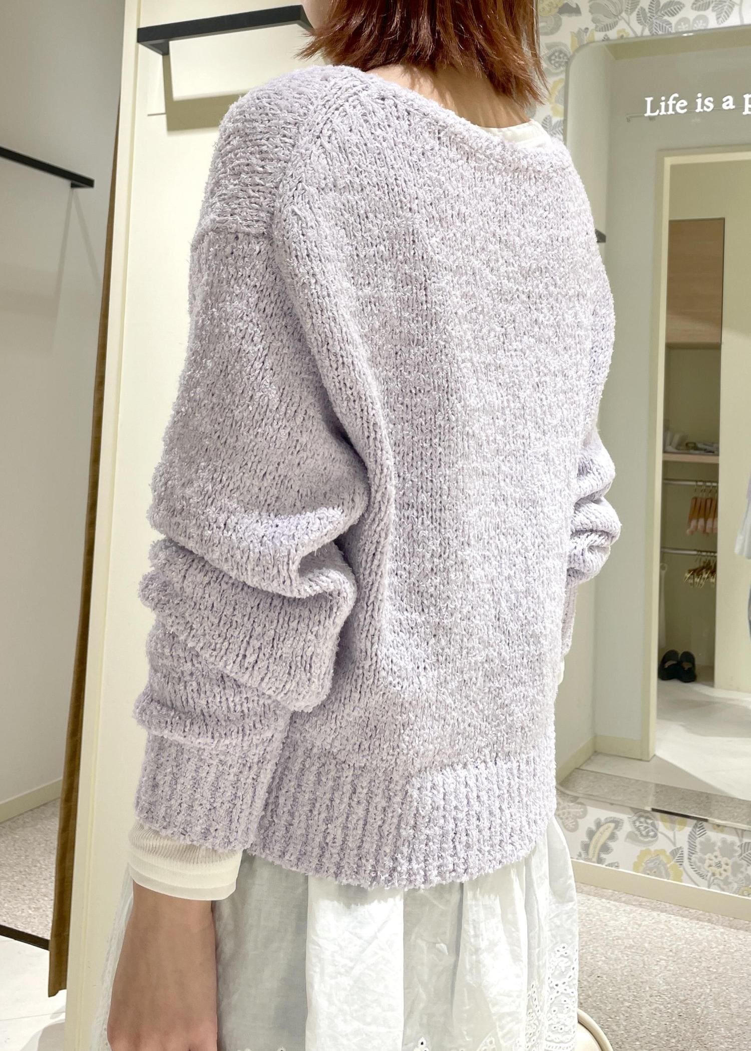 さりげないラメ感がポイントの春らしいラベンダーカラーニット