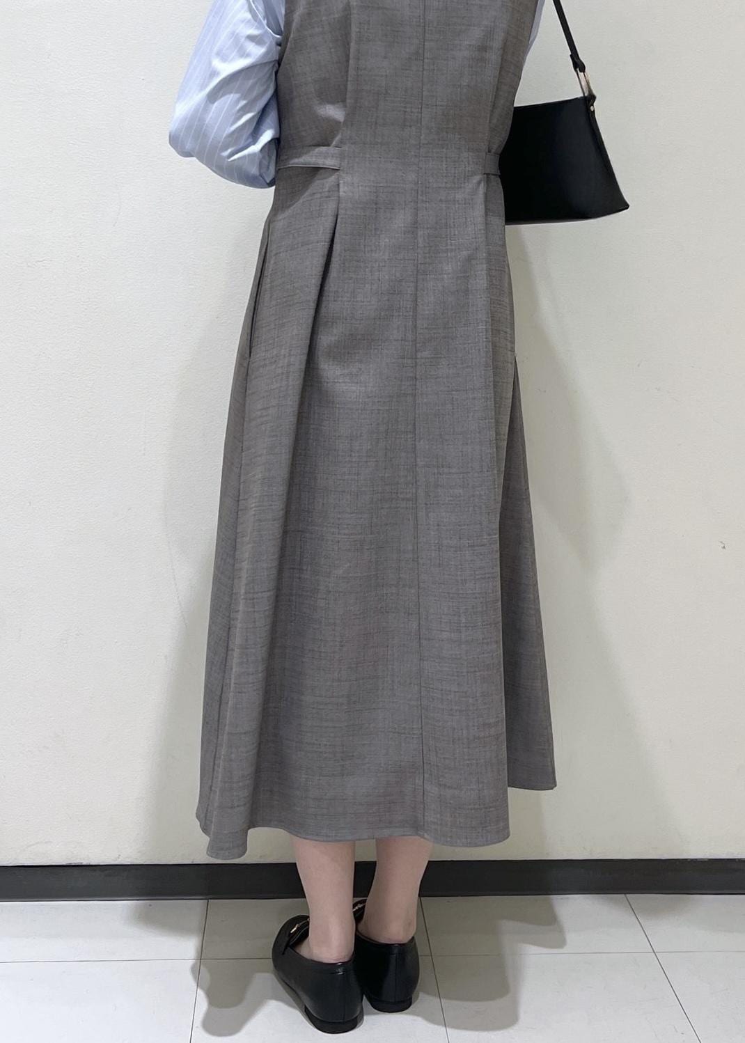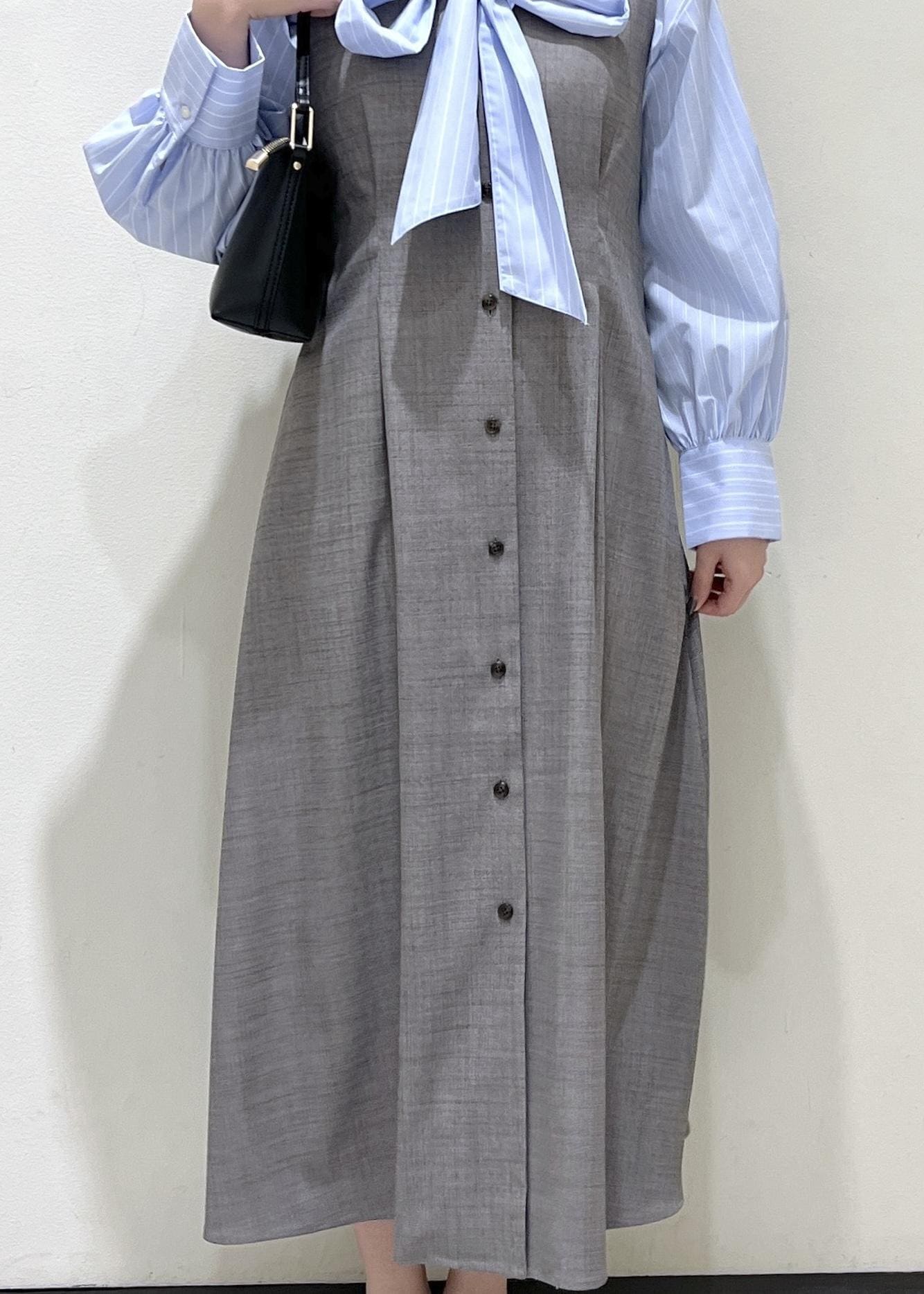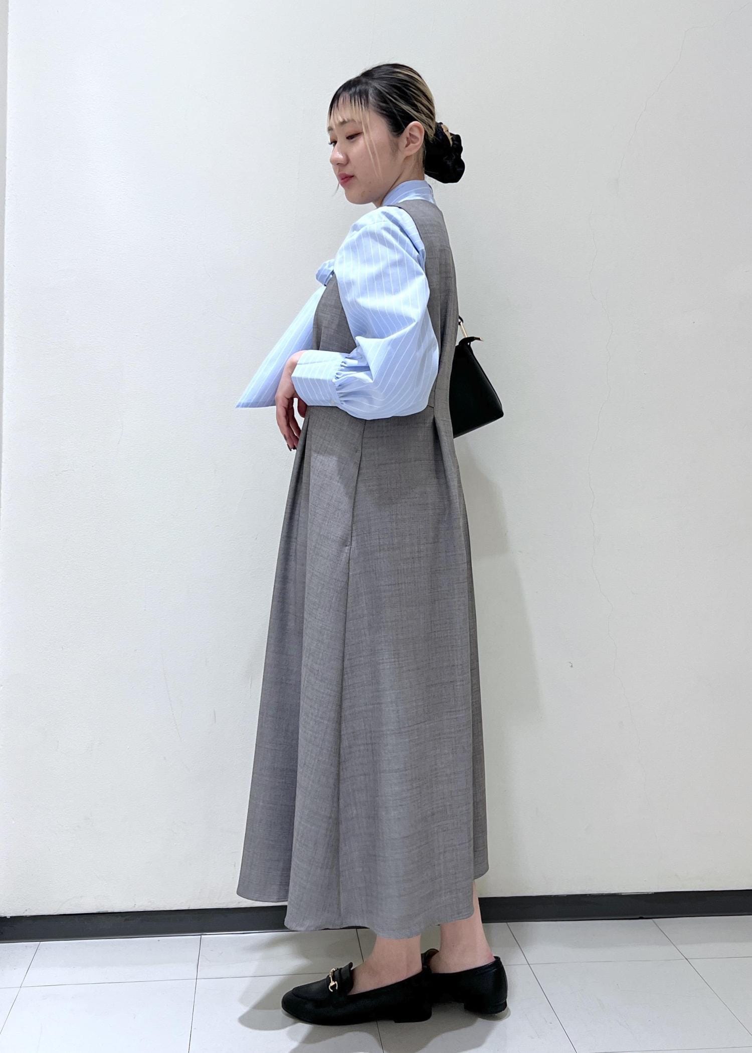 グレーのジャンパースカートと合わせると甘すぎないバランスになります。