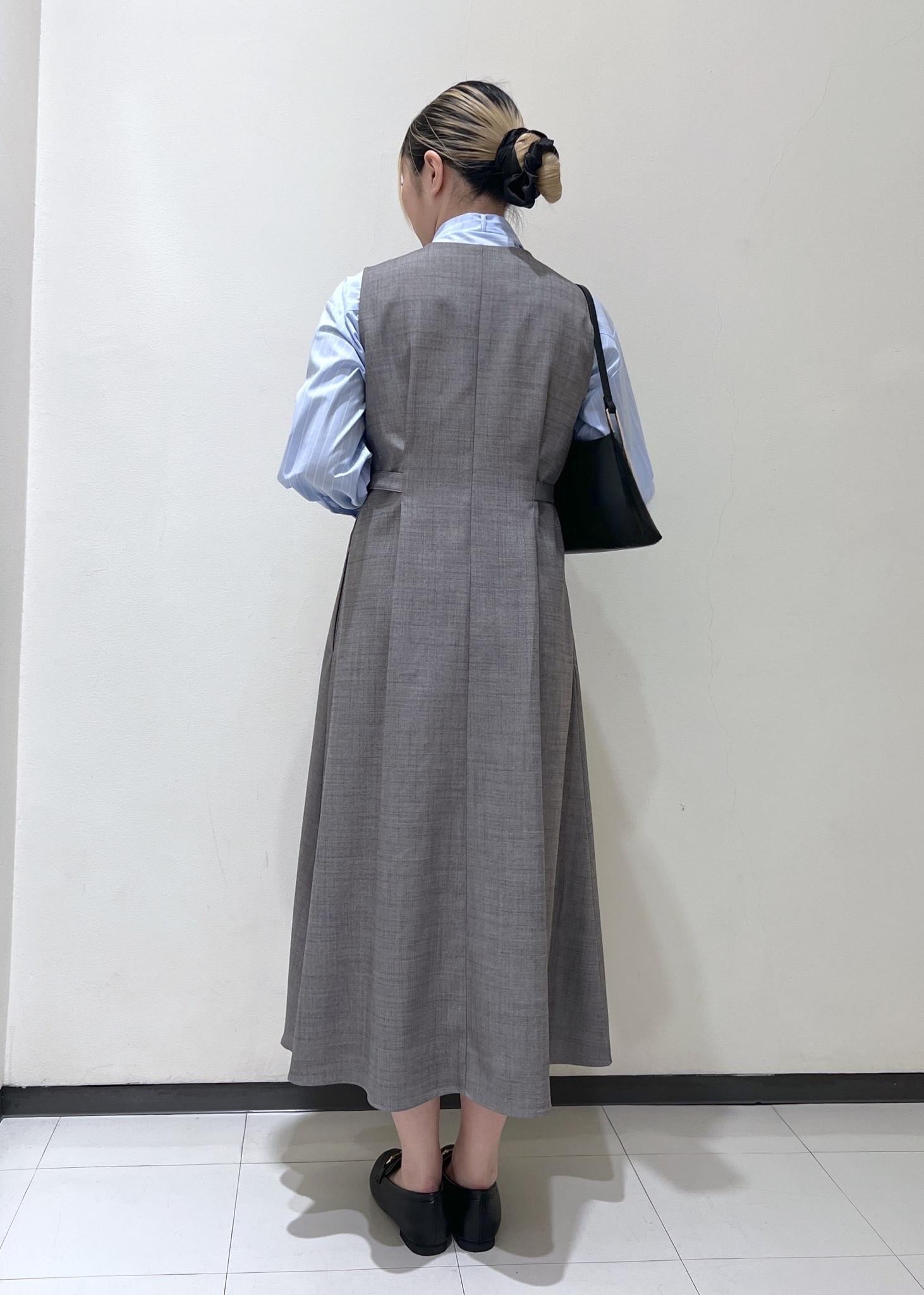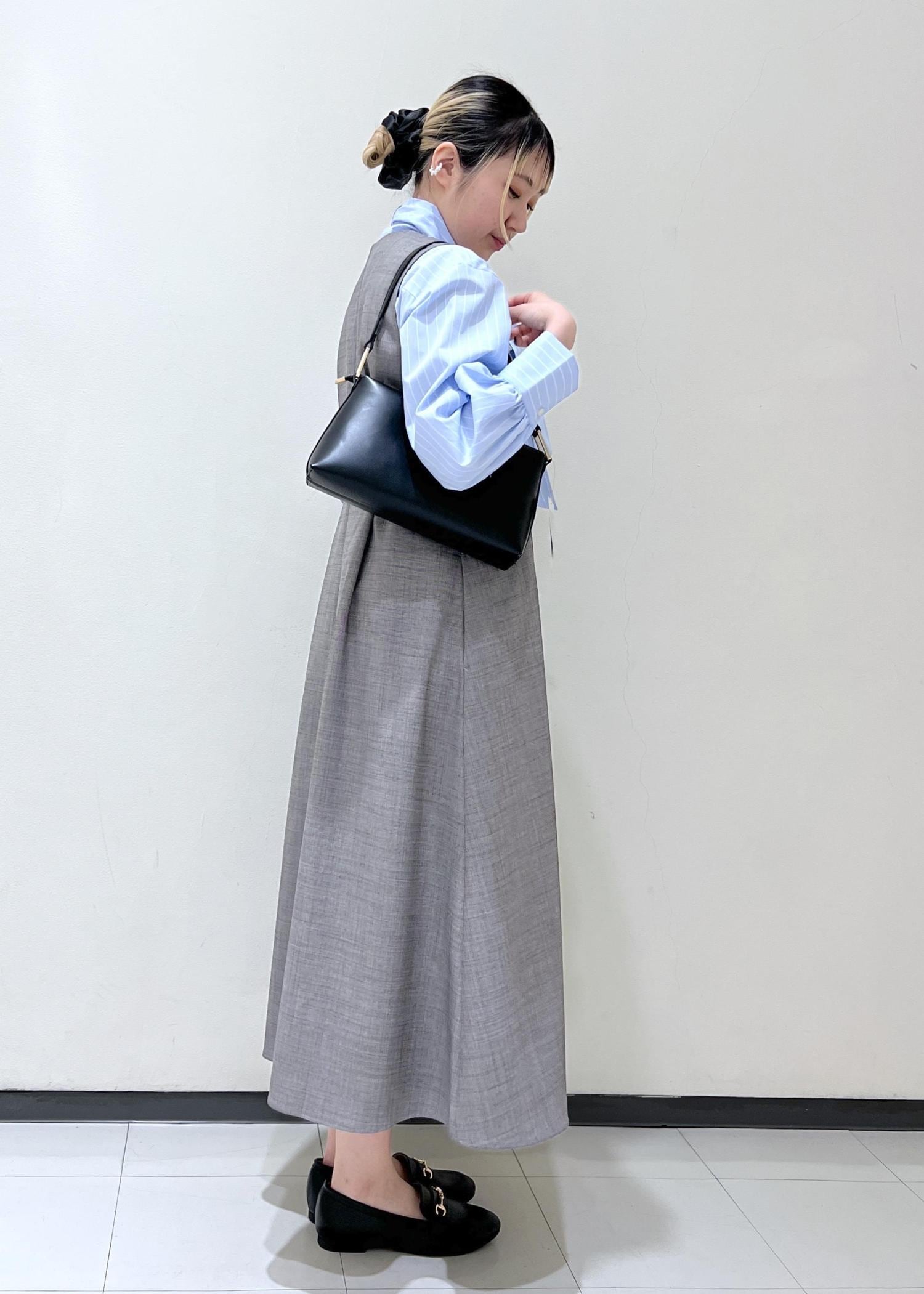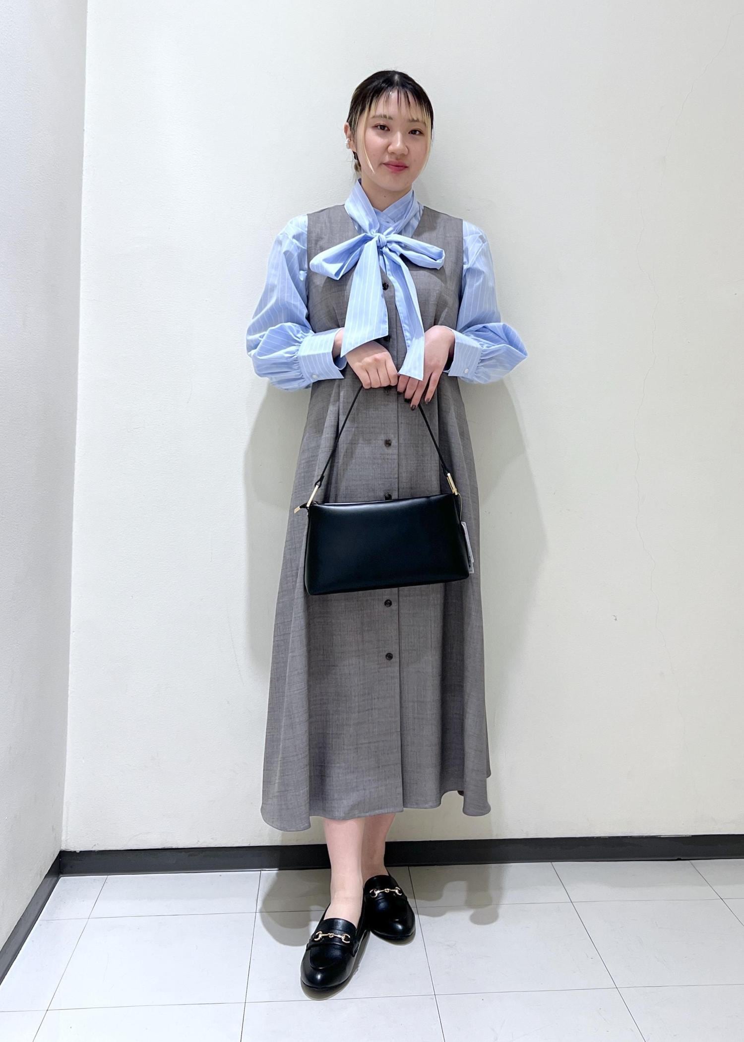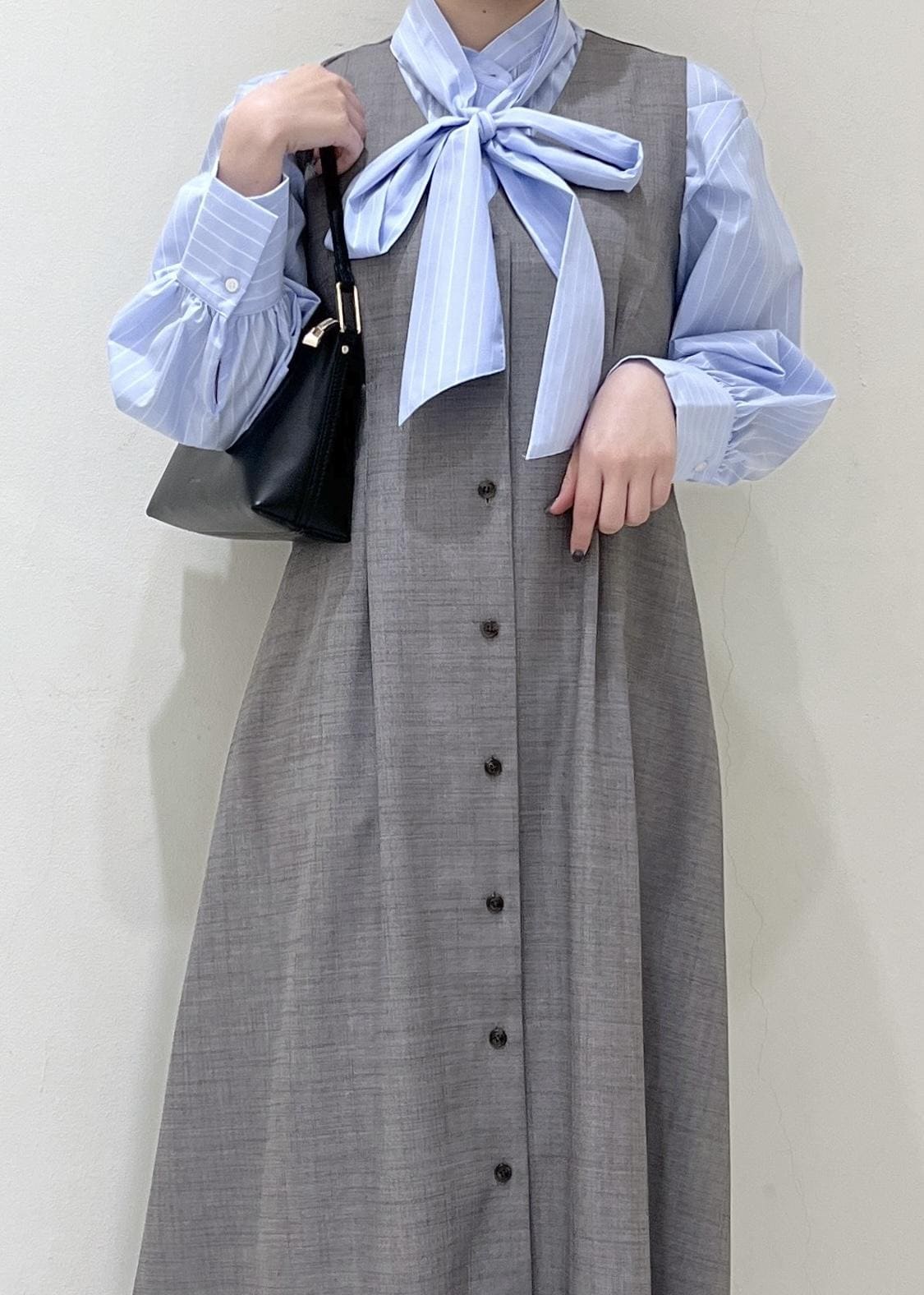 グレーのジャンパースカートと合わせると甘すぎないバランスになります。