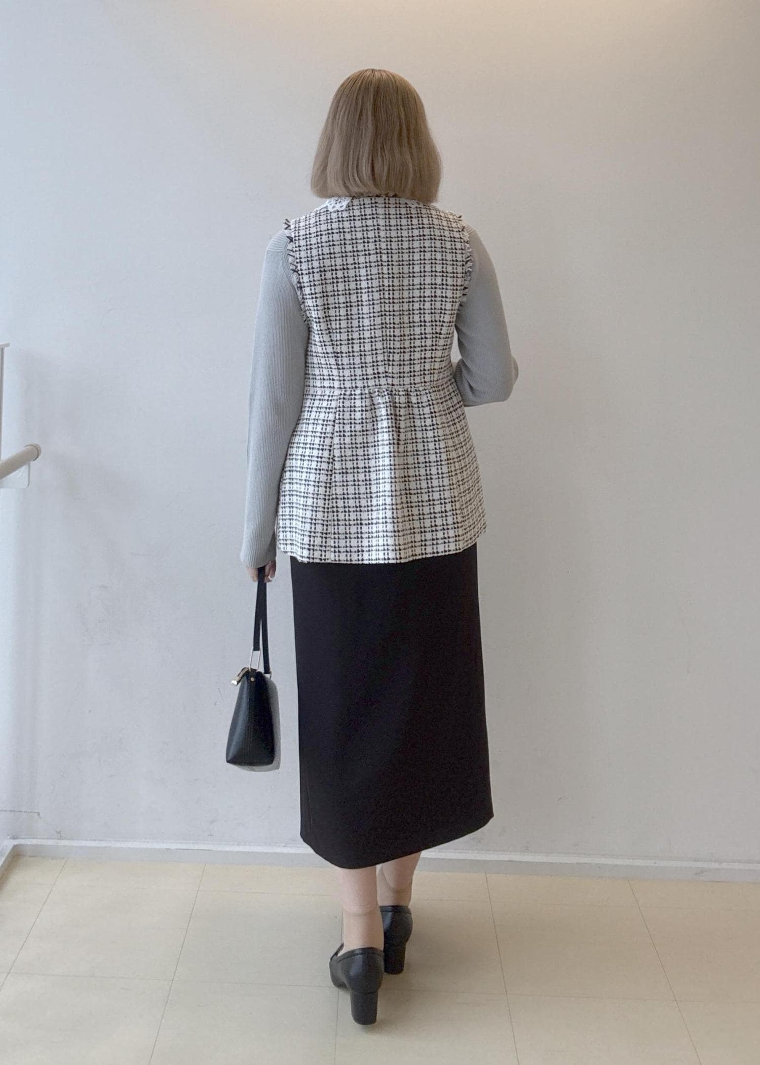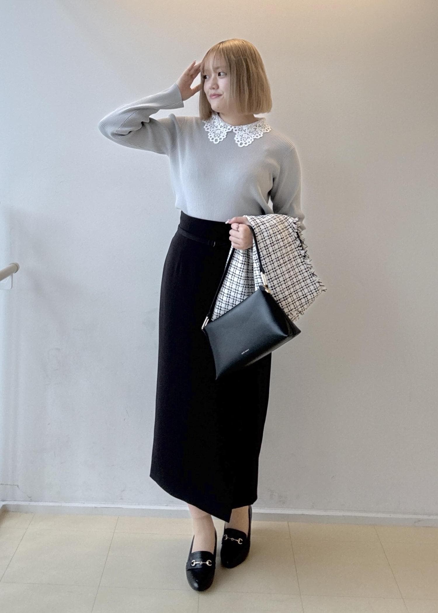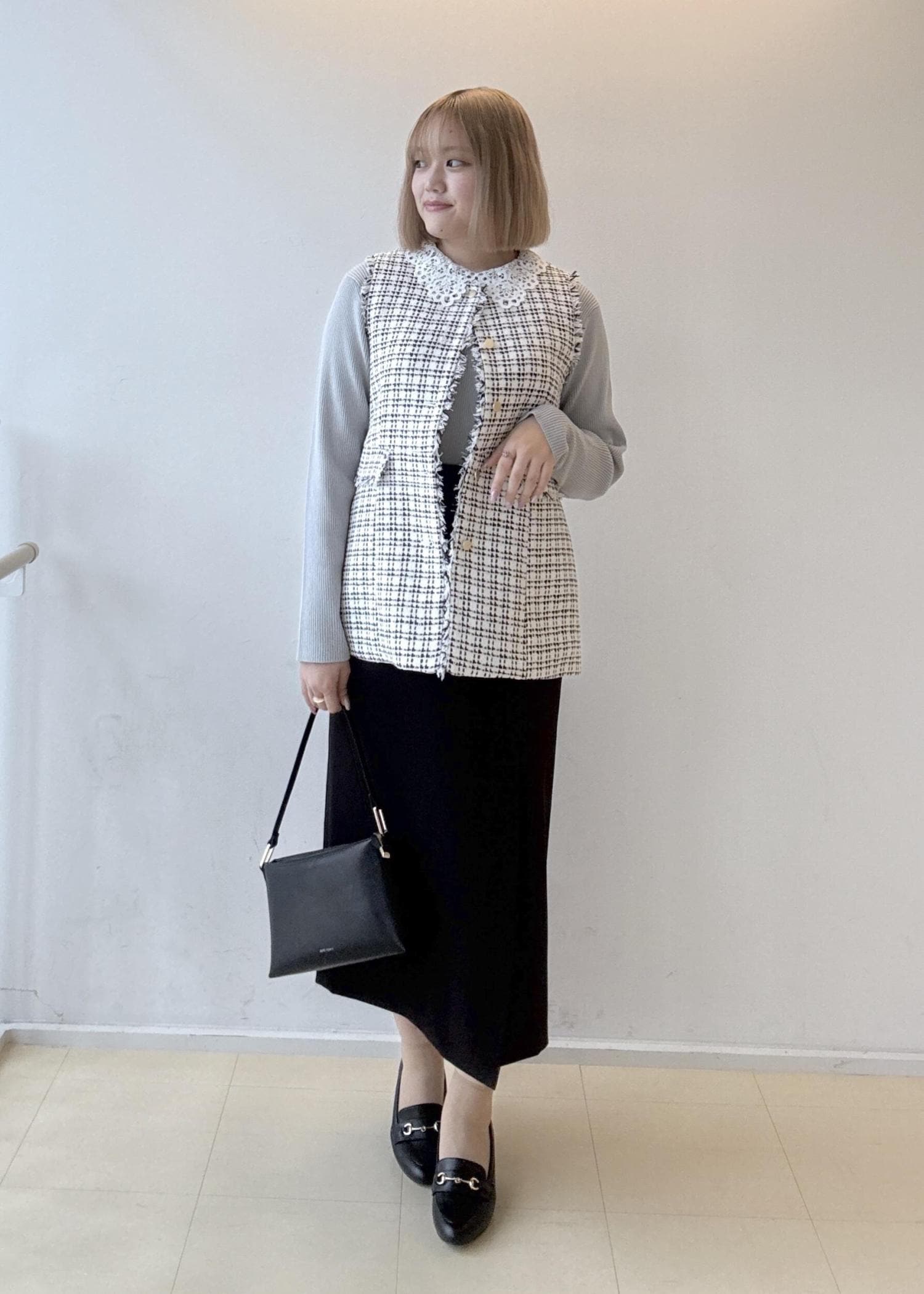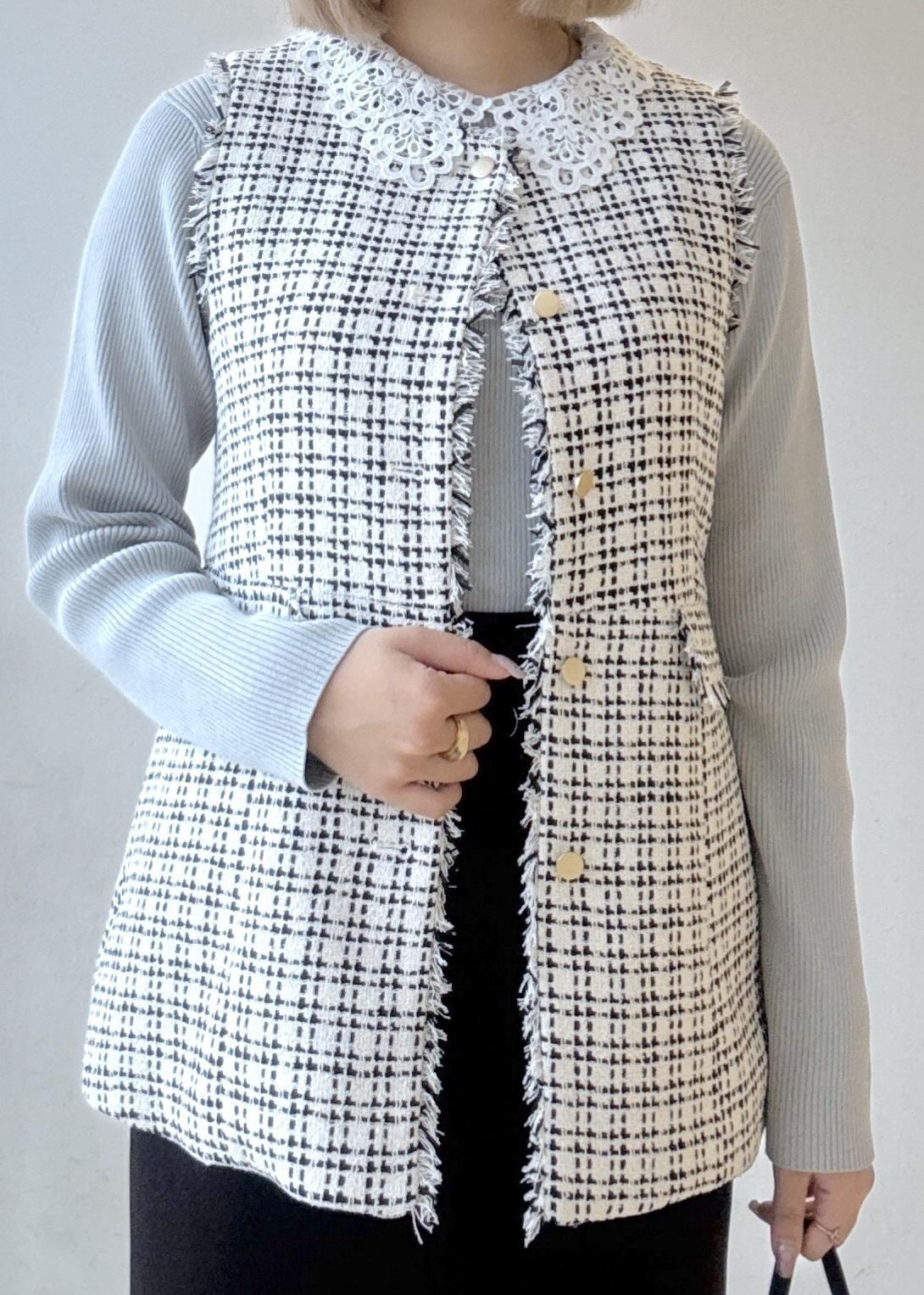レース襟のニットをインナーに使い、ジレを着ている時は襟がワンポイントになり、ジレを脱いだ時もかわいいコーディネートにしてみました!