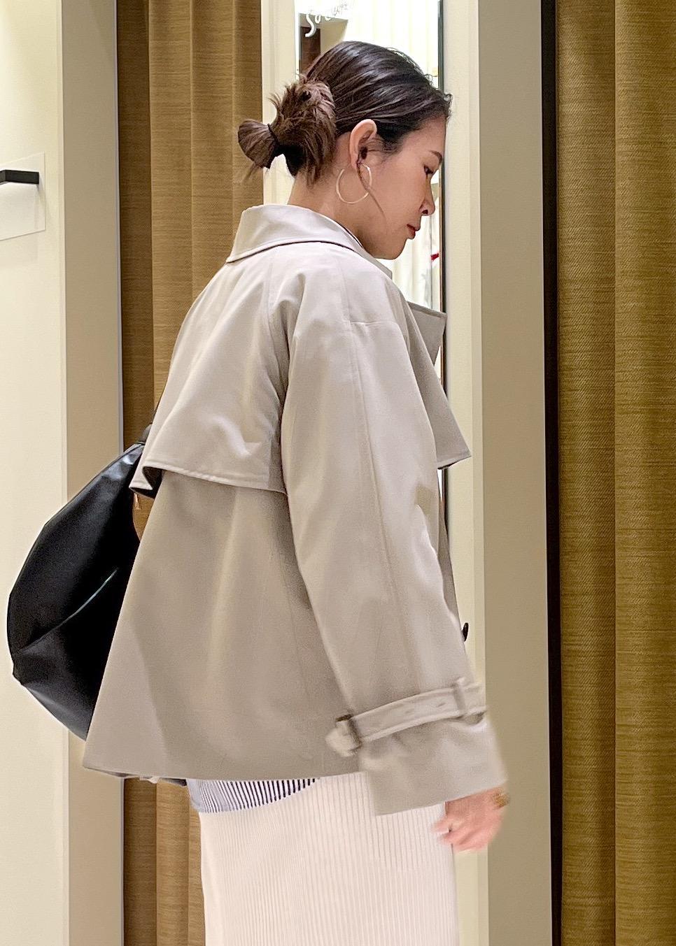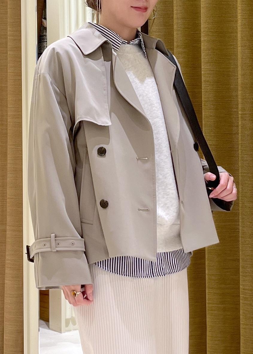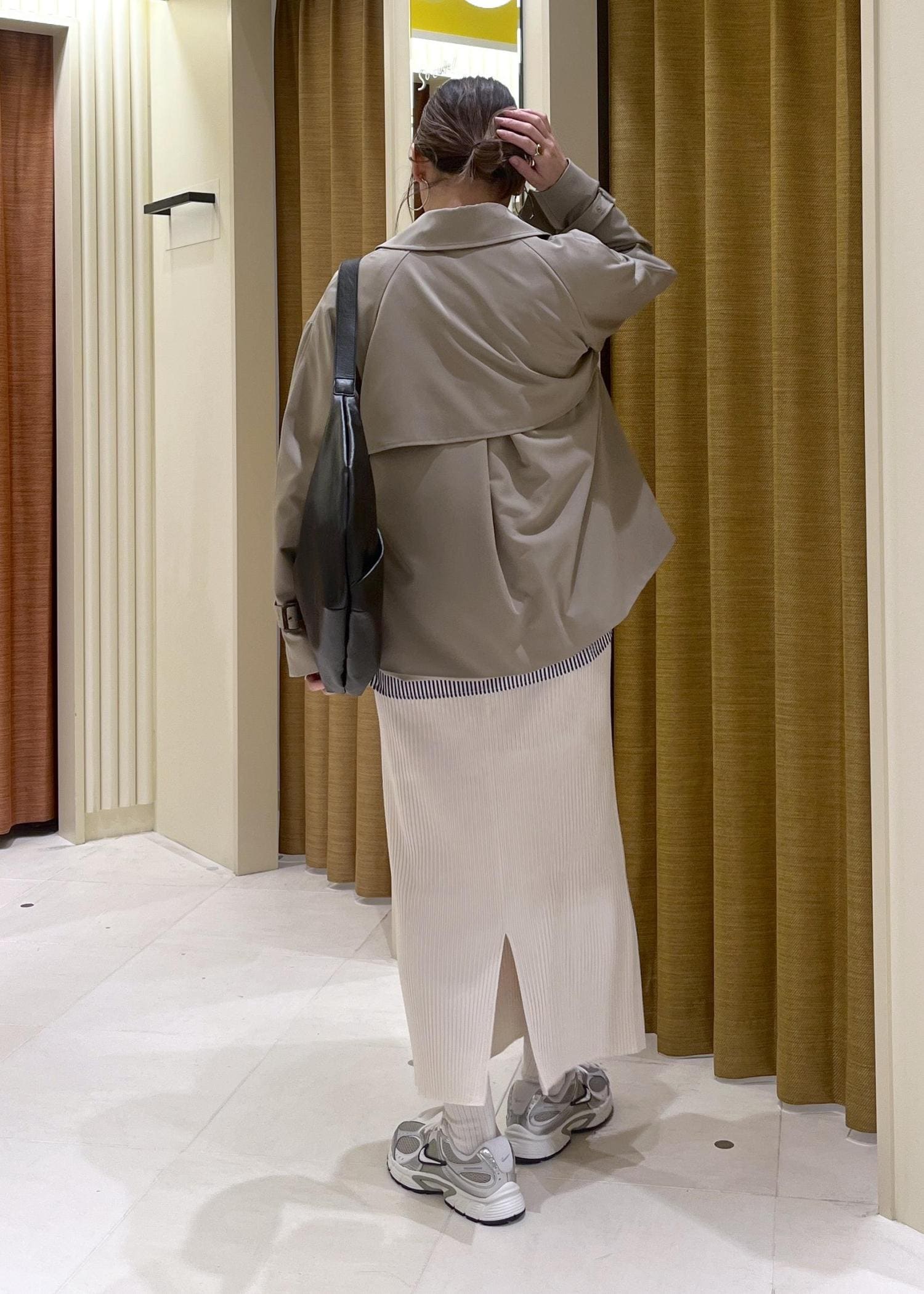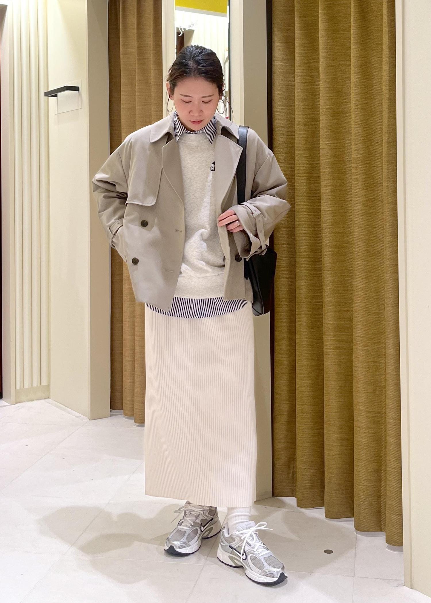 スウェットやスニーカーなど、カジュアルなアイテムと合わせたトレンチコートスタイル。