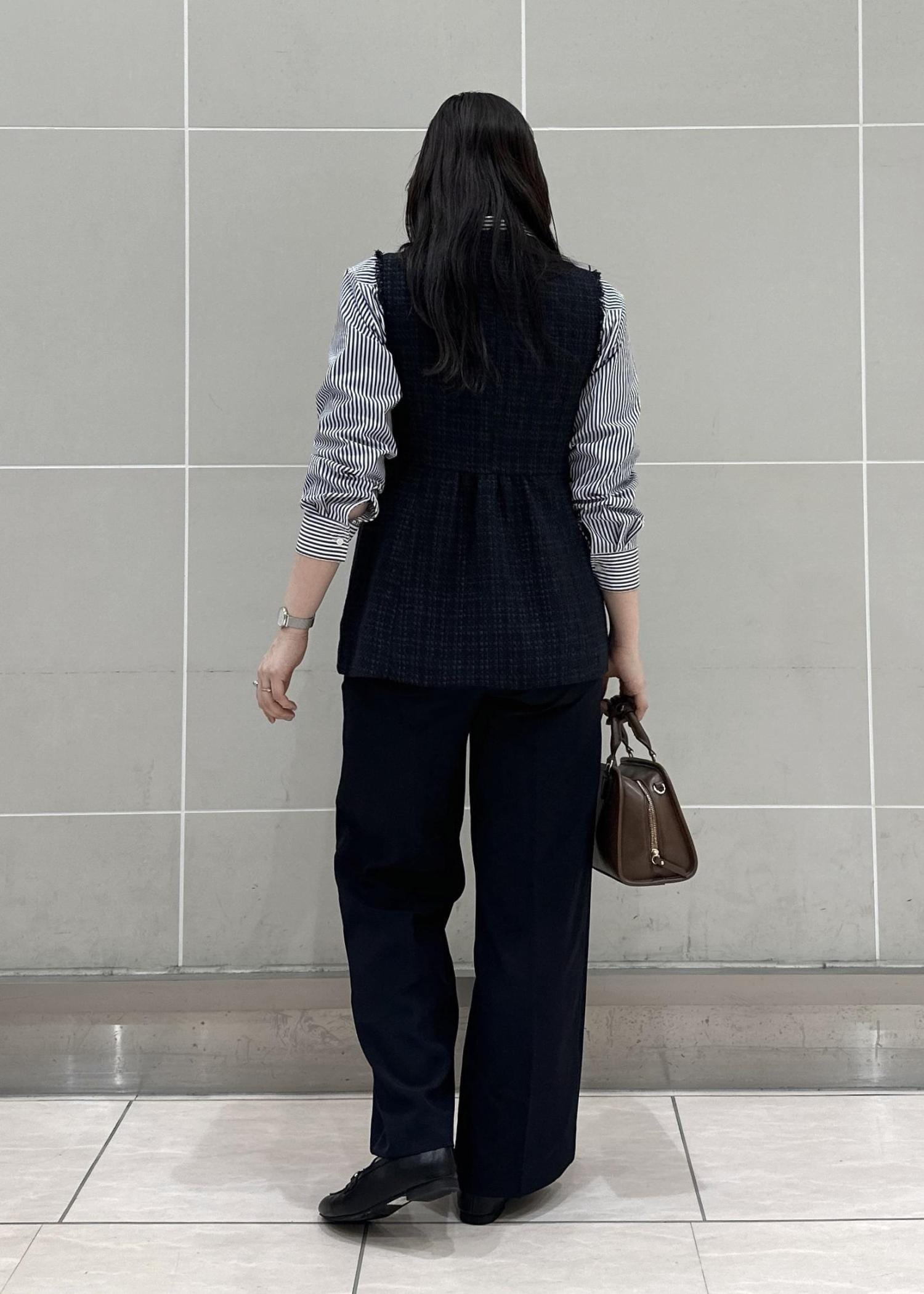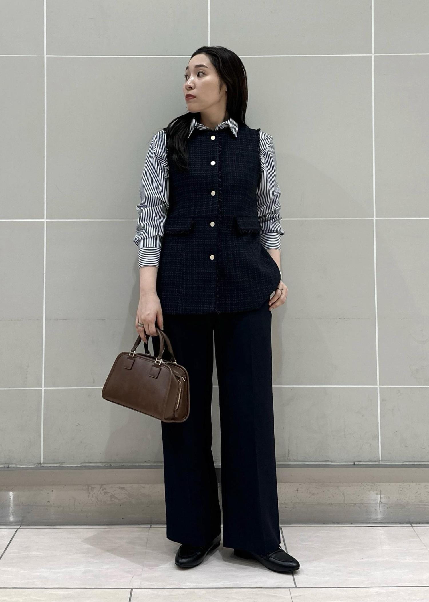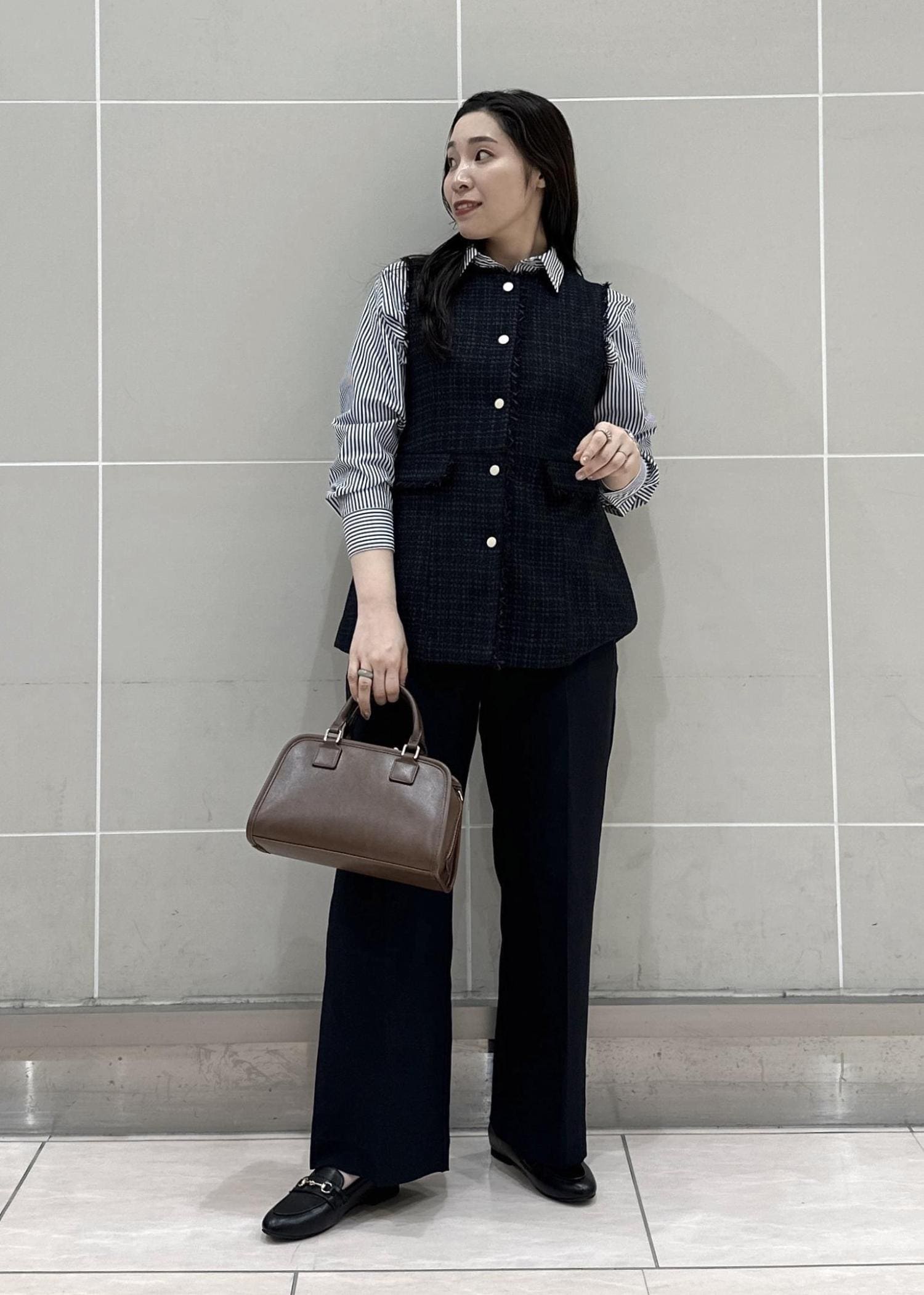 ネイビーのツイードにストライプシャツをアクセントにしました。パンツはツイードと同じネイビーで大人っぽくまとめました。