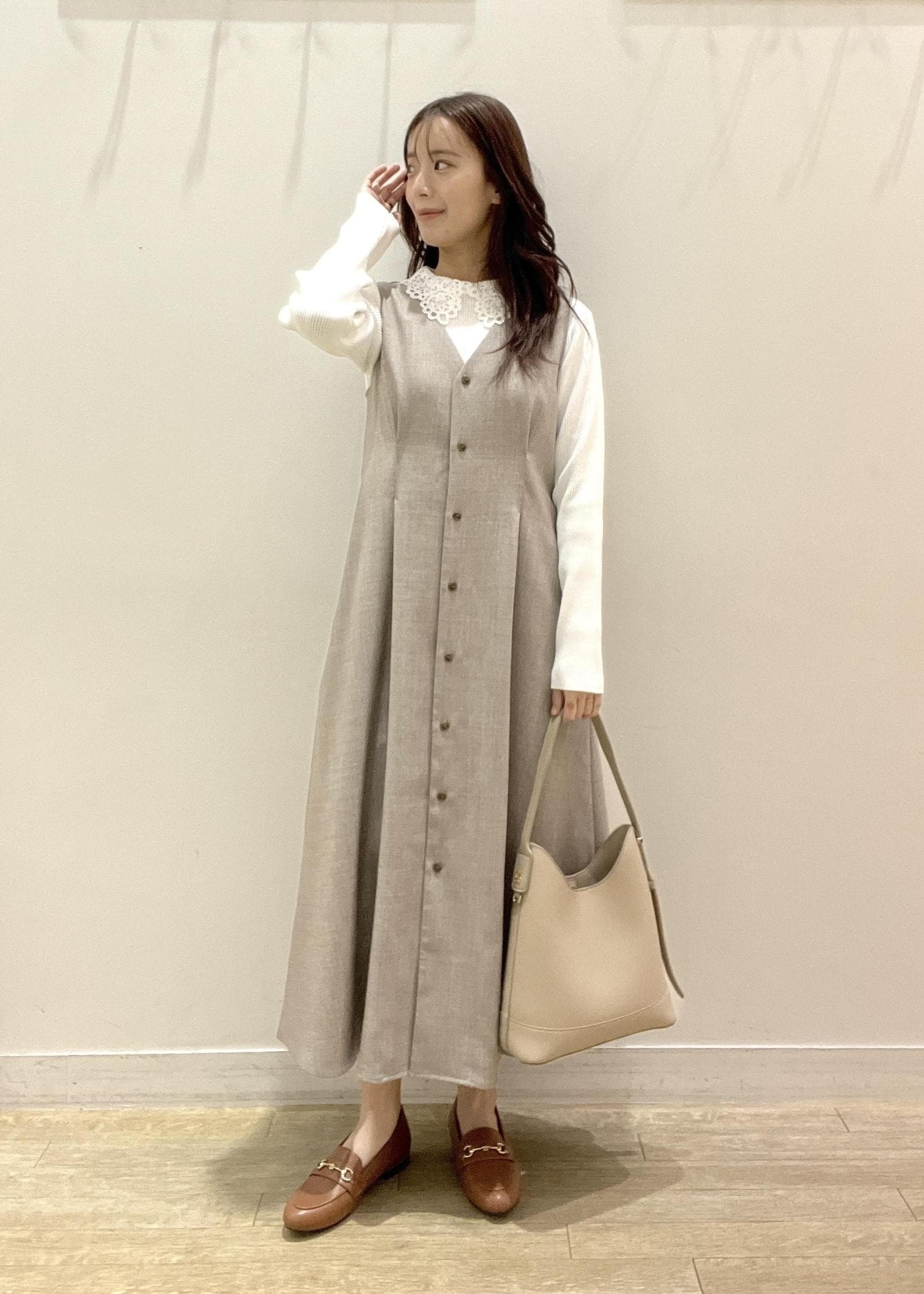 淡色でまとめた上品レイヤードコーデを組んでみました。