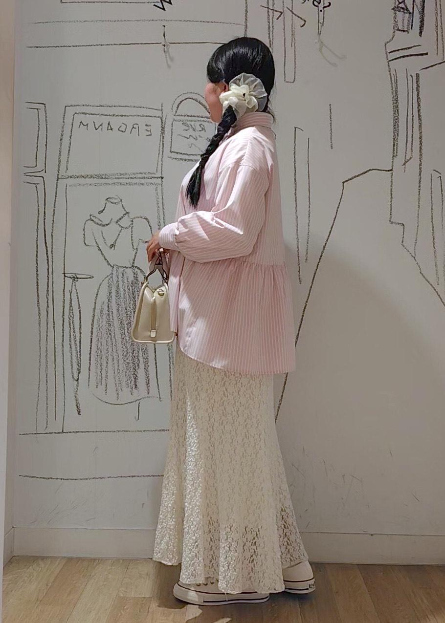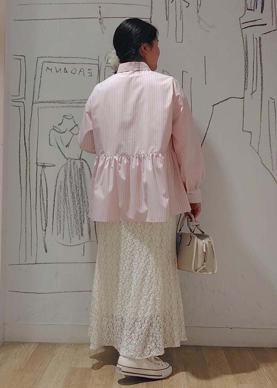 ピンクのフレアシャツをメインにカジュアルコーデを組みました。