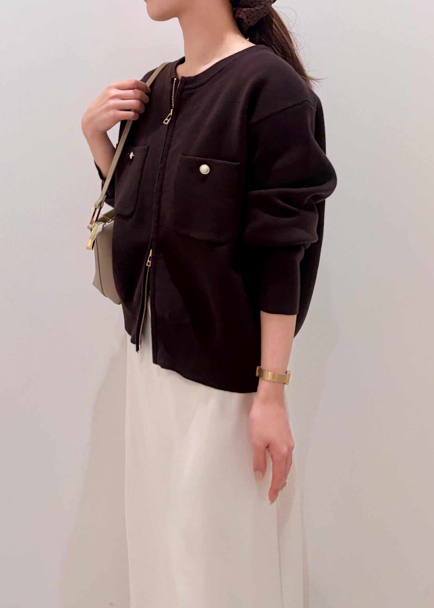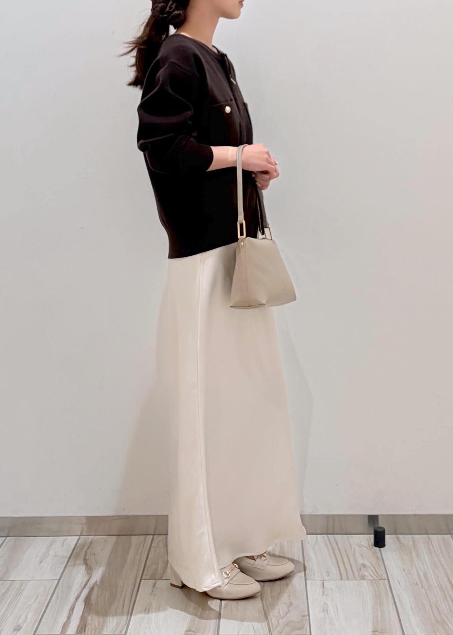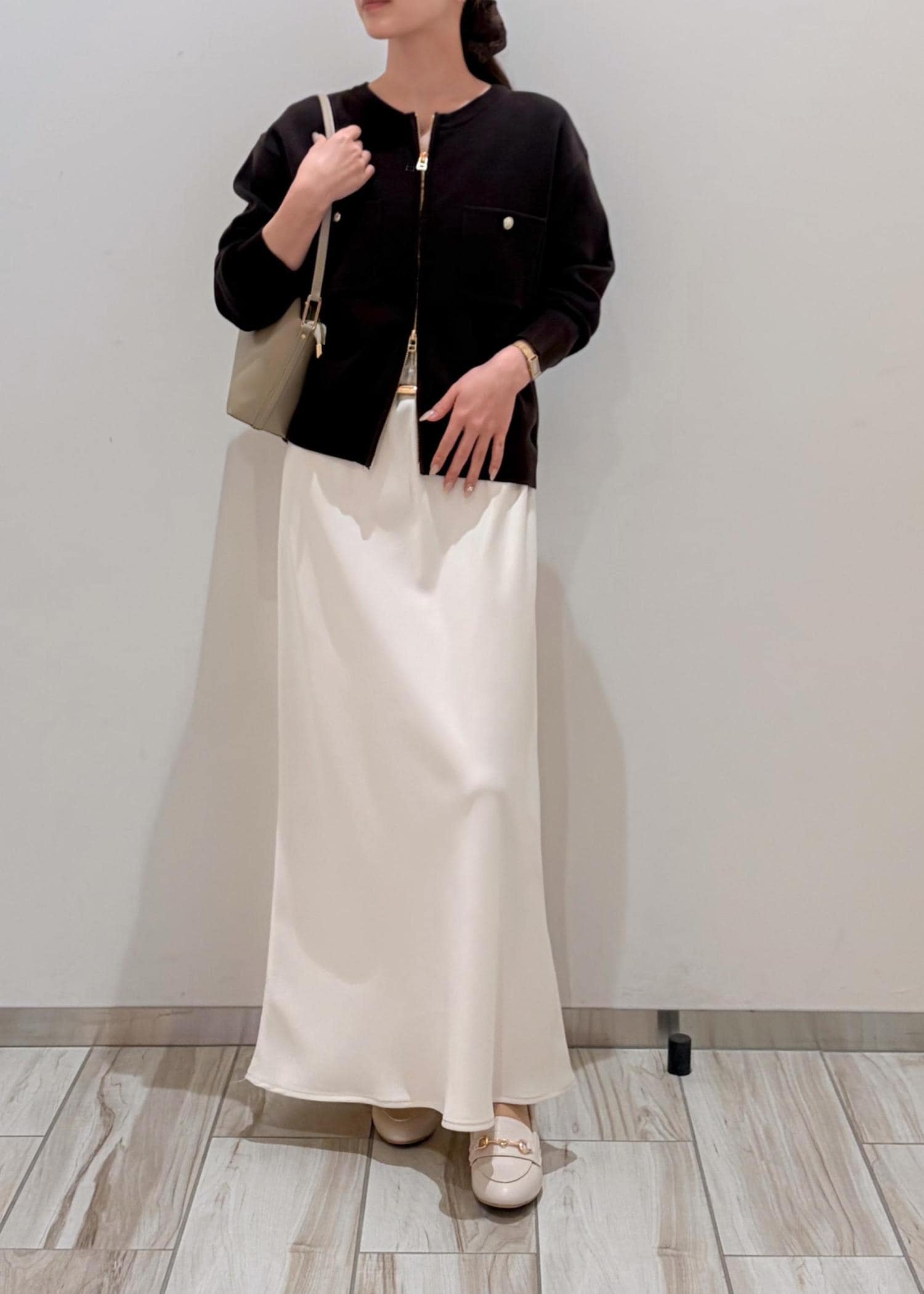 綺麗め寄りにも、カジュアル寄りにもどちらのテイストでも楽しめるジップカーディガン。サテン系のスカートと組み合わせ、綺麗めに着てみました。高めのヒール×小物で上品さをプラス。