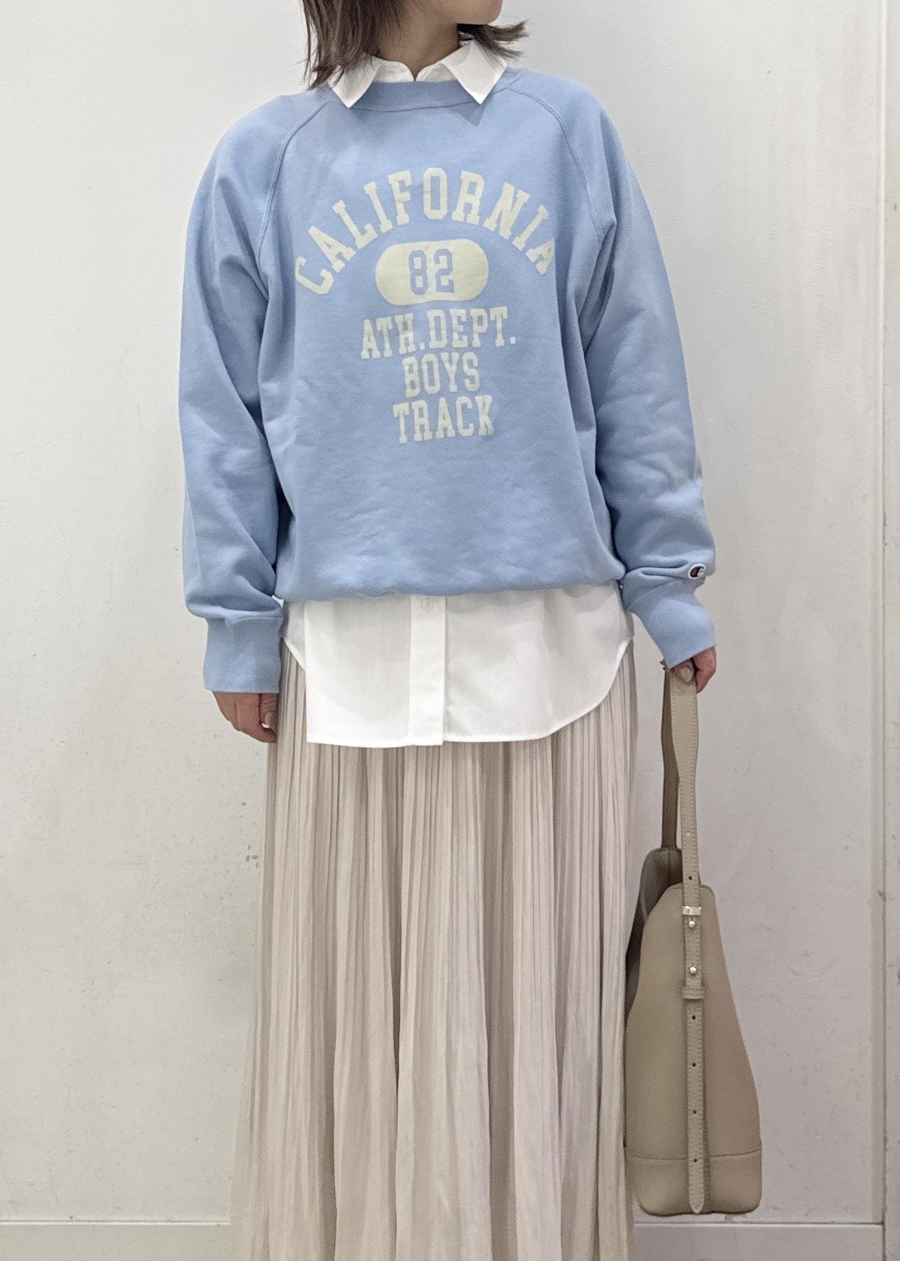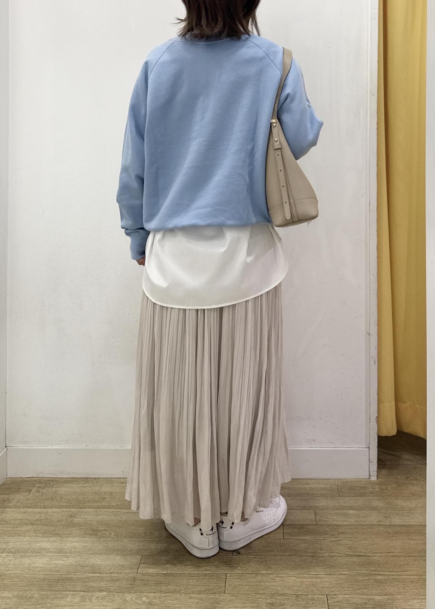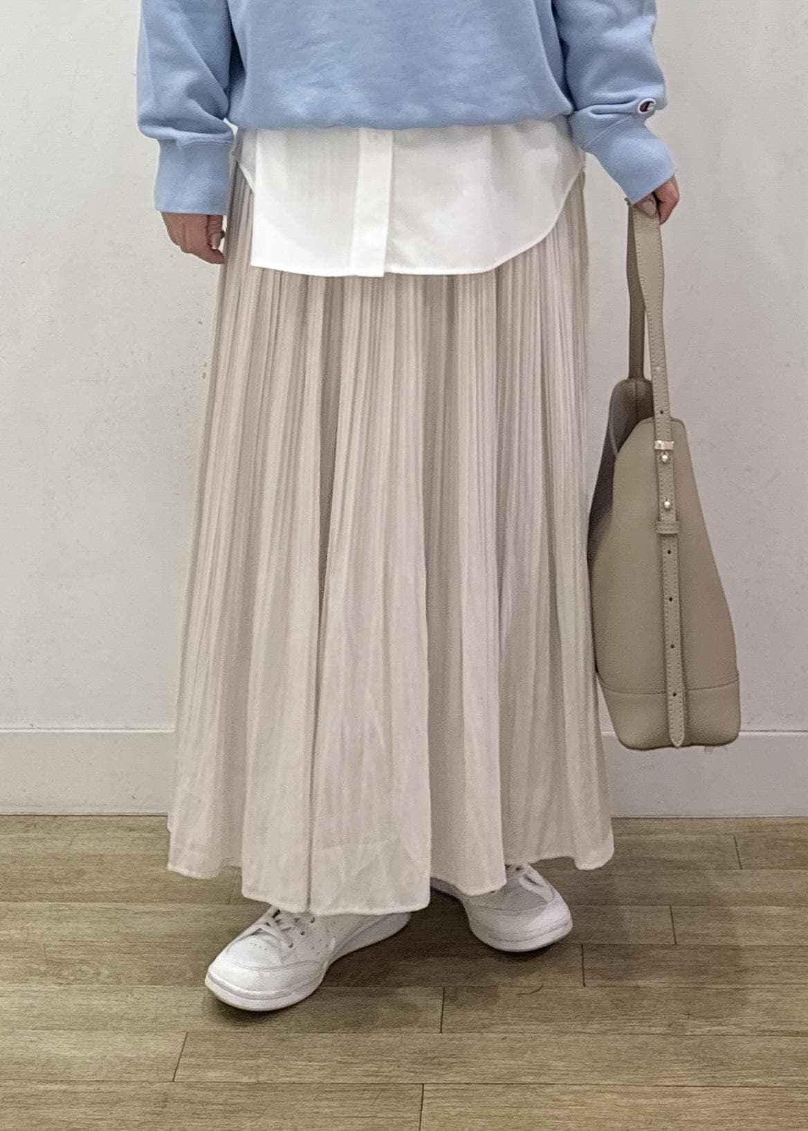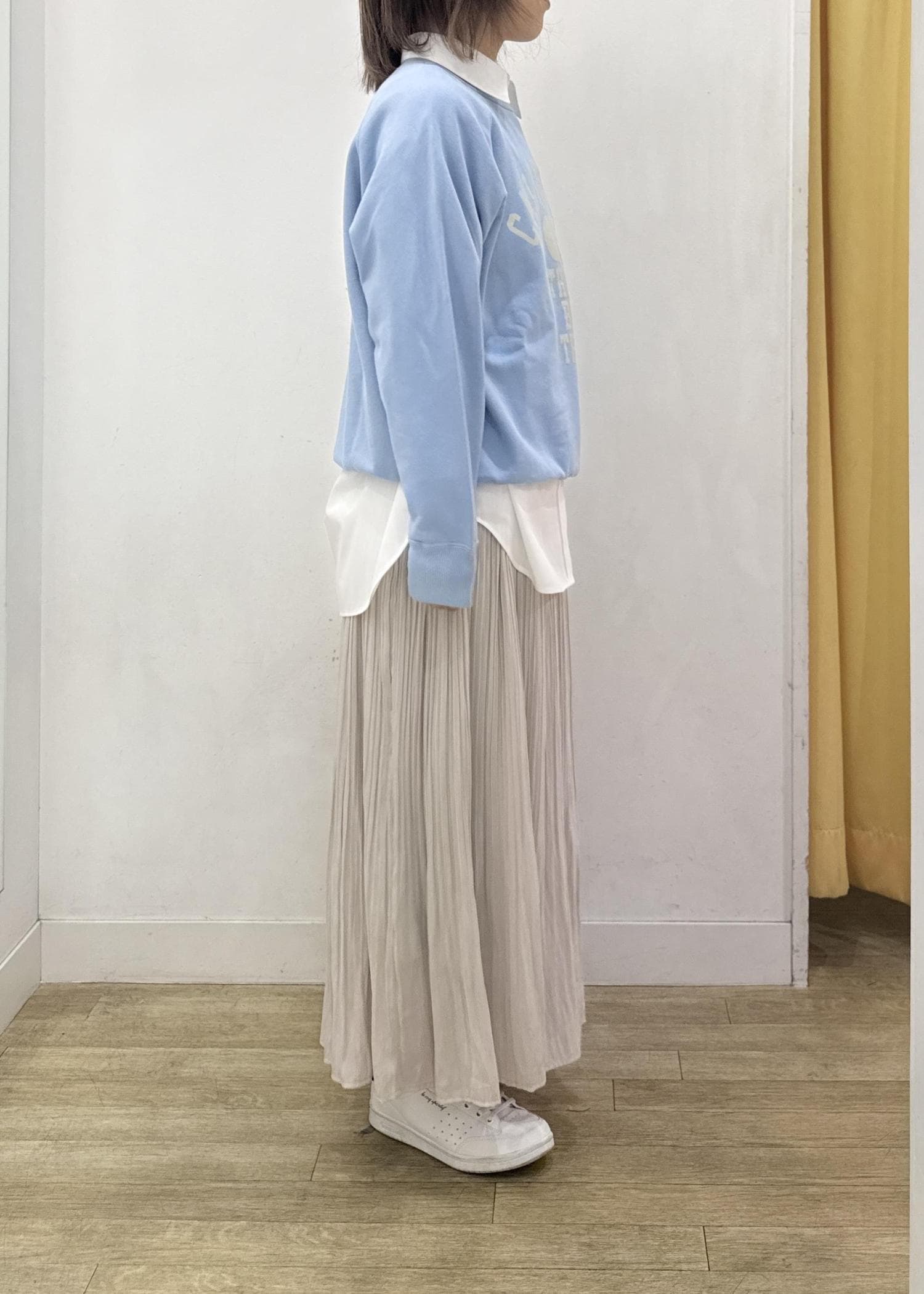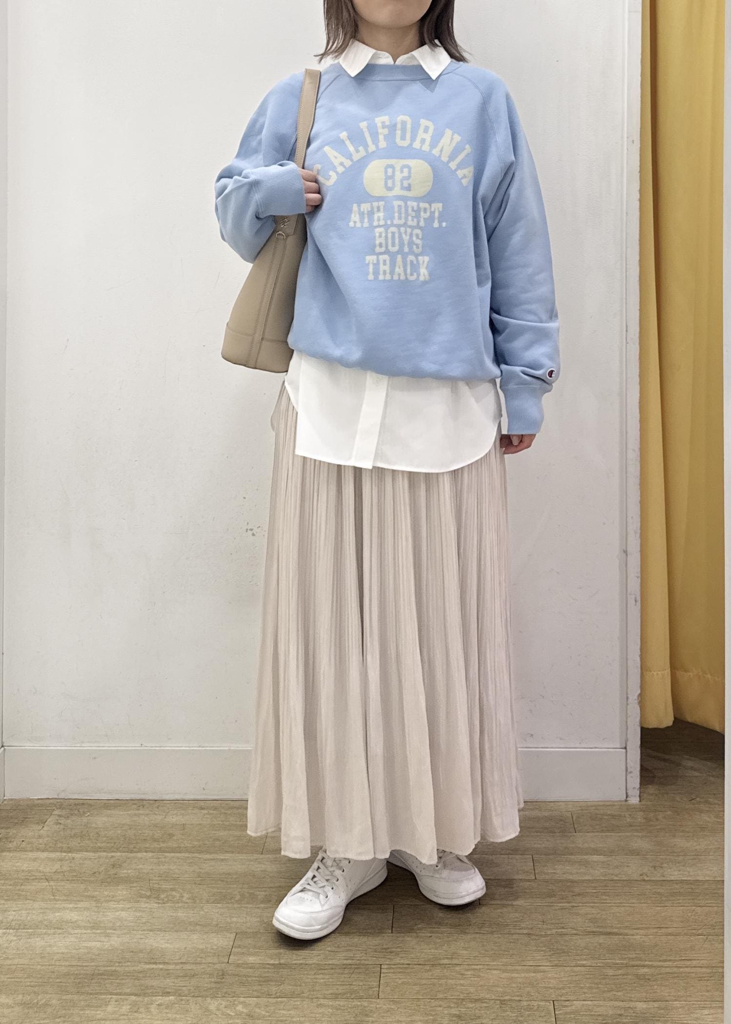 カジュアルなトップスにプリーツスカートを合わせて、女性らしい雰囲気もプラスするのがポイント☺︎