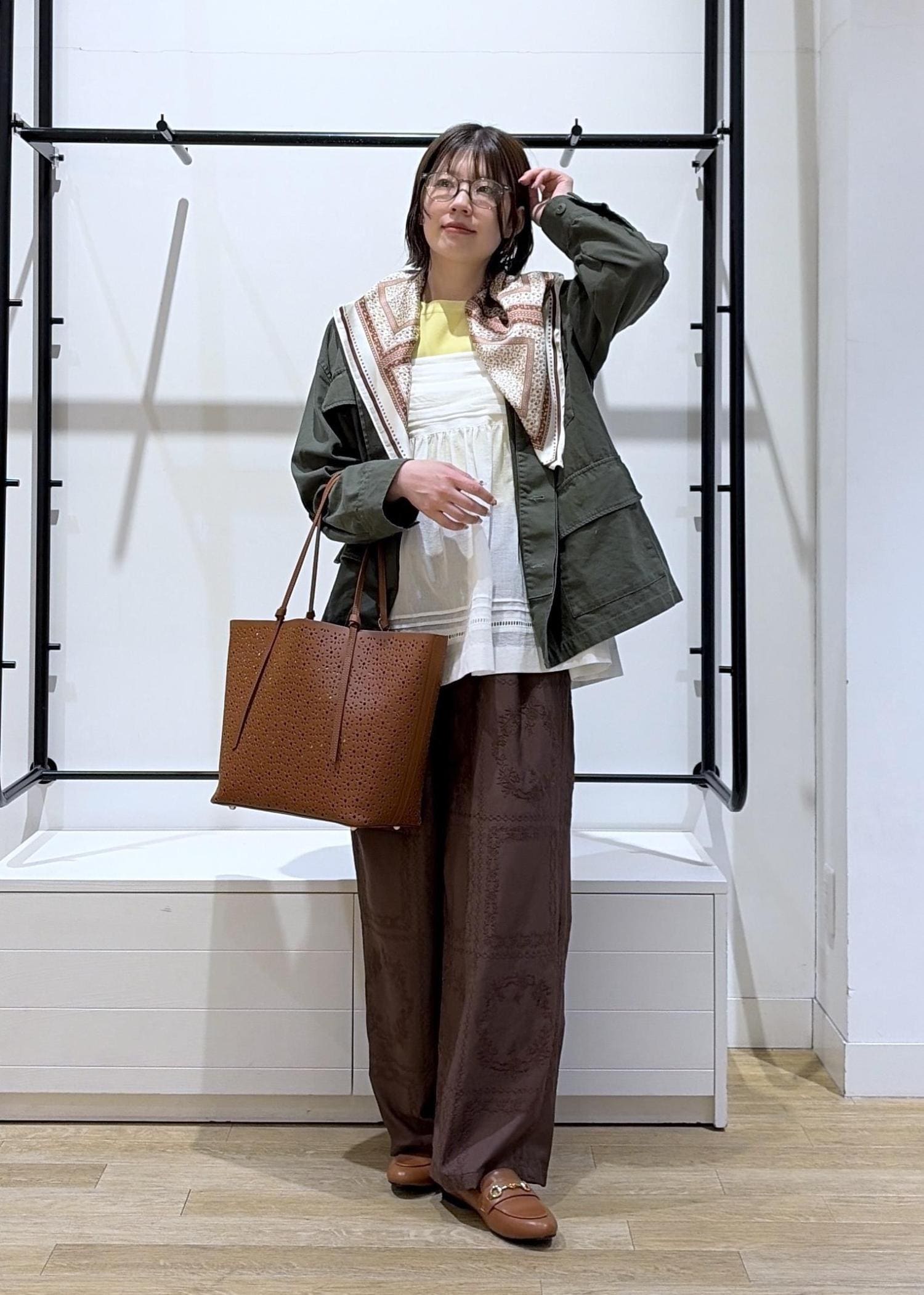 フワッと広がるカタチなので、インナーやボトムスはすっきりタイプを選ぶと◎です! -