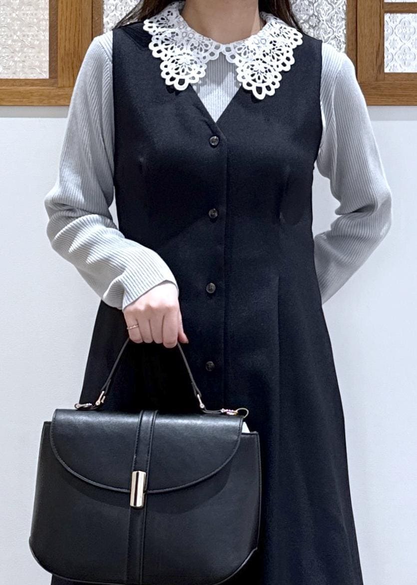 綺麗見えするネイビーのワンピースに、レースカラーが特徴のトップスを合わせたコーディネートです。