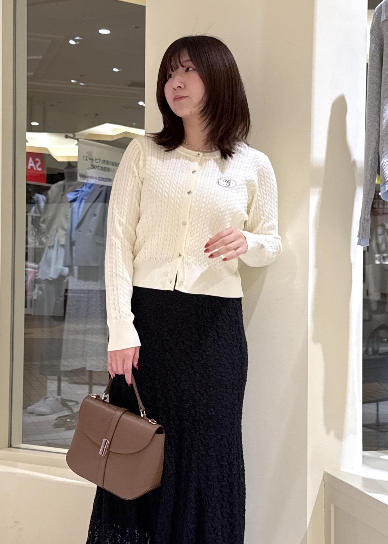 ハローキティのカーディガンにレーススカートで大人フェミニンスタイルで、オンオフどちらでも使えるコーデに。