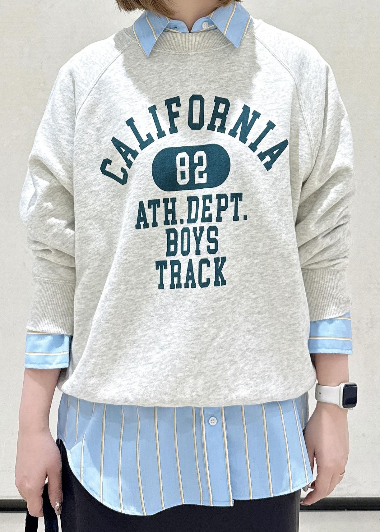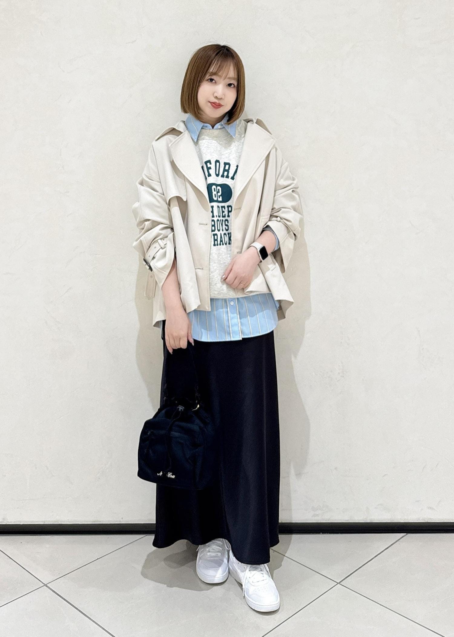 スウェットにシャツをレイヤードし、サテンスカートを合わせてカジュアルになりすぎないようにしました。