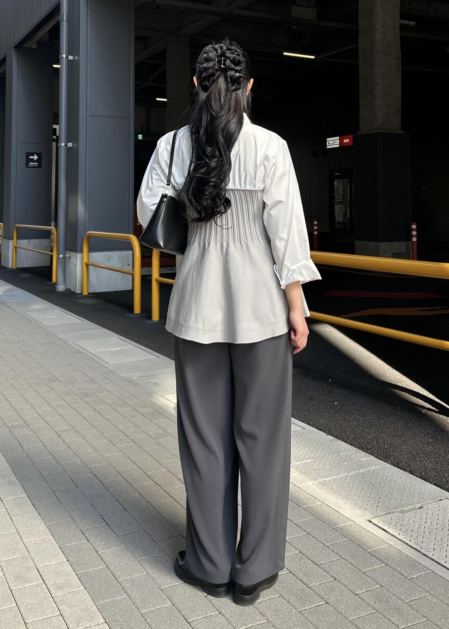 ボトムは落ち感のあるグレーのワイドパンツを合わせて、